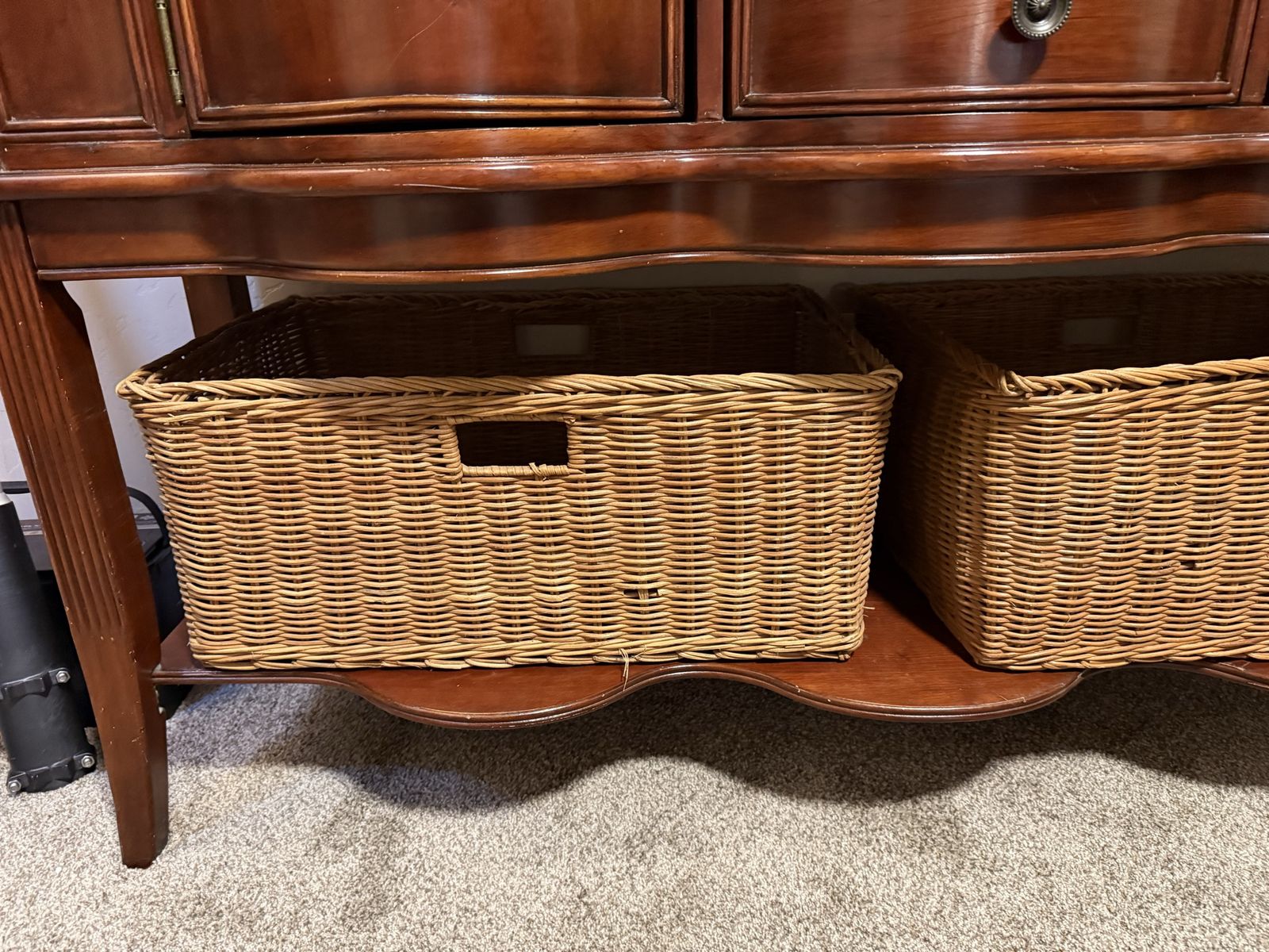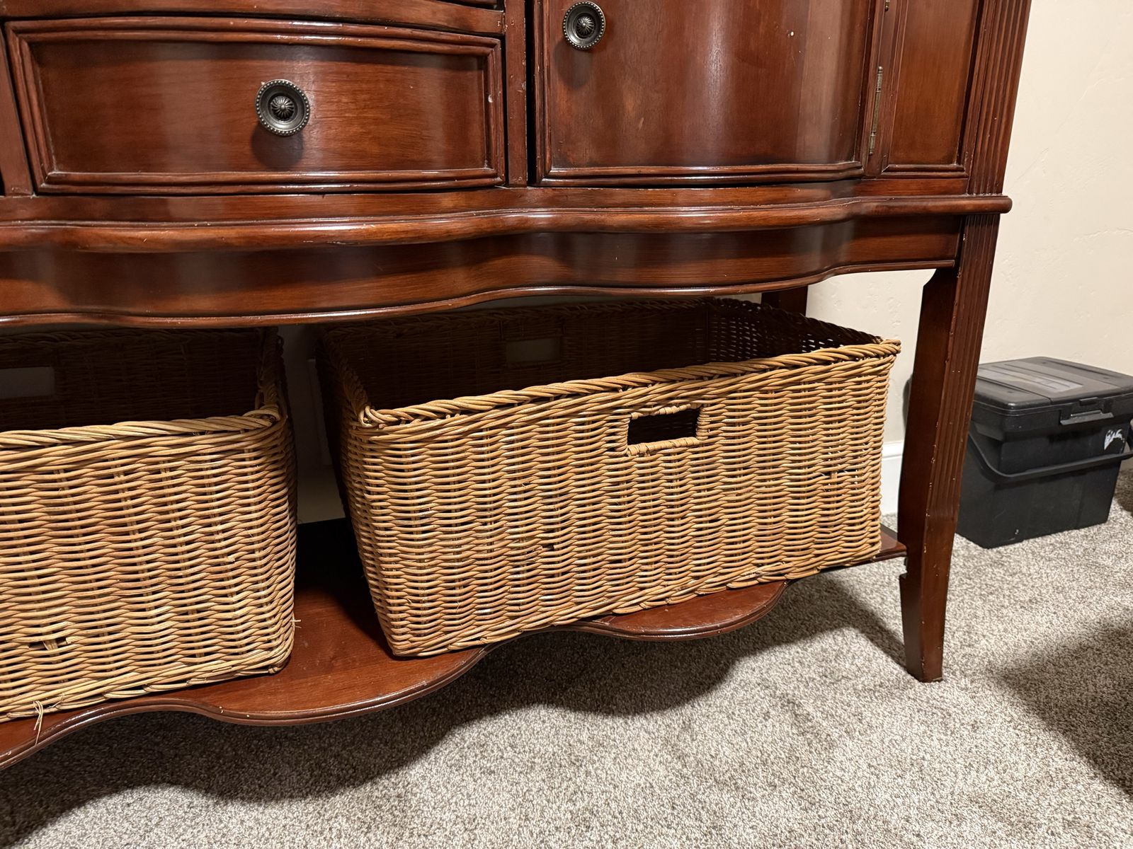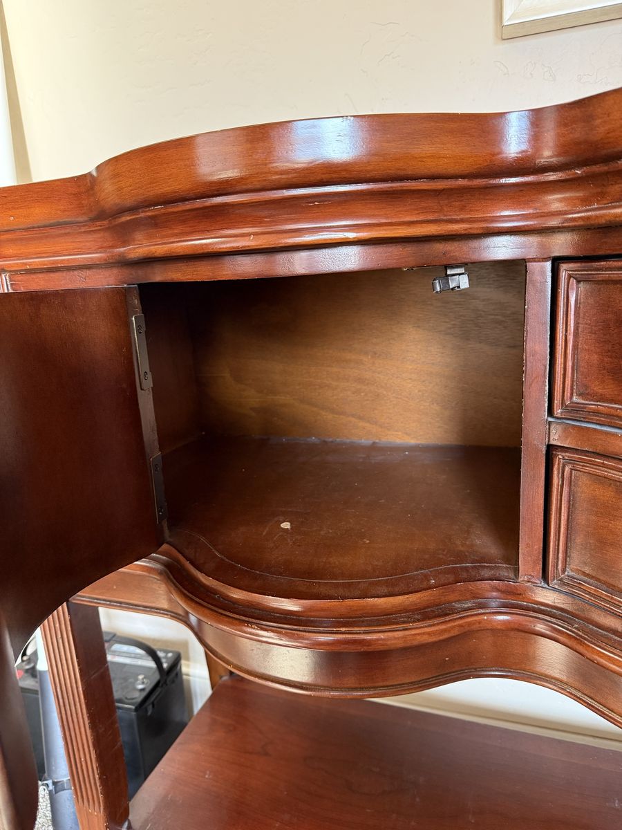 Details • Solid, sturdy construction • Two center drawers • Two cabinet doors with interior storage (the left cabinet doesn't latch anymore, but stays closed on it's own). • Large bottom shelf for extra storage or décor • Good condition with minor normal wear
