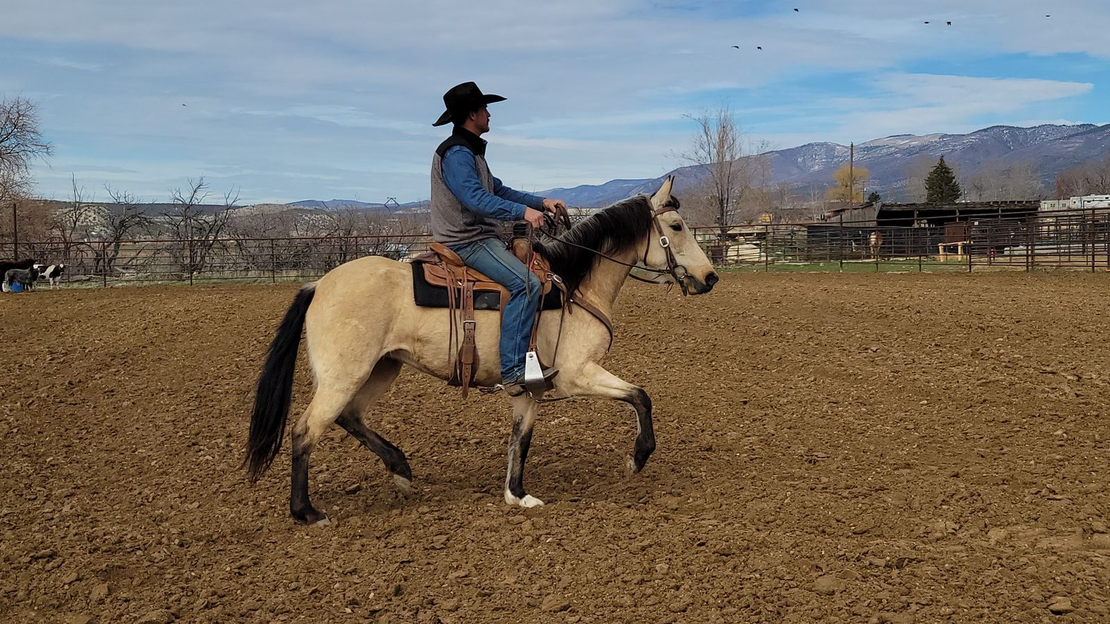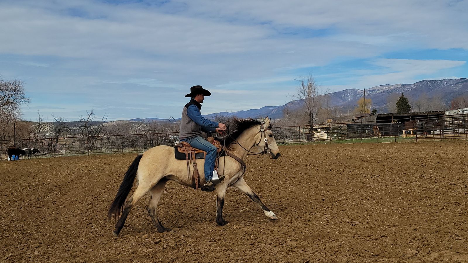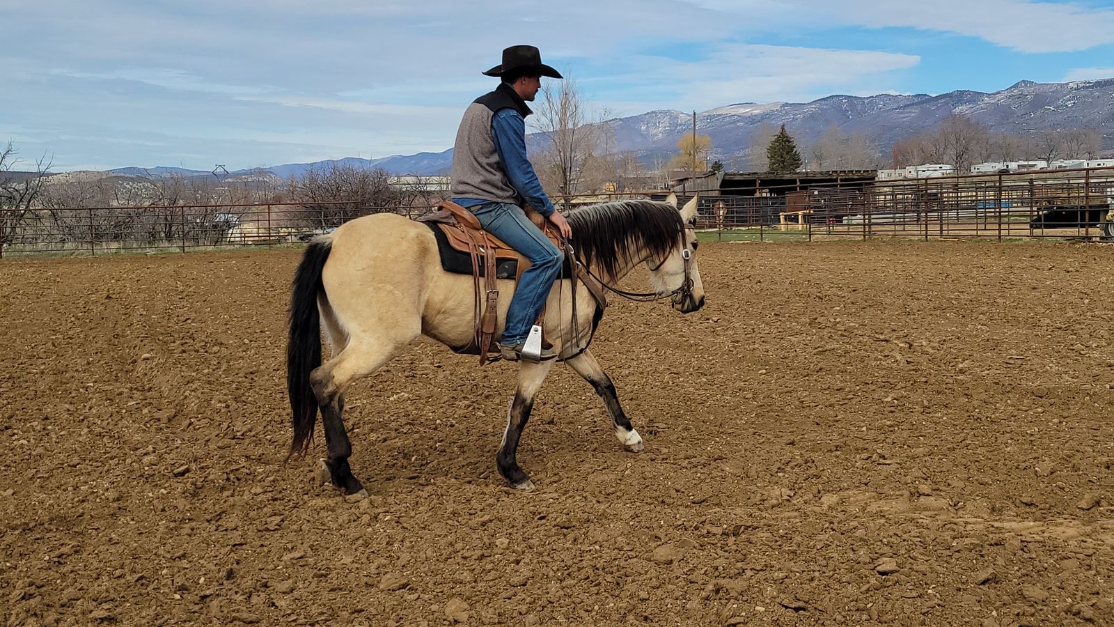 She is started under saddle and is quiet and eager to please. Buttercup moves beautifully and is smooth to ride. Walks, trots, lopes both directions, descent stop, backs. She is pretty laid back but not a dead head. She has had a few rides in the foothills, down the road, and has been ridden in a creek. Has been ridden bareback. Has been around cows. Trainer loved her. Said she was a born broke type. I lead my kids on her bareback sometimes, now that i feel like she is too pregnant to really ride. Very sweet mare. Absolutely loves attention. She has been good for the farrier.