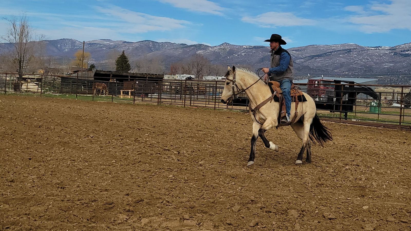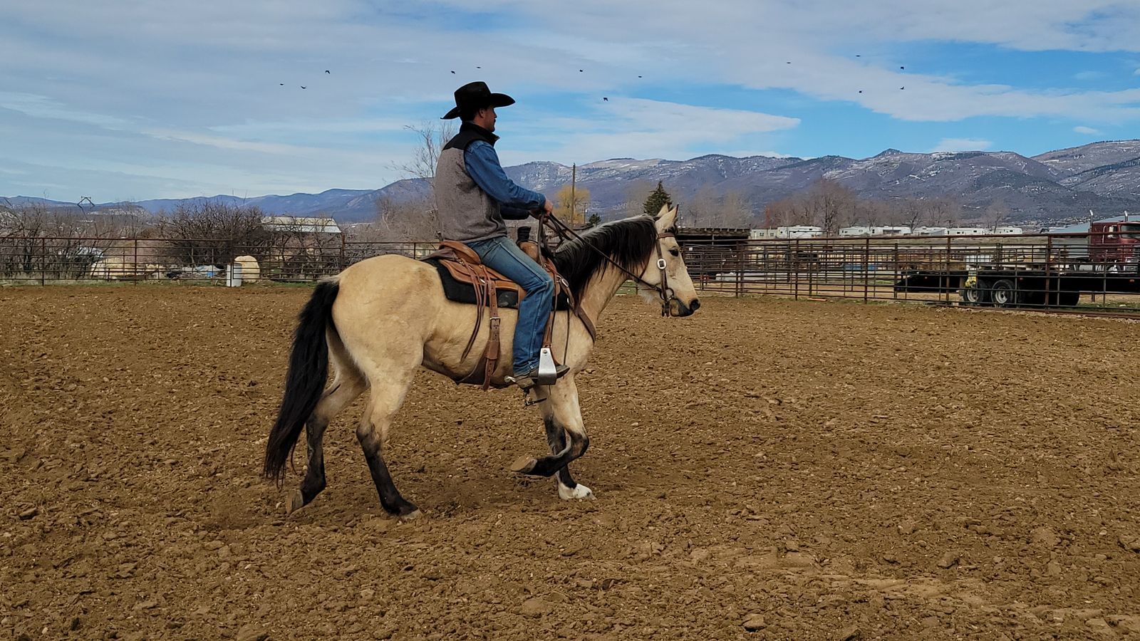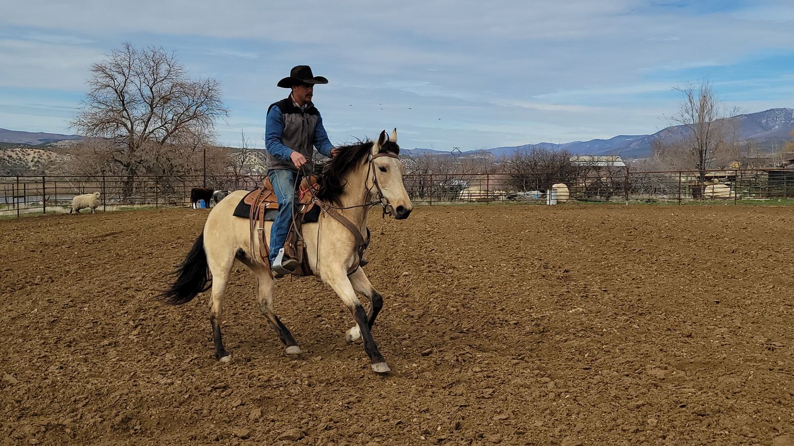 She is started under saddle and is quiet and eager to please. Buttercup moves beautifully and is smooth to ride. Walks, trots, lopes both directions, descent stop, backs. She is pretty laid back but not a dead head. She has had a few rides in the foothills, down the road, and has been ridden in a creek. Has been ridden bareback. Has been around cows. Trainer loved her. Said she was a born broke type. I lead my kids on her bareback sometimes, now that i feel like she is too pregnant to really ride. Very sweet mare. Absolutely loves attention. She has been good for the farrier.