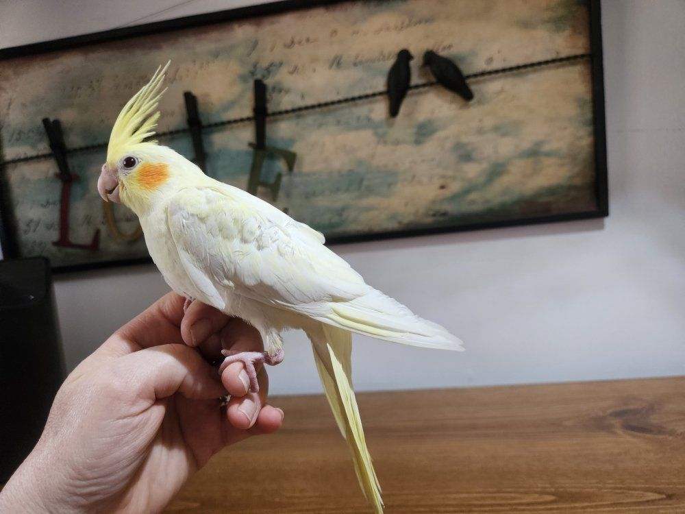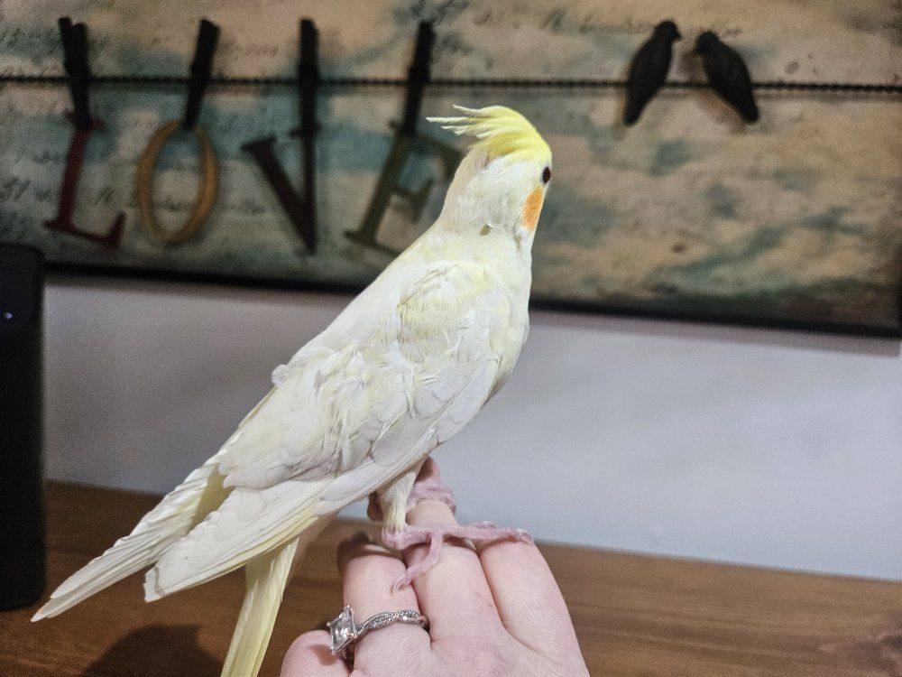 Beautiful 2 month old baby Lutino Cockatiel is ready for a good home. Was hand fed and now eating good on its own. Is very tame and will sit on your hand. I am unsure of the gender.