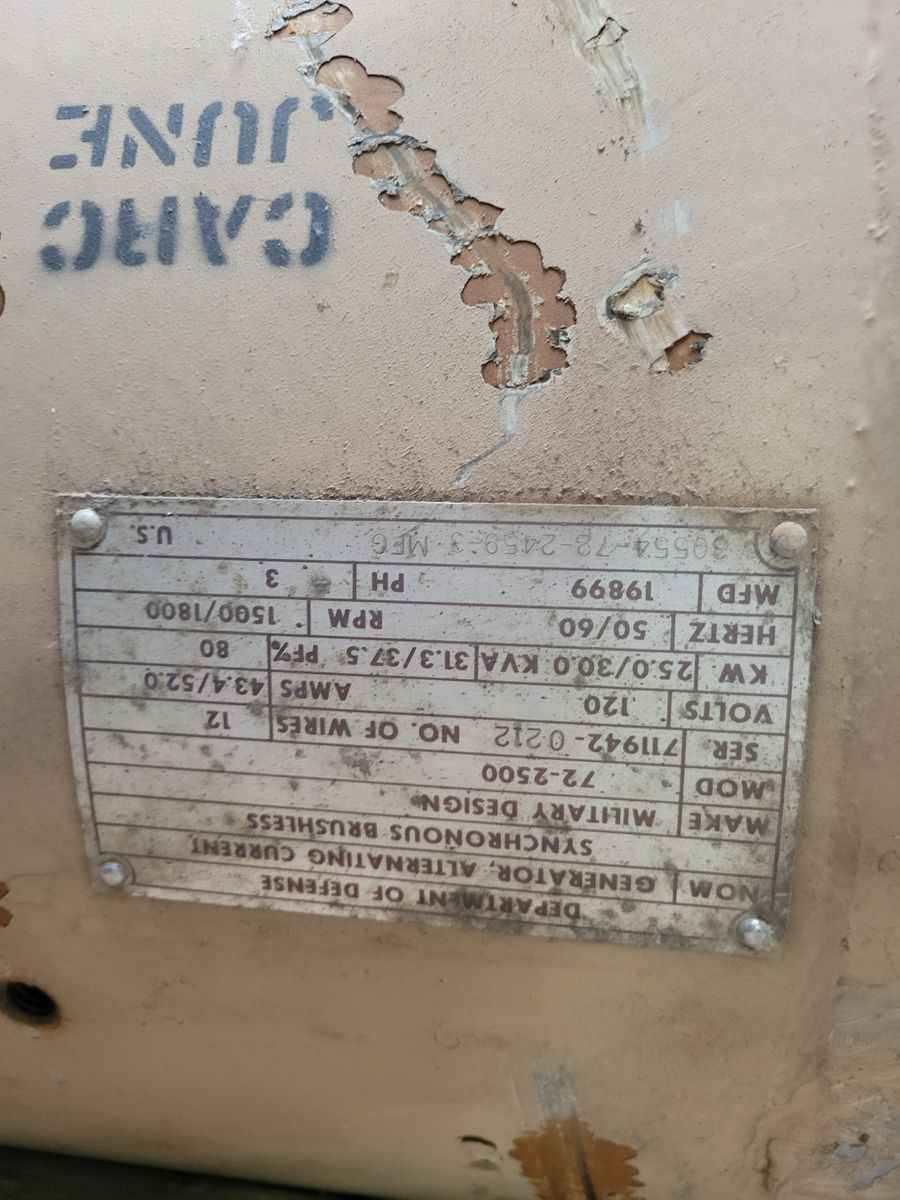 ApplePayAvailable for immediate liquidation: A robust 30kW military-spec synchronous brushless AC generator head (alternator). This unit, model 72-2500, is a heavy-duty Department of Defense surplus item designed for high-reliability power generation.