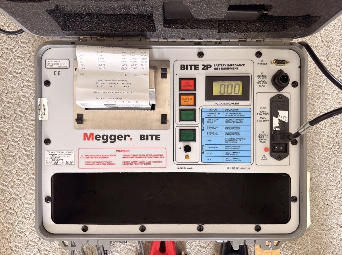 The Megger BITE2P battery impedance test equipment with built-in printer analyzes the condition of lead-acid and nickel-cadmium battery cells with a capacity of up to 7,000 ampere-hours (Ah) for battery maintenance applications in the industrial, commercial, medical, telecommunications, aircraft, power utility, and military industries.