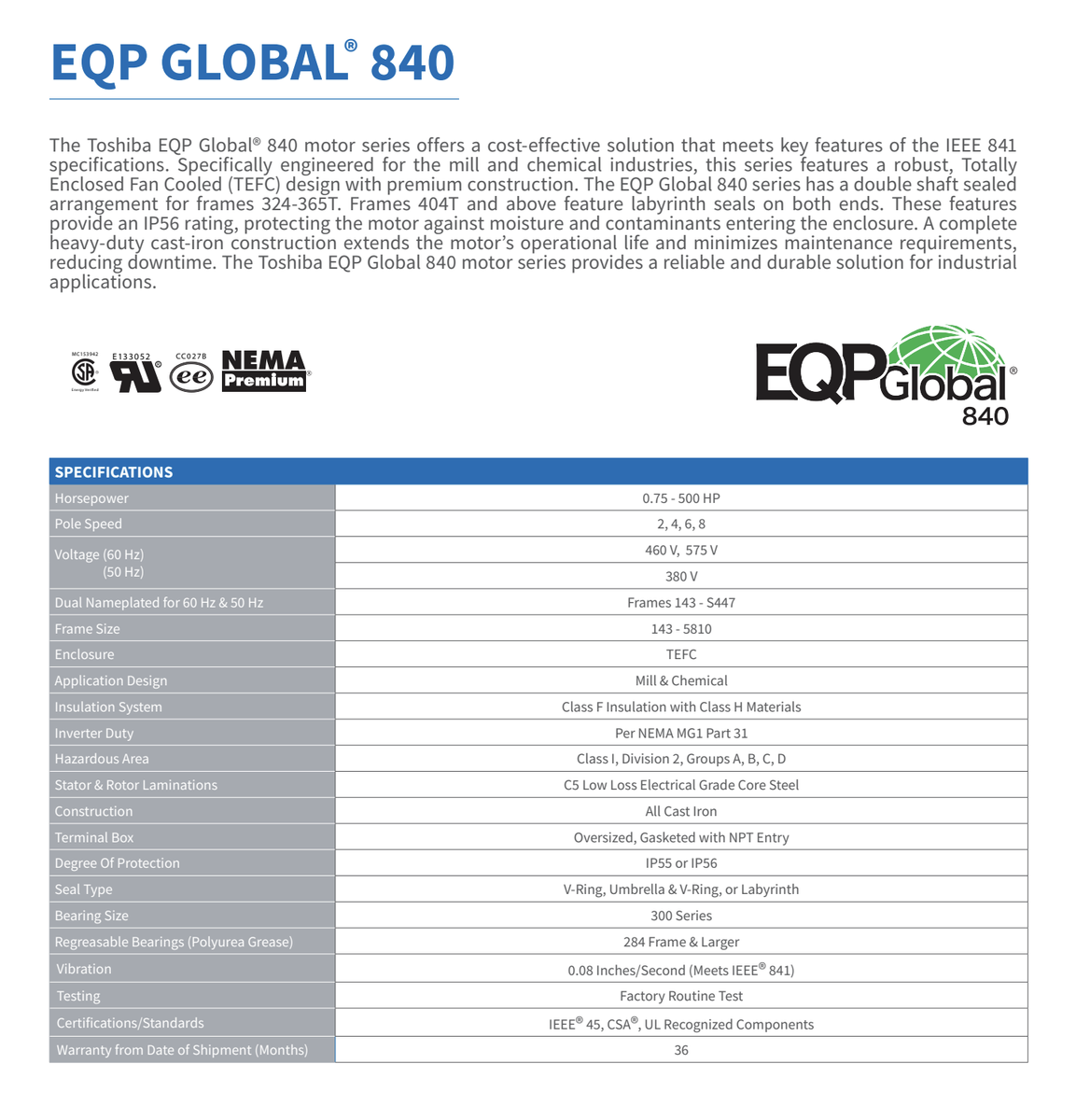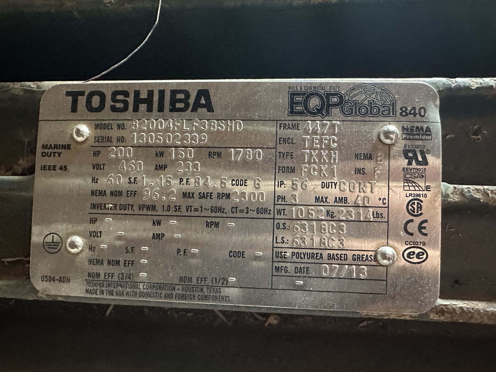VenmoToshiba EQP Global 840 – 200 HP Electric Motor 460V / 3 Phase / 1780 RPM