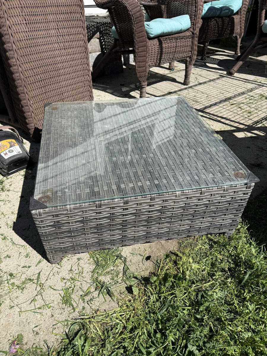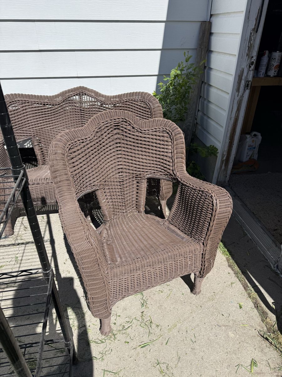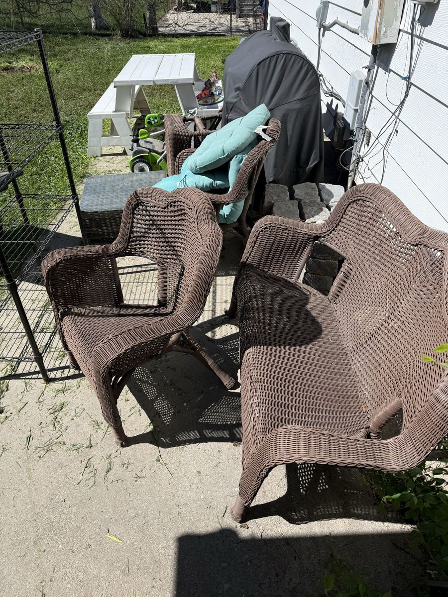 Two chairs (fits one person each) and one loveseat that fits two people. Comes with cushions which are in great shape. And a matching table. One of the tables legs is bent but can be bent back into shape and it stands just fine. One of the legs on the loveseat is unraveling but would be easily fixed with a bit of glue. There’s also another table that has a glass top that’s nice. It’s not a perfect match but it’s in great shape. It all just needs to be cleaned/hosed down.