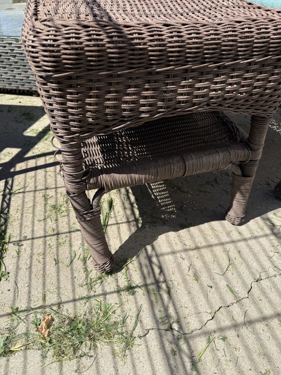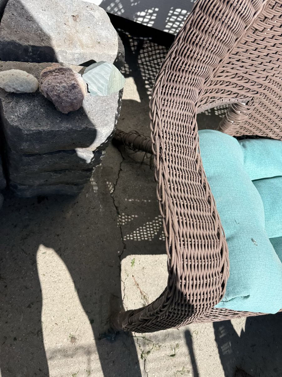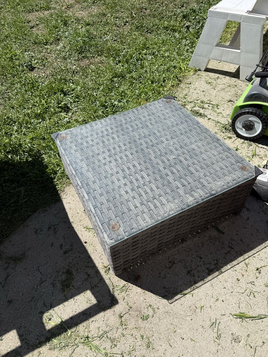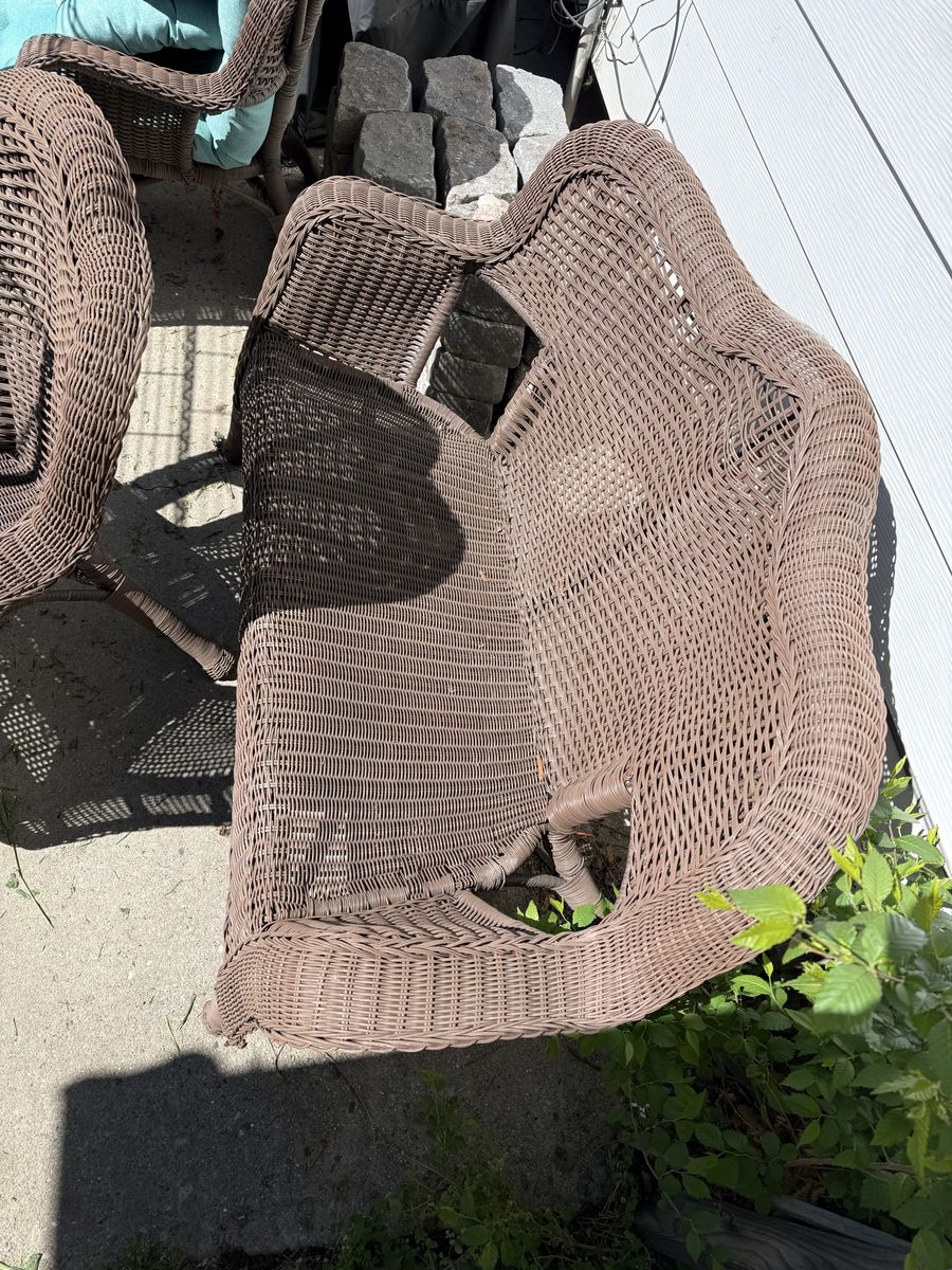 Two chairs (fits one person each) and one loveseat that fits two people. Comes with cushions which are in great shape. And a matching table. One of the tables legs is bent but can be bent back into shape and it stands just fine. One of the legs on the loveseat is unraveling but would be easily fixed with a bit of glue. There’s also another table that has a glass top that’s nice. It’s not a perfect match but it’s in great shape. It all just needs to be cleaned/hosed down.