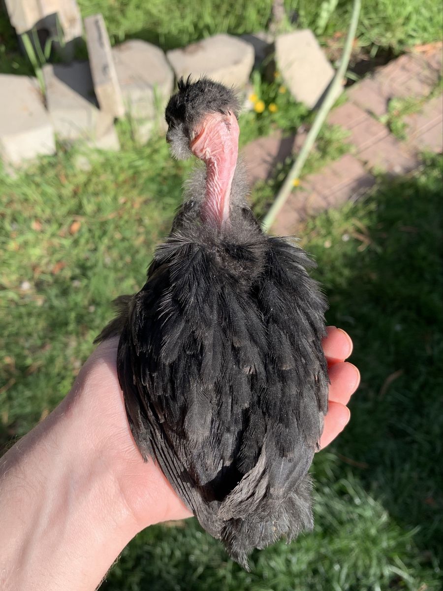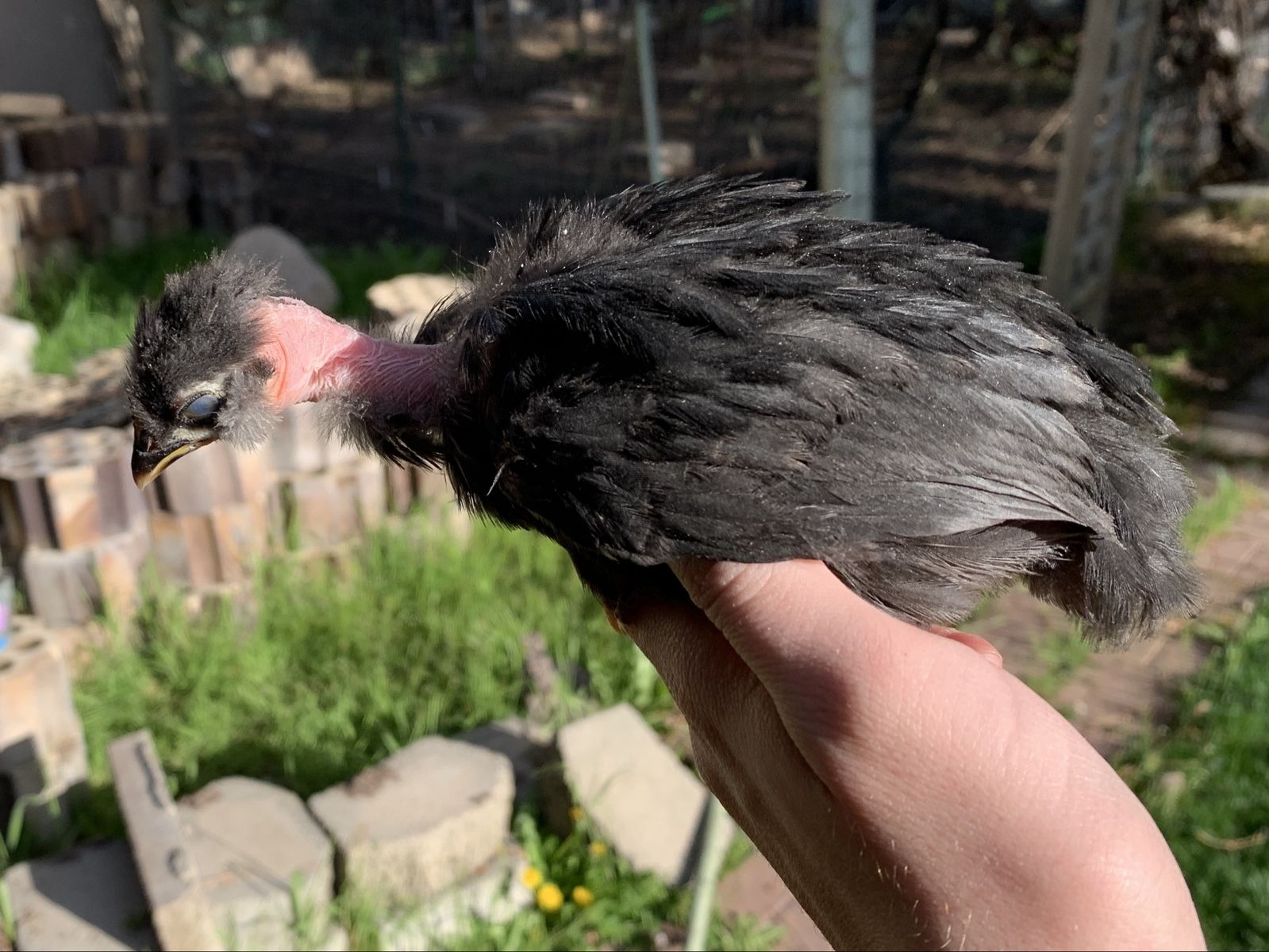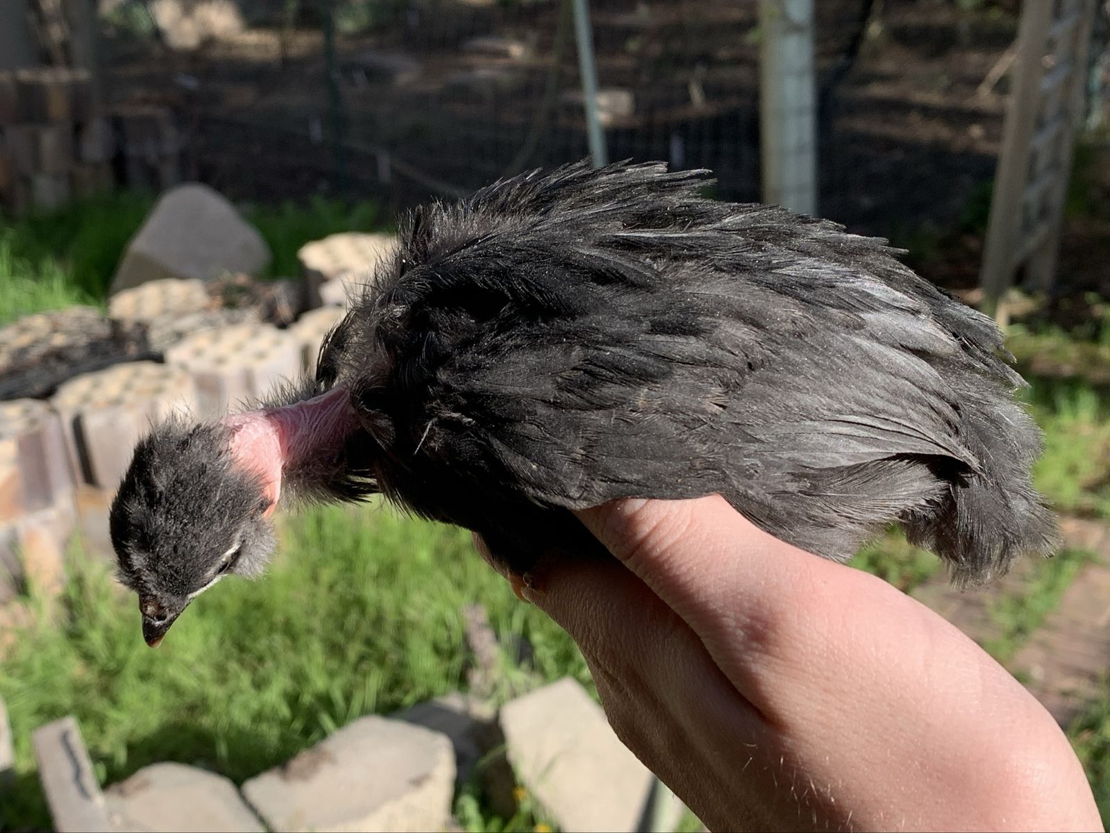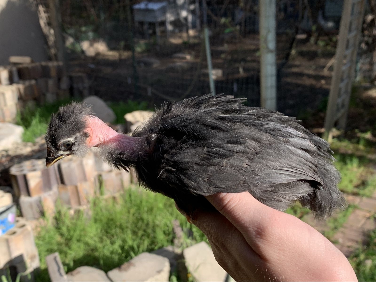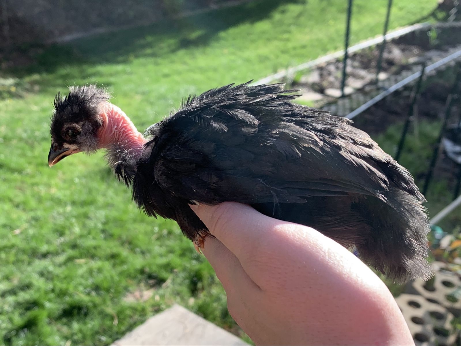 VenmoBantam Showgirl Satin (Showgirl Silkie x Bantam Cochin) chick. Aka naked neck. Straight run as I can’t tell the gender yet, but it shows no signs of being a cockerel. Hatched 3/15, so they still need heat at night.