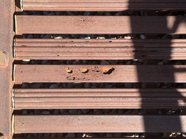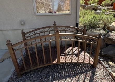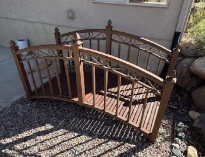 Metal rusty-look outdoor bridge 72" long(across) x 32" wide x 40" high at center. There are a few holes in 2 of the treads but you might be able to turn them over.