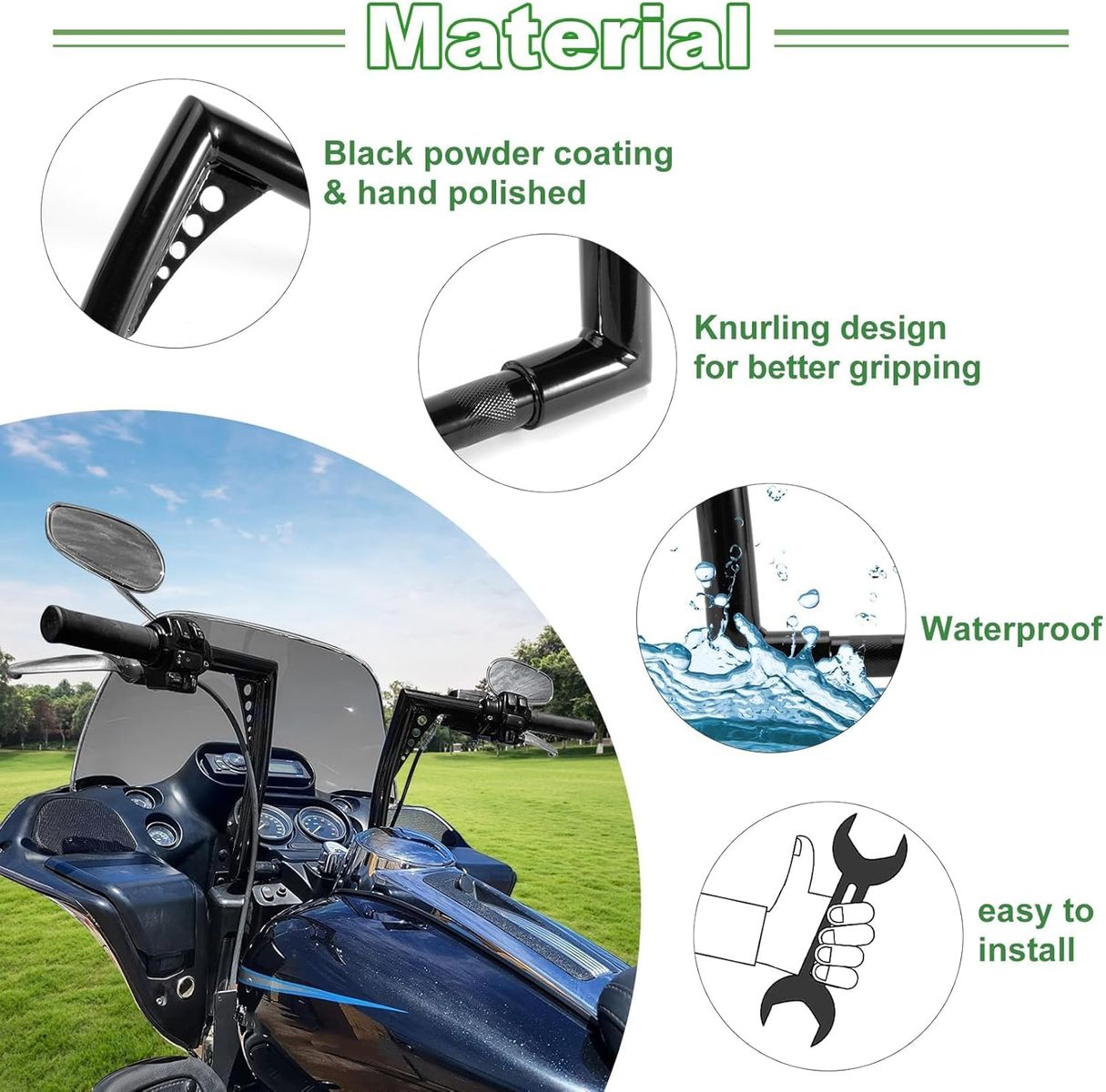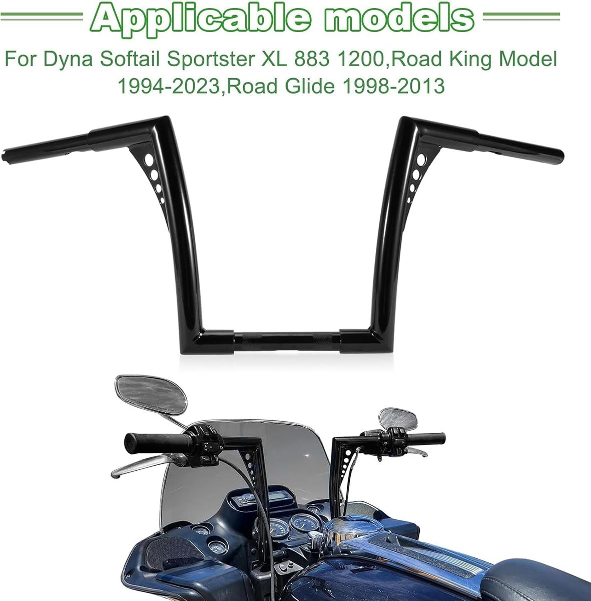 About this item - VERSATILE DESIGN - Our road king handlebar are specifically designed for Dyna Softail Sportster XL 883 1200,Road King Model 1998-2013,Road Glide 1998-2013.(Not for Electra Glide,Street Glide & 2014-UP Road Glide,2008-2011 Cross Bones FLSTSB with OEM risers) providing a versatile solution for riders seeking the perfect balance of comfort and control. Crafted with precision and durability in mind, these 12 ape hanger handlebar are ideal for any cyclist looking to enhance their riding experience