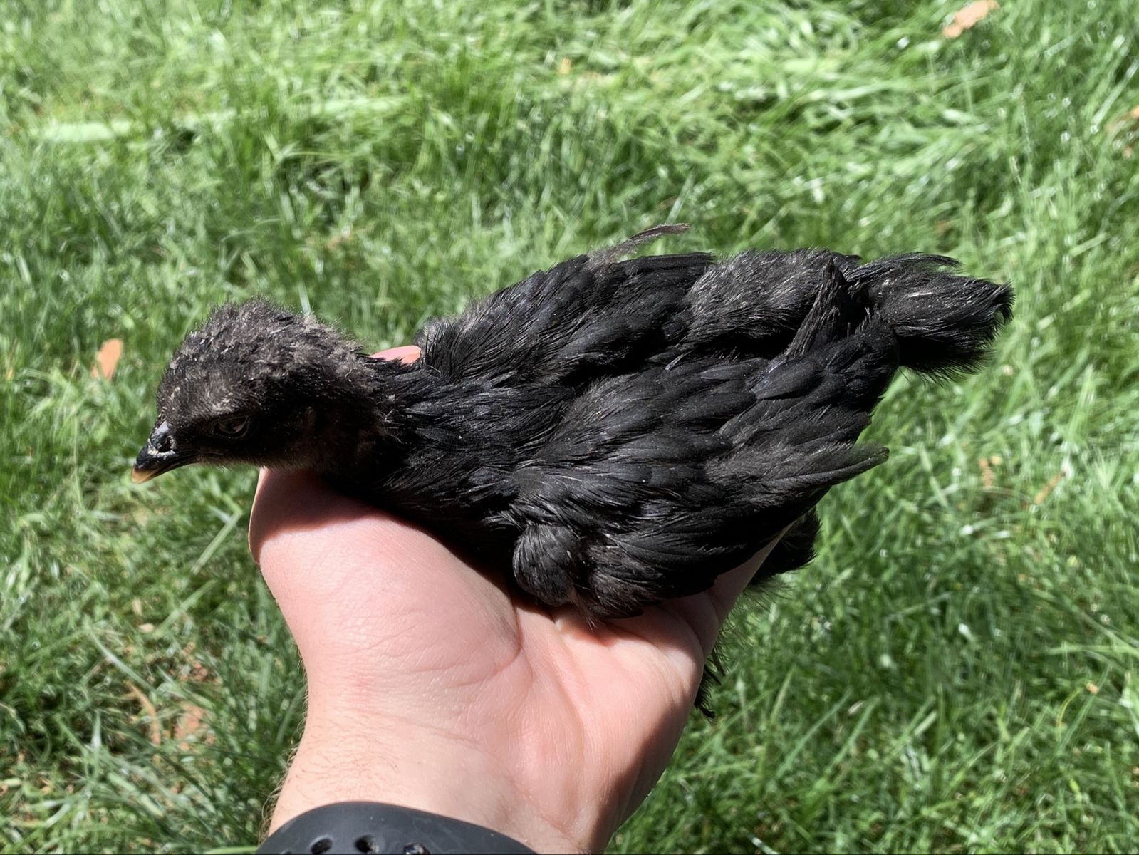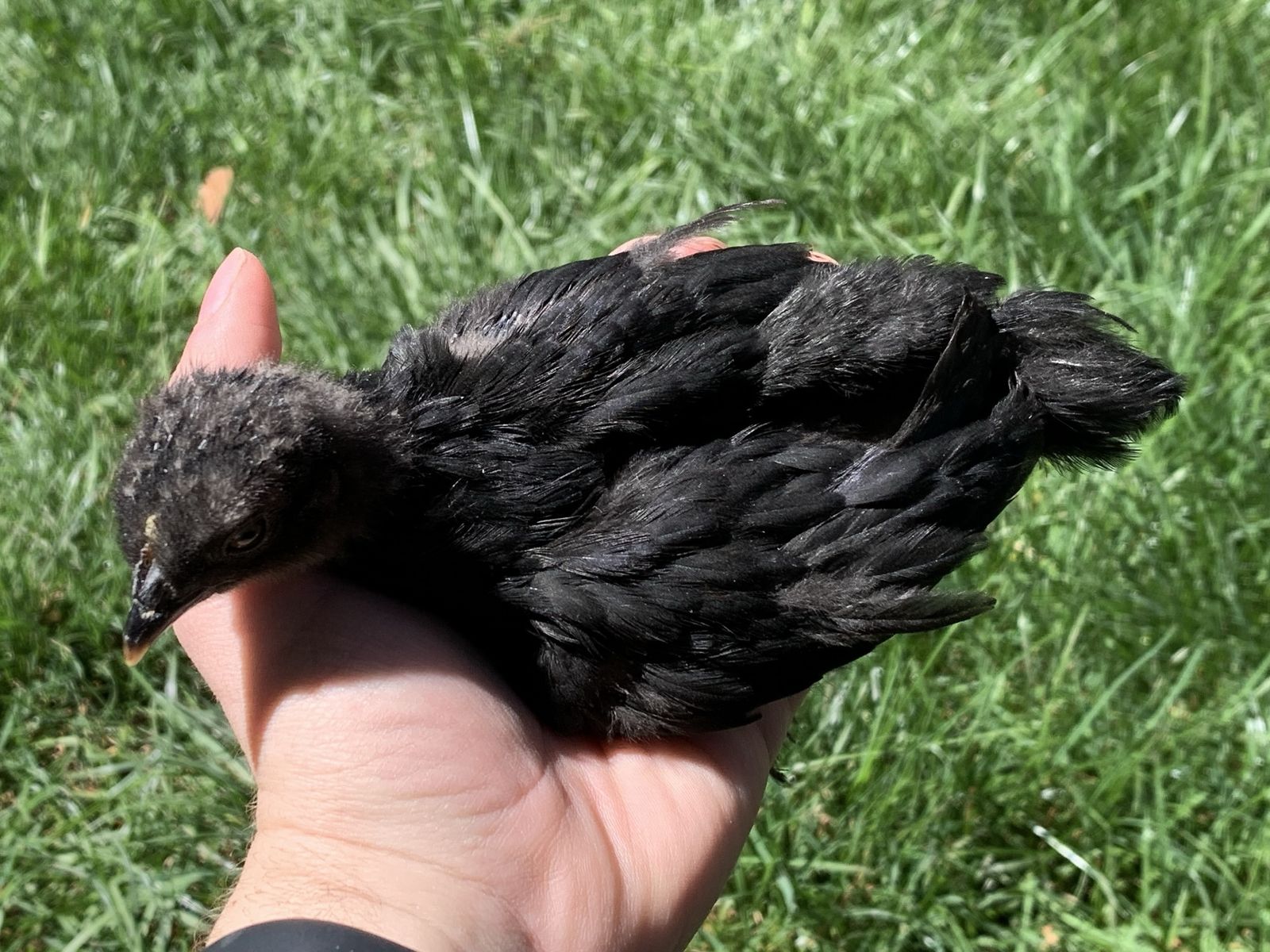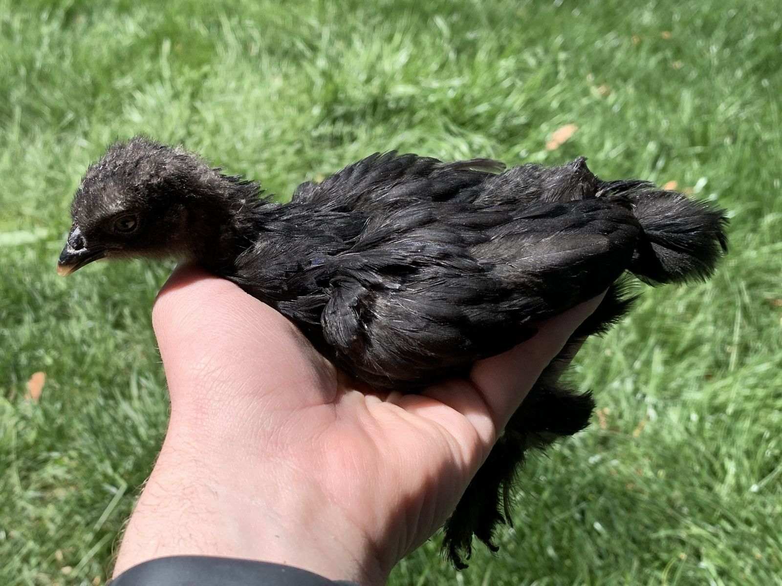 VenmoBlack purebred bantam cochin chick, possibly developing a white pattern in the breast feathers. Hatched 3/15. Straight run as it’s too early to tell, but it shows no signs of being a cockerel. This chick is absolutely tiny, it’s smaller than all but one of the young Seramas.