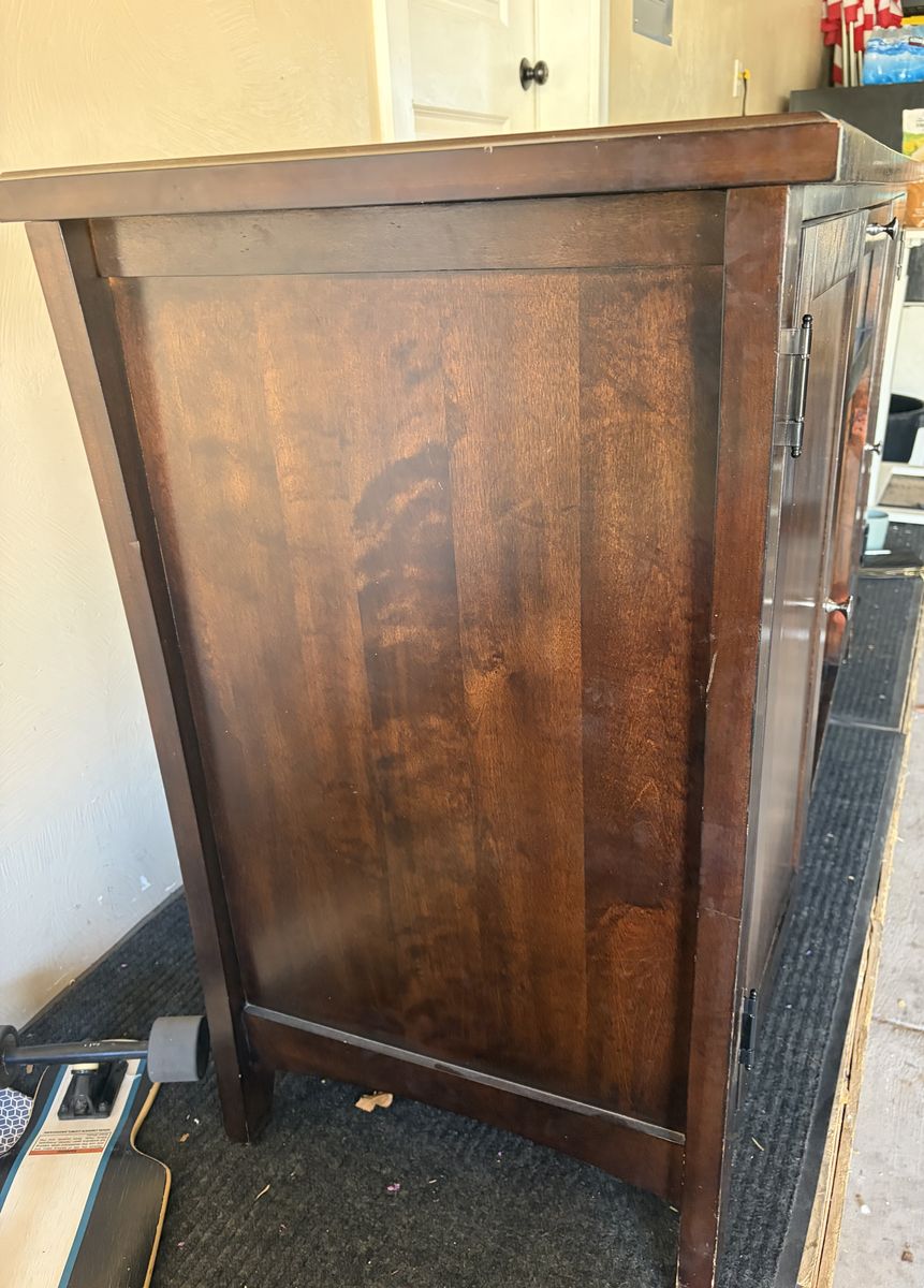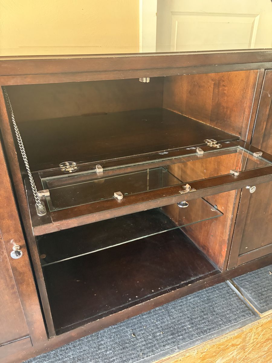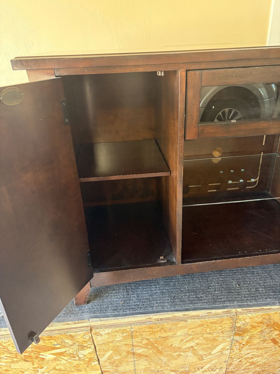 Venmo2 two cabinets with working doors and shelves in each. One glass shelf in the middle area and one hinge door. Nothing broken