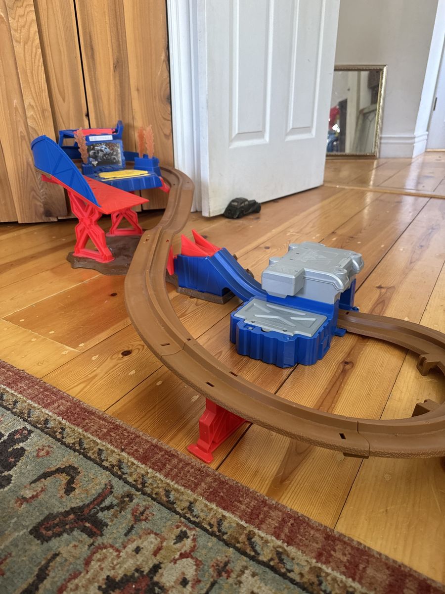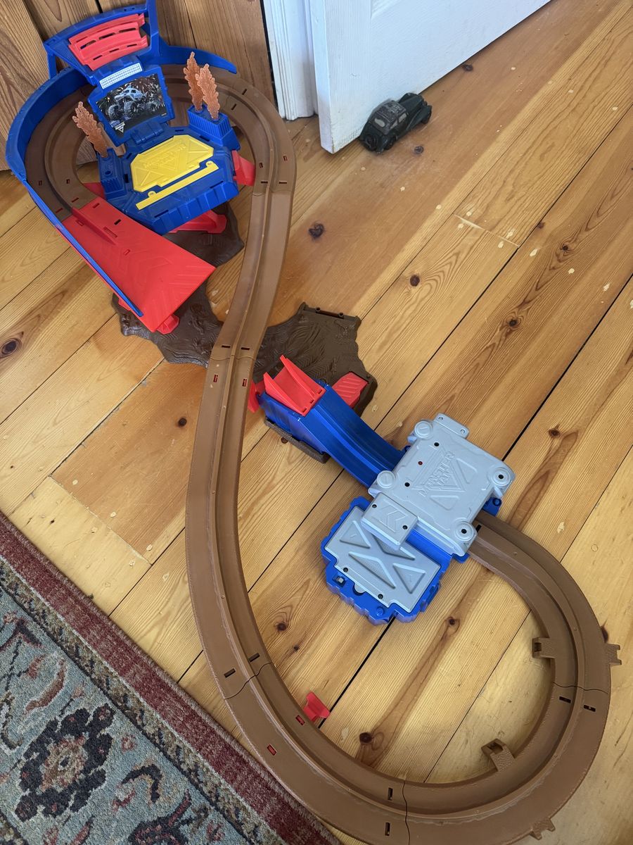 This monster jam playset makes an infinity loop powered by batteries. Missing a couple insignificant pieces, but works great!