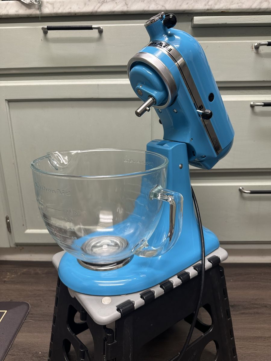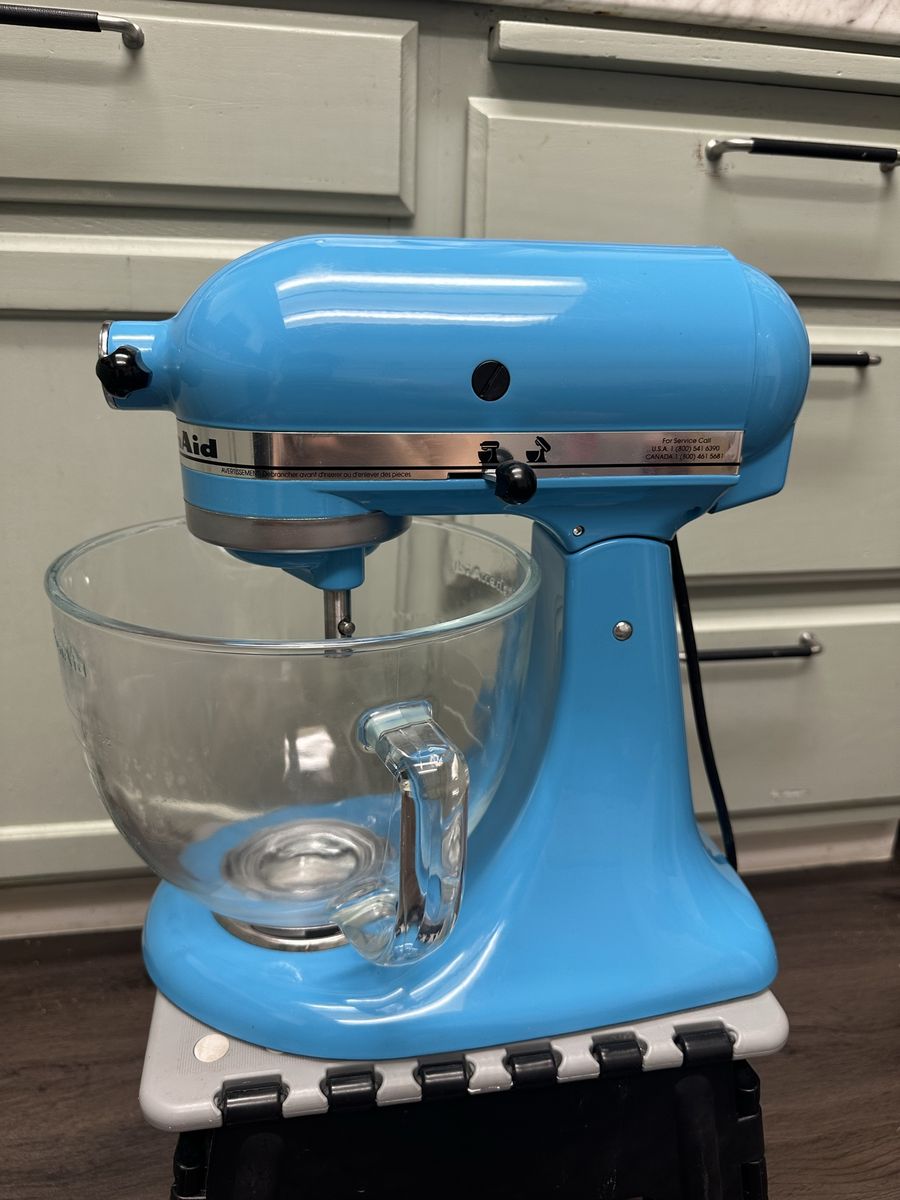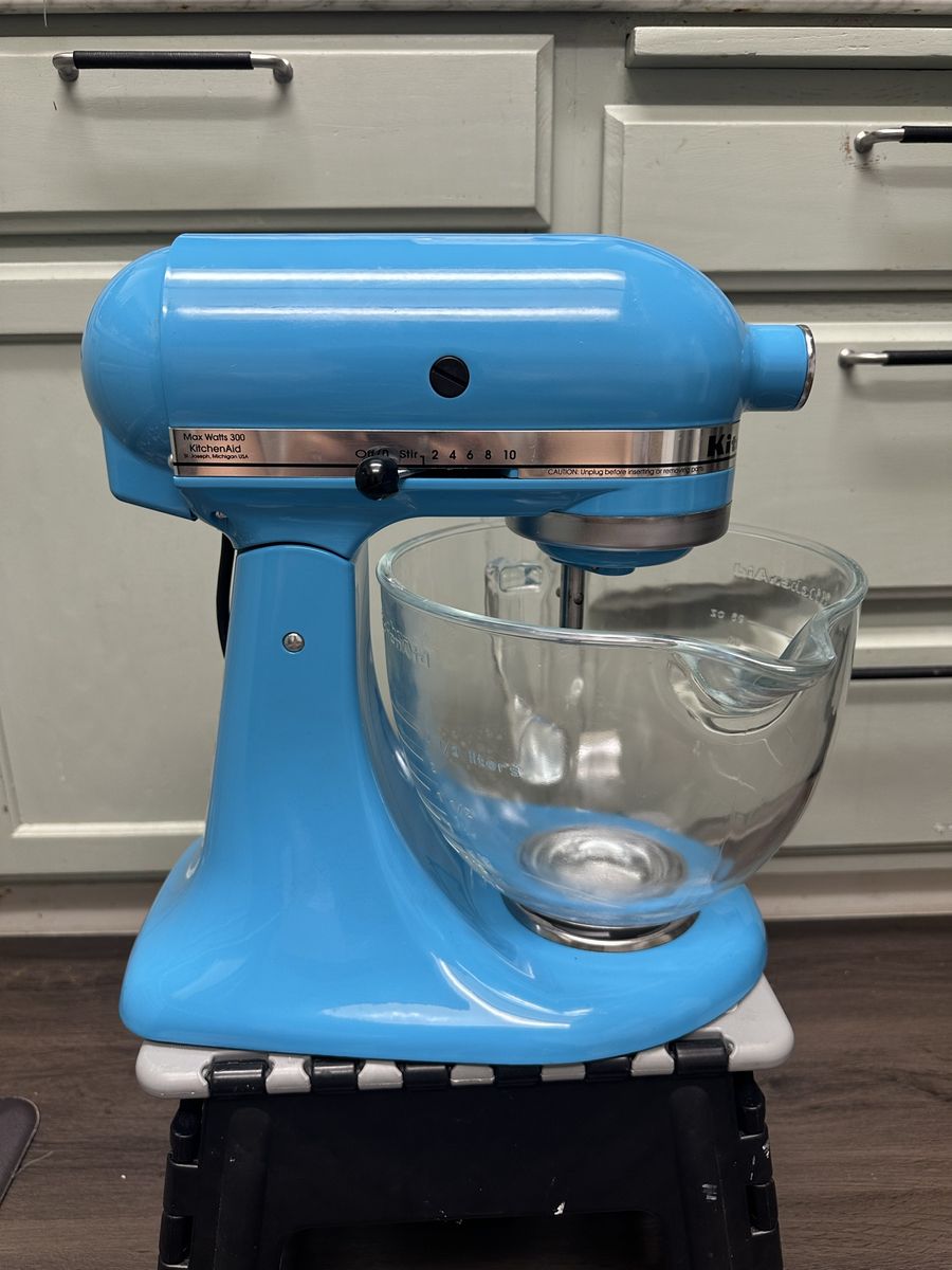 VenmoFully functional KitchenAid Artisan 5‑quart stand mixer in blue. Great condition. Includes glass mixing bowl, flat paddle, wire whisk, and dough hook. Clean and well cared for. Selling only because we upgraded to a newer model.