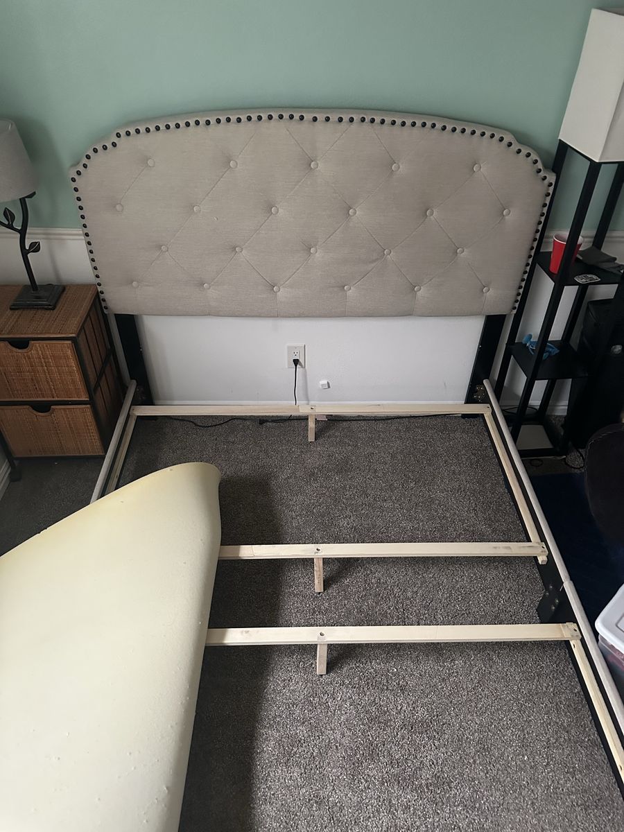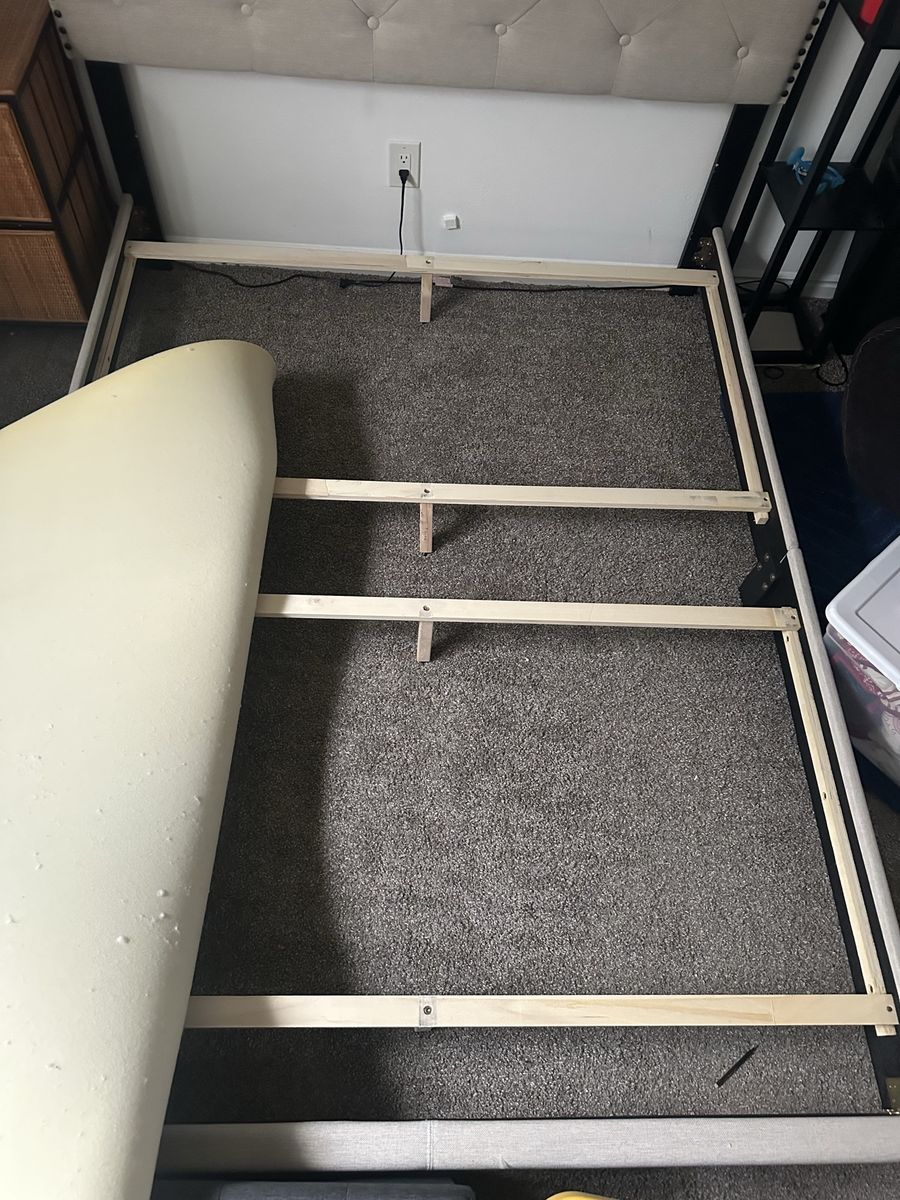 VenmoSelling a queen bed frame, foldable boxspring, and memory pad. Frame is in great condition and nothing that is wrong with it. The box spring has one wire that has detached but otherwise is great condition. Memory pad is 3 inches thick and can provide more comfort for your bed. (Mattress not included in photo) Price as listed and can be sold separately.