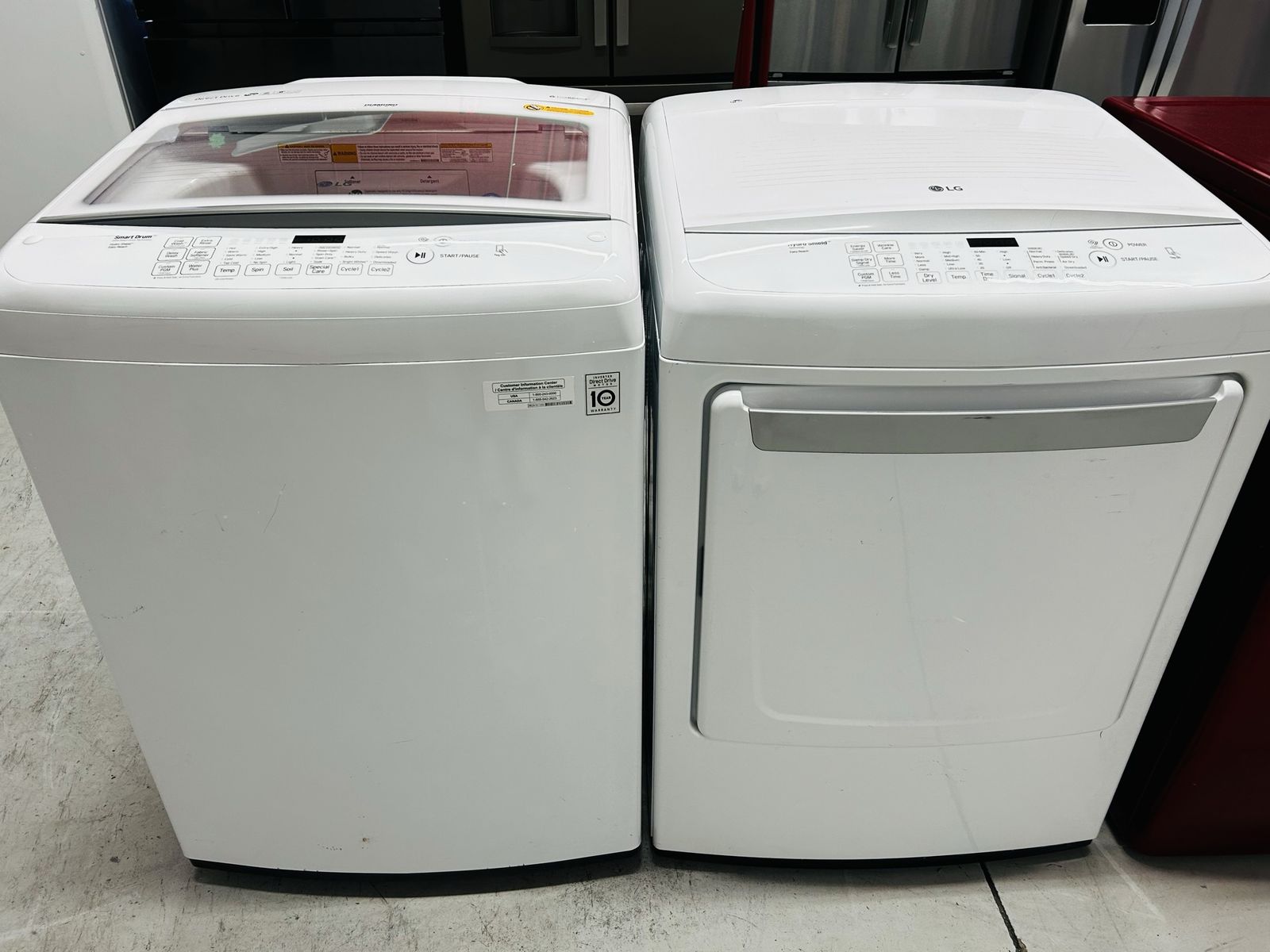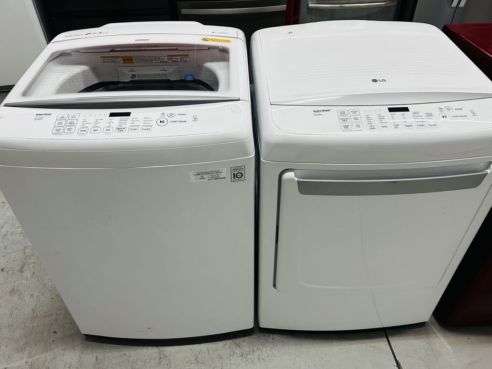 Lg hydro shield washer easy reach smart drum with direct drive technology stainless steel drum normal prewash speed wash delicate bulky normal rinse plus spin stain cycle soak water plus extra rinse delay wash etc..Lg hydro shield electric dryer easy reach heavy duty normal anti bacterial delicate speed dry air dry time dry wrinkle care damp dry etc..They work wonderful, clean, 45 day warranty, delivery available.