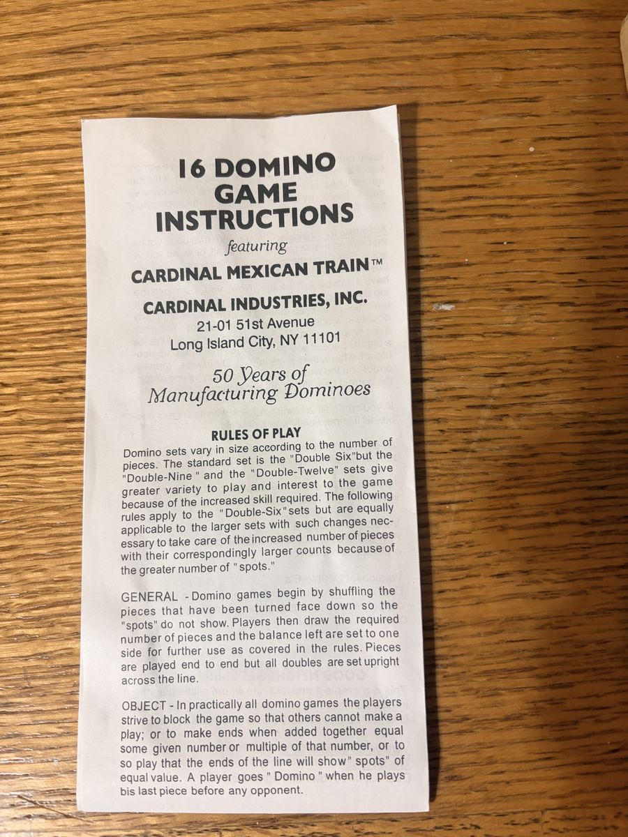 This is a Cardinal Mexican Train set, perfect for family game nights. Tiles are clean and colorful, easy to read.