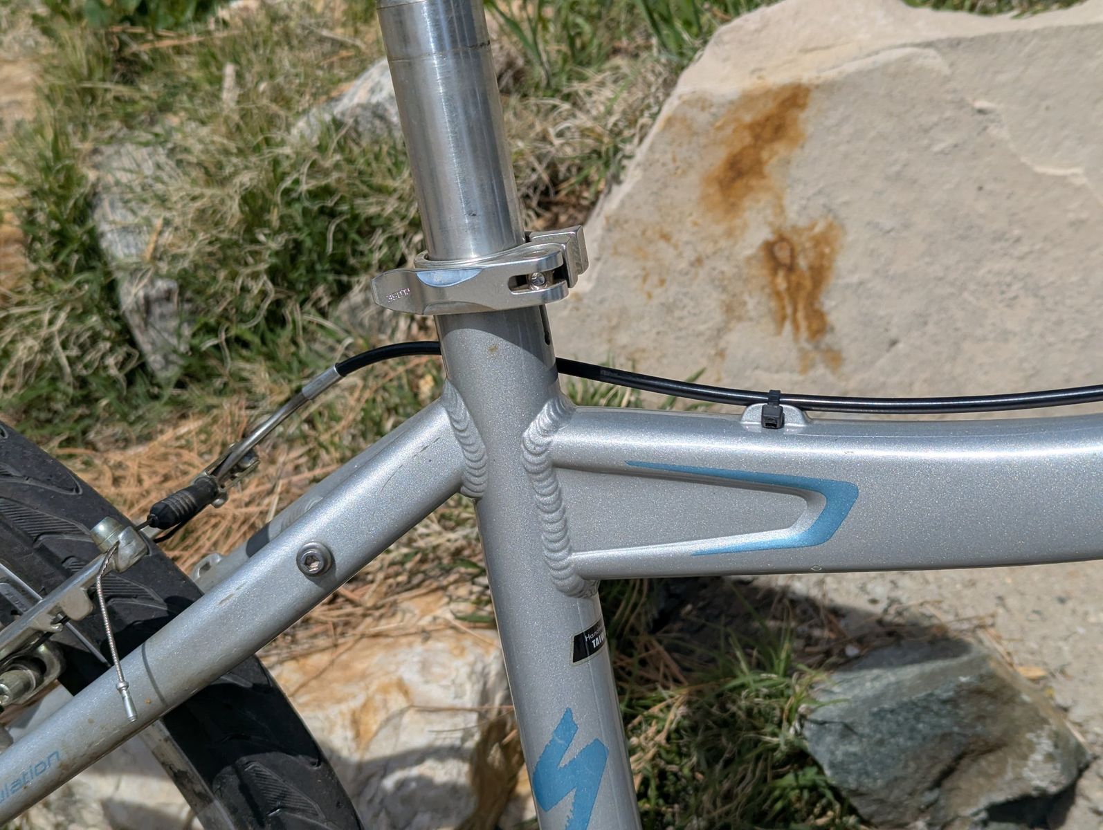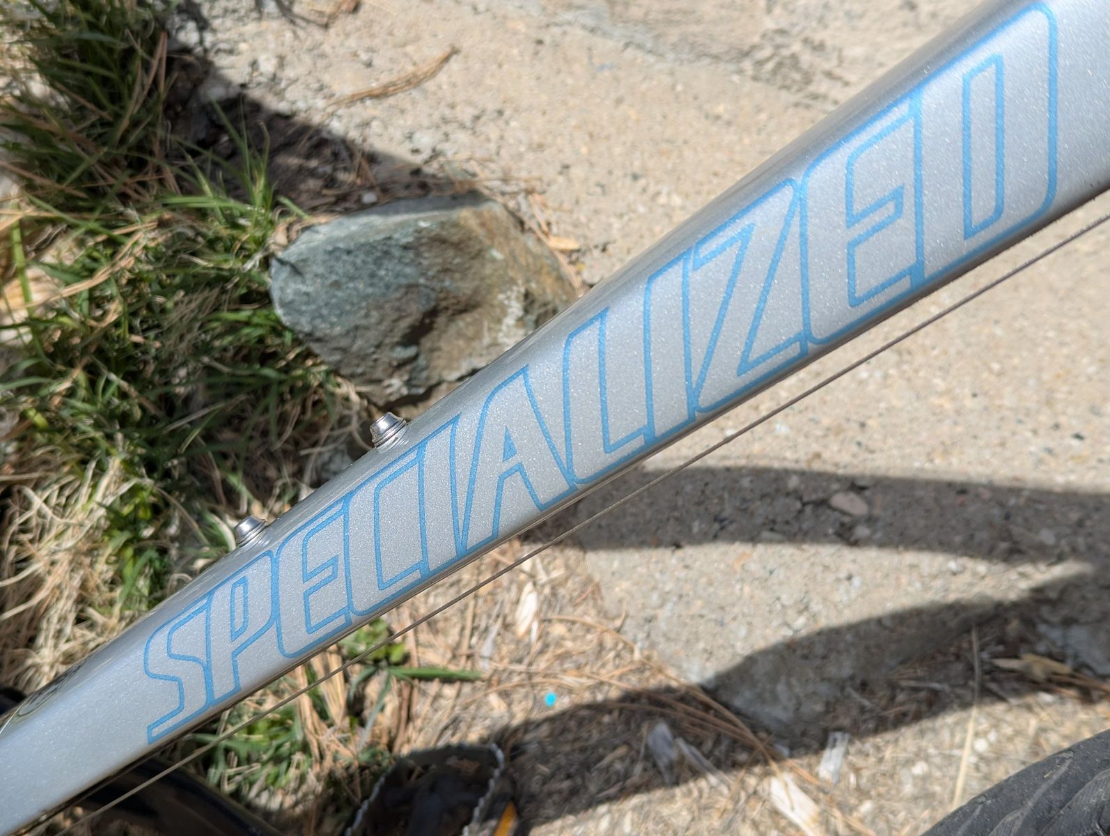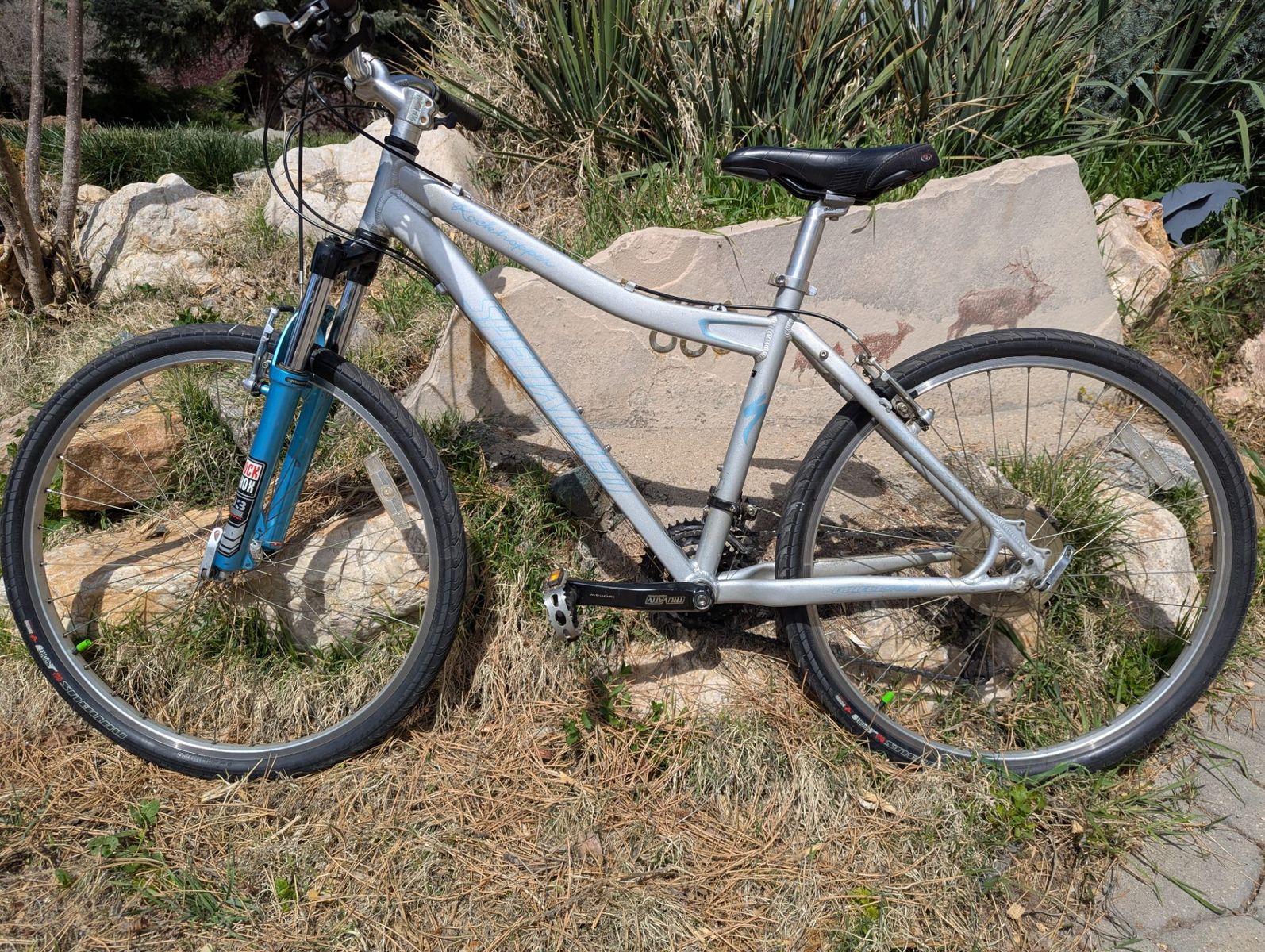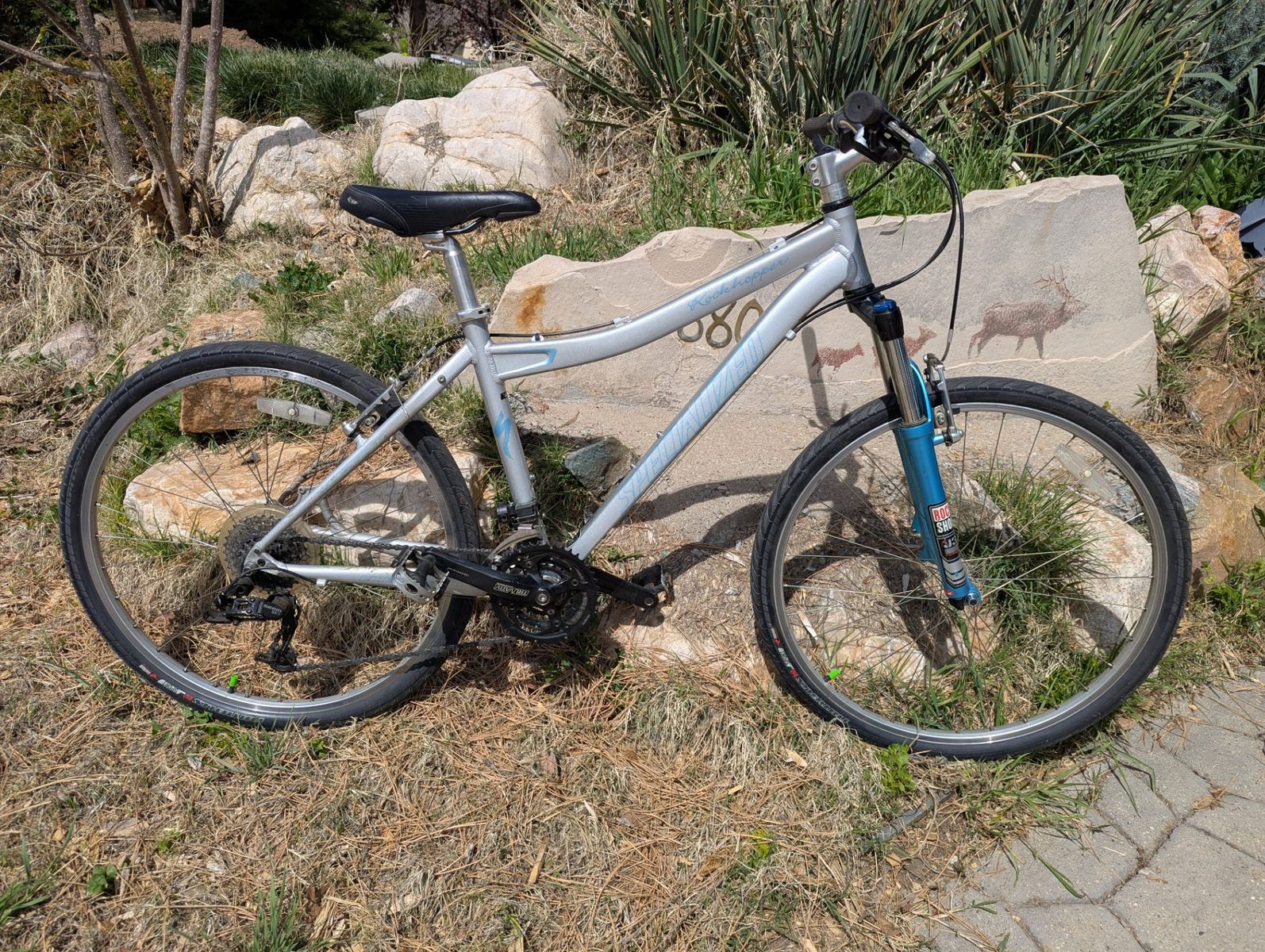 VenmoThis 2006 Specialized Rockhopper is a women's mountain bike constructed with an aluminum frame. It is currently equipped with Specialized Nimbus Sport slick tires for city commuting but retains its mountain bike geometry and componentry.