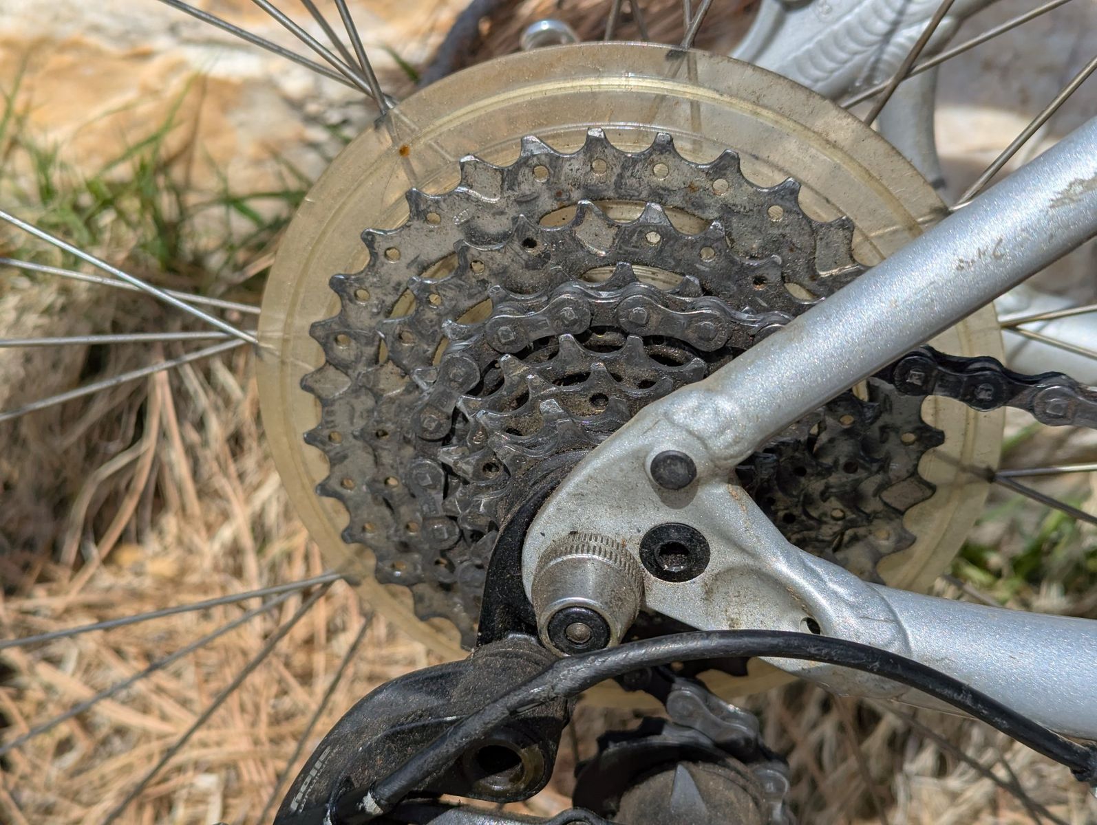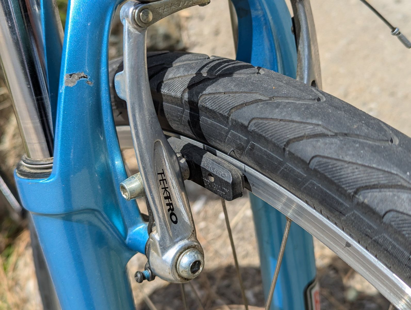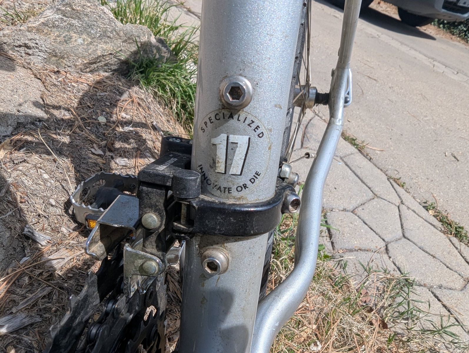 The bicycle is in functional condition with all components operating as intended. Cosmetic wear includes a paint chip on the left side of the suspension fork crown, scuffing on the head tube area, and general dust and debris accumulation on the drivetrain components.