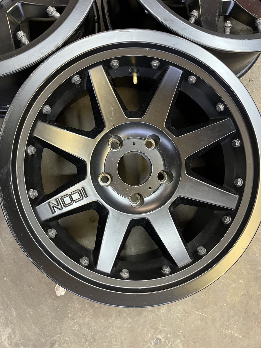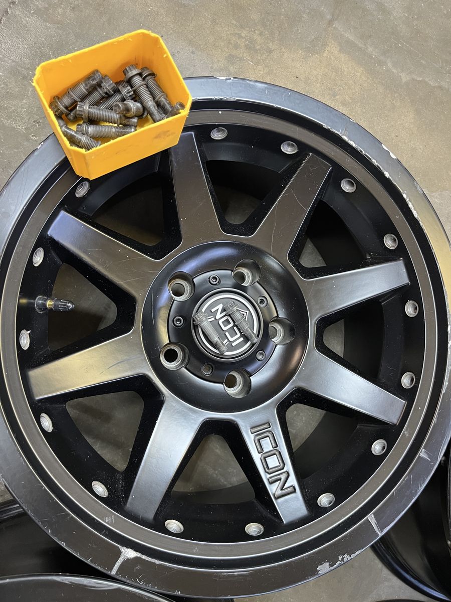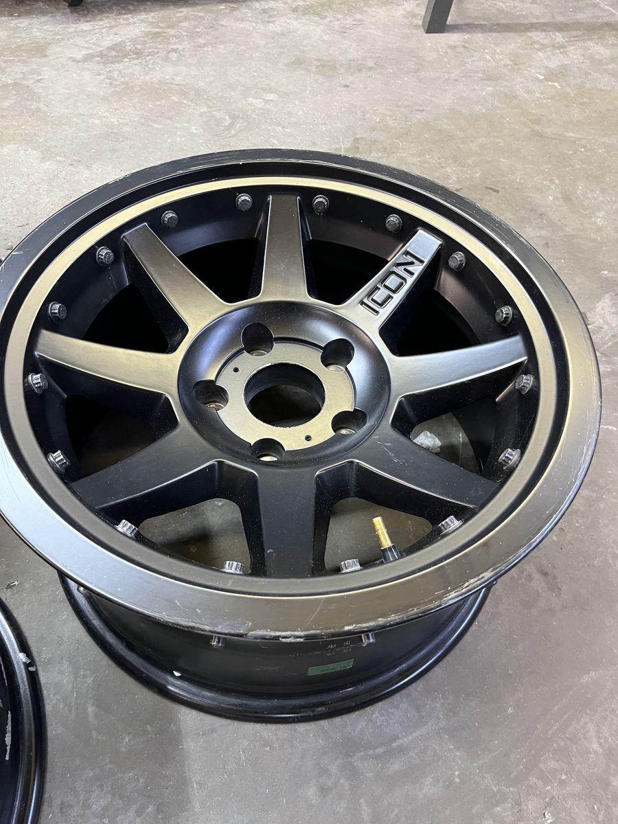 GooglePay(5) Icon Alloy Rebound Pro beadlock wheels, 17x8.5, 5x5, 4.5” backspacing, (4) center caps, center bore is about 2 13/16”.