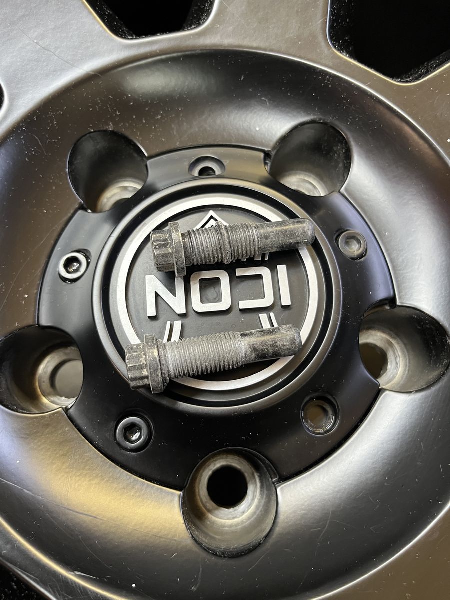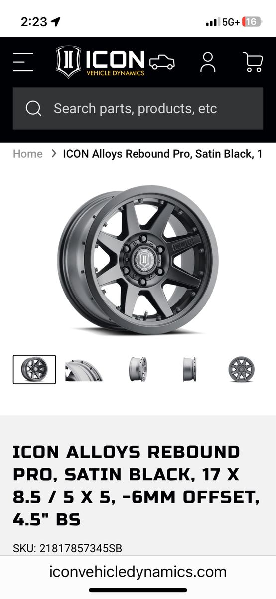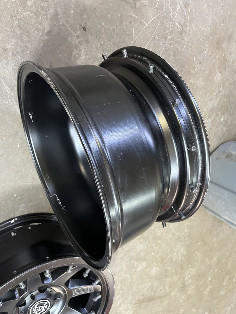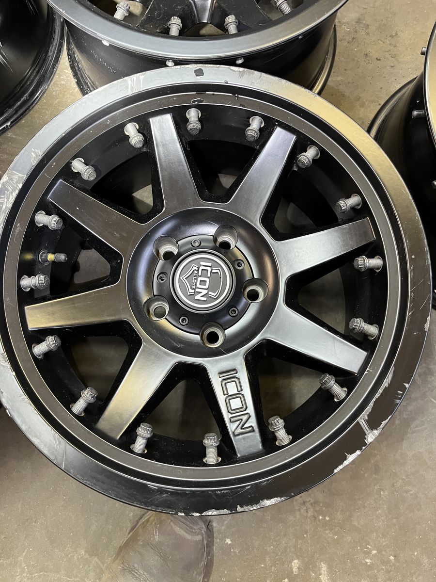 GooglePay(5) Icon Alloy Rebound Pro beadlock wheels, 17x8.5, 5x5, 4.5” backspacing, (4) center caps, center bore is about 2 13/16”.