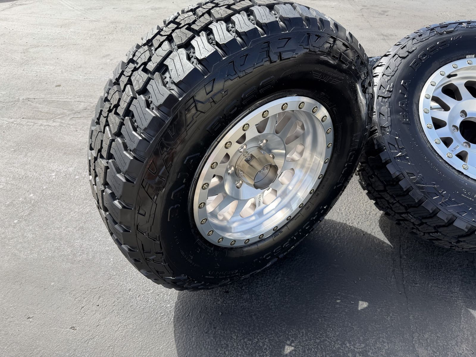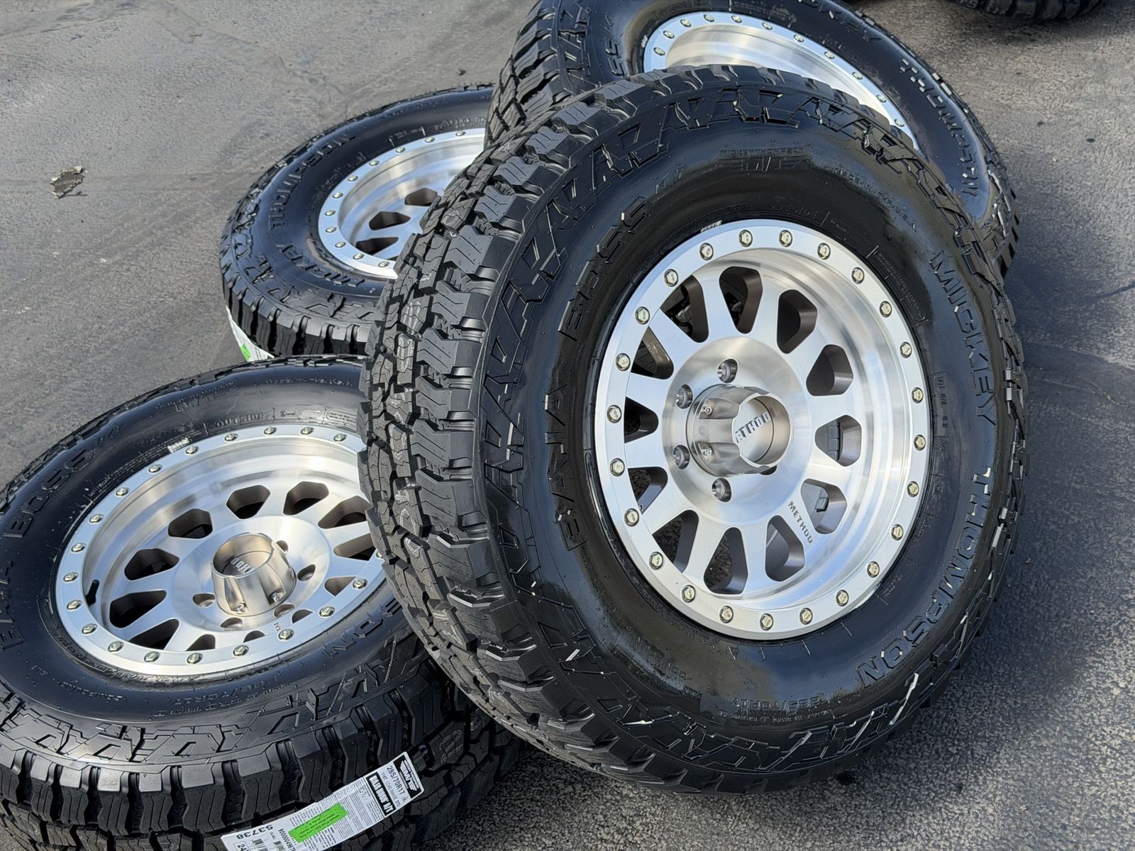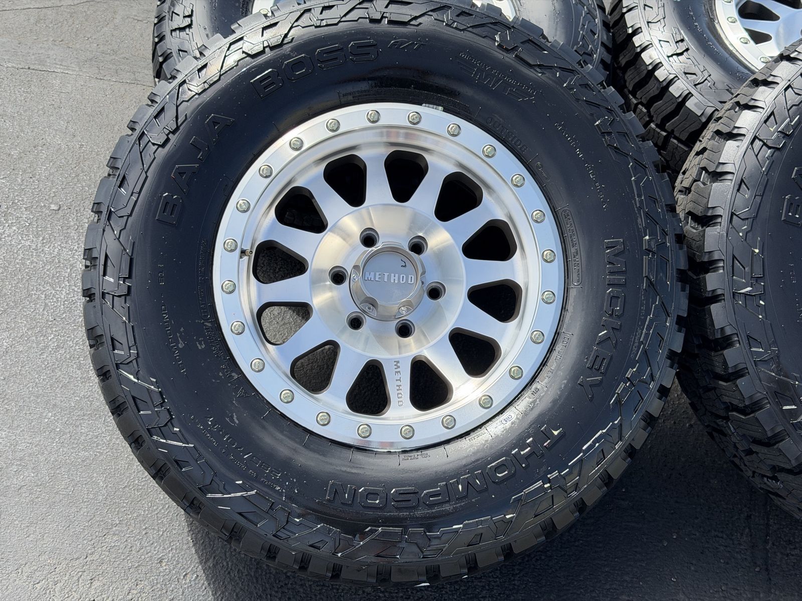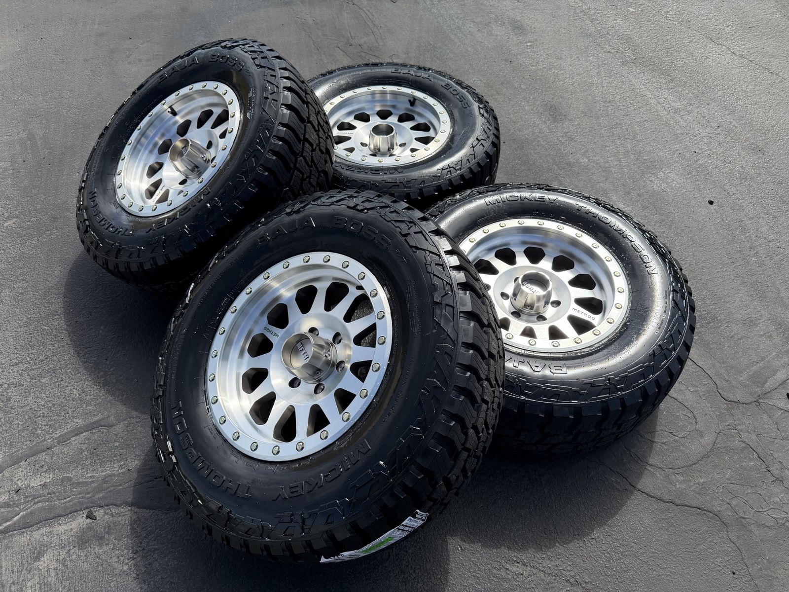 ApplePayBrand new LT285/70r17 Mickey Thompson Baja Boss AT tires. Mounted and balanced on brand new 17x8.5 Silver/machined Method MR304. 6x5.5 bolt pattern (6x139.7). These fit Chevrolet Silverado 1500 GMC Sierra yukon tahoe Nissan Titan and Toyota Tacoma. HUGE savings