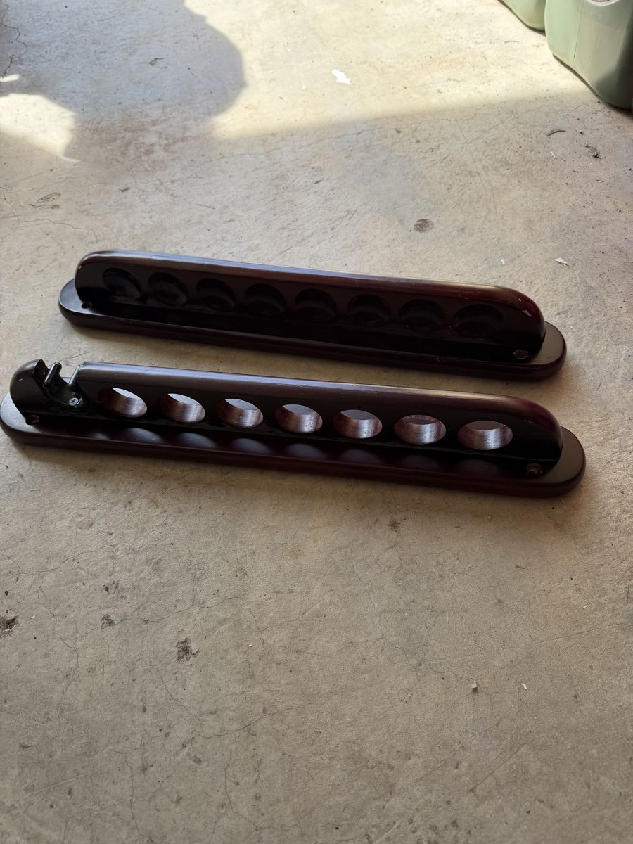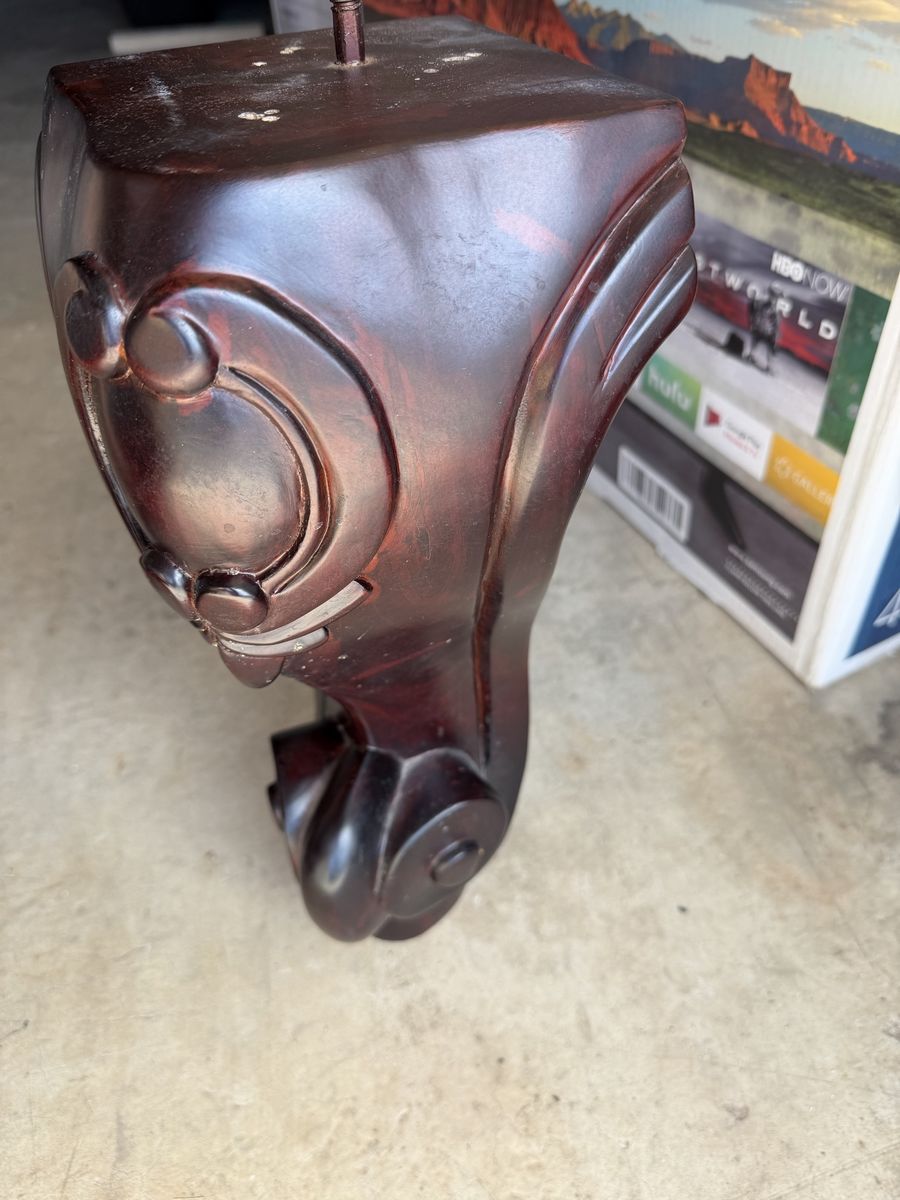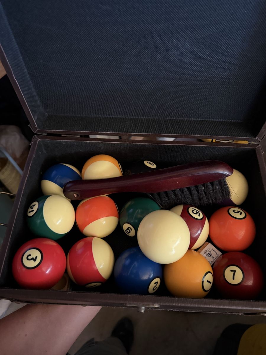 ApplePayPool table. Billiard table. It is disassembled. Real wood. Dark maroon stained wood with tan felt. Comes with everything you need…6 cues, cue bridge, cue wall mount, balls, etc. This is a high end pool table. Good quality.