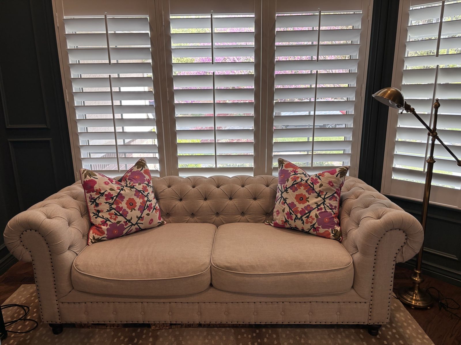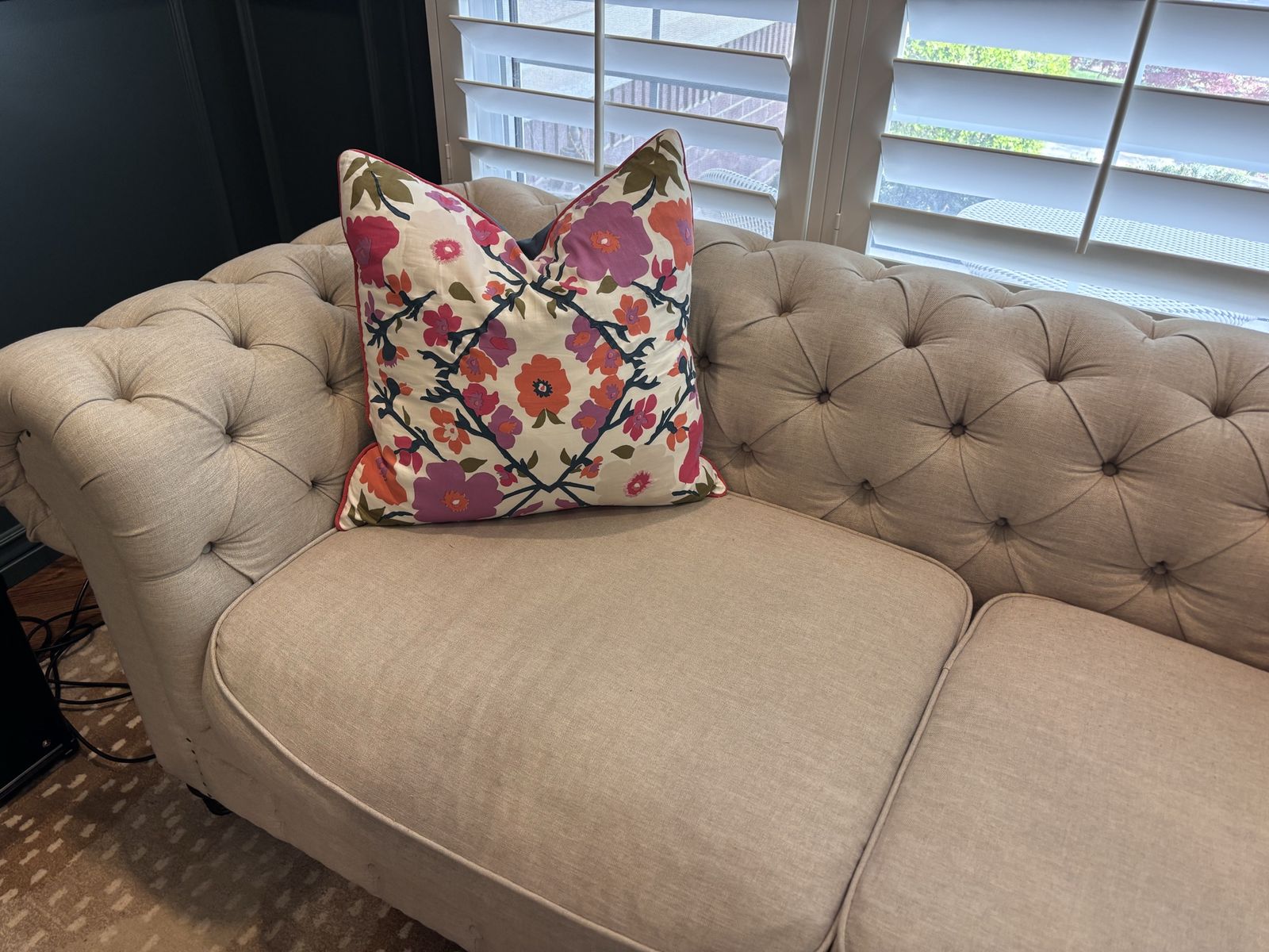 Darling Button Tufted Linen Sofa Pillows Included. Has 2 small spots on back that aren’t noticeable if going against a wall. 89 inches wide Top of arm 30.5 inches tall Top of cushion seat 19 inches tall Cushion seat depth 26 inches Entire sofa depth 39.5 inches