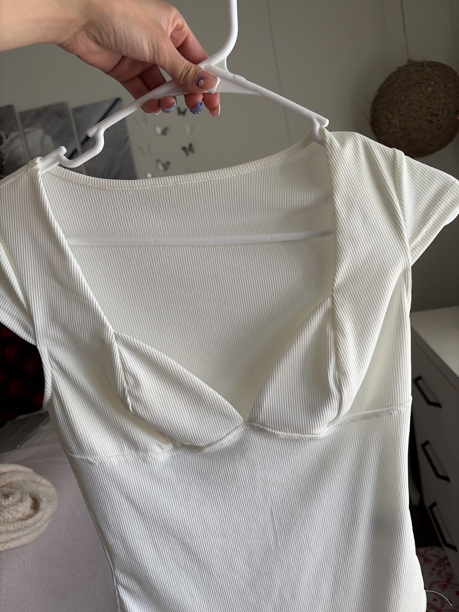 White ribbed bodysuit with a flattering sweetheart neckline and cap sleeves. Soft, stretchy fabric with a fitted shape and thong-style bottom for a smooth look under clothes.