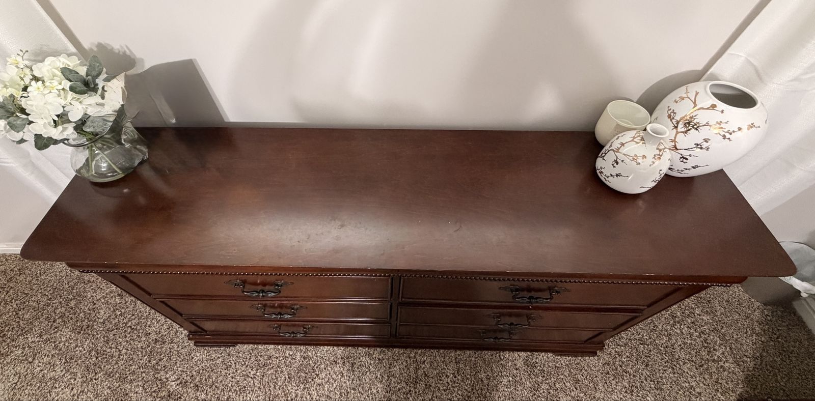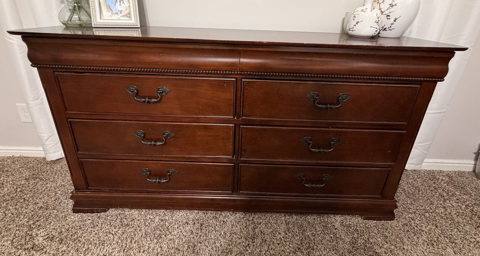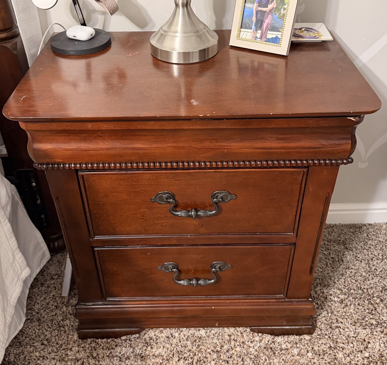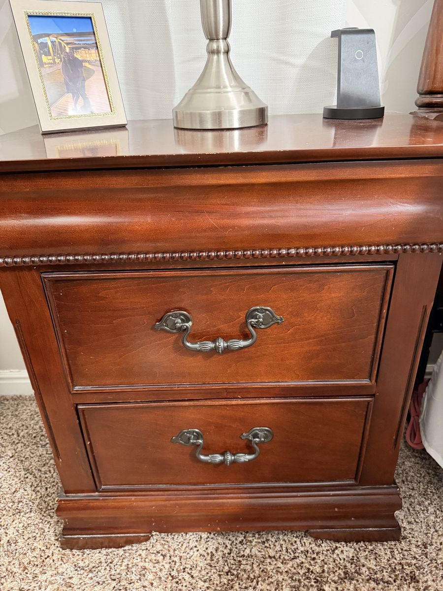 ZelleBeautiful matching bedroom set in a classic cherry wood finish. Everything is sturdy, well-built, and has a timeless look. We’ve loved this set — only selling because we’re upgrading to a new layout.