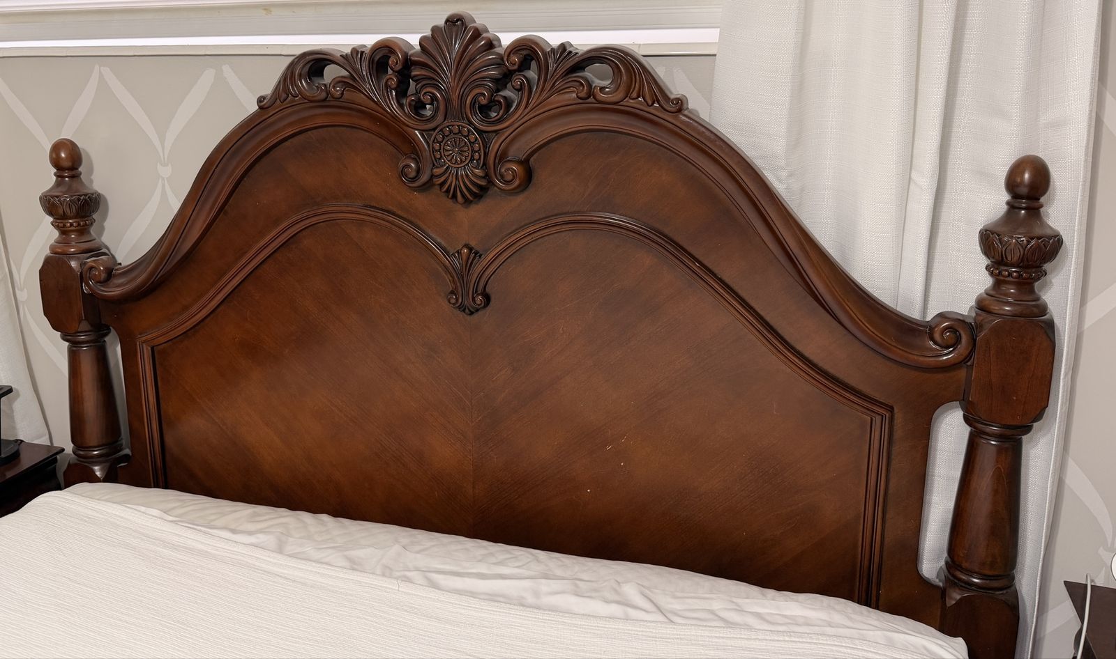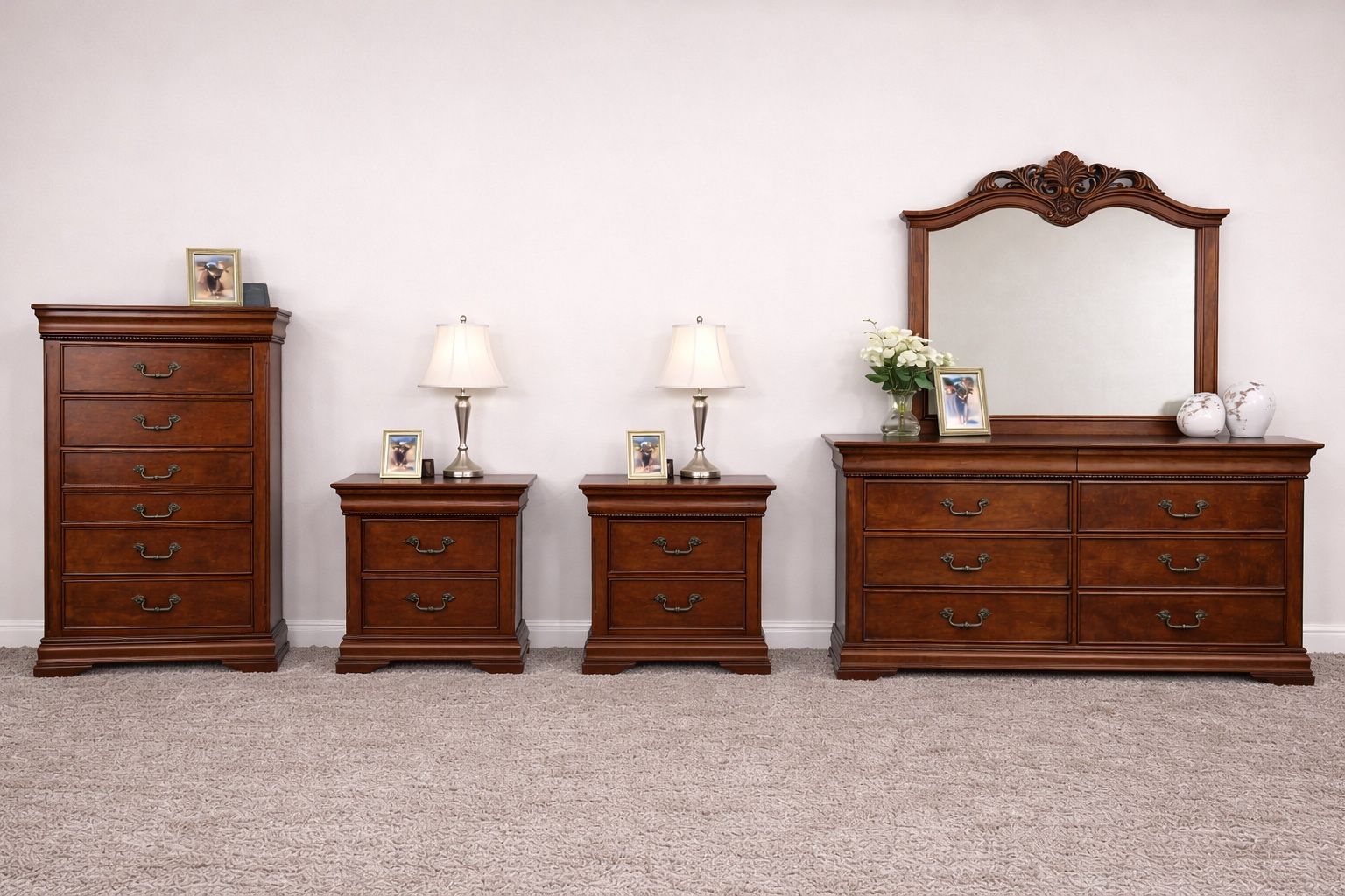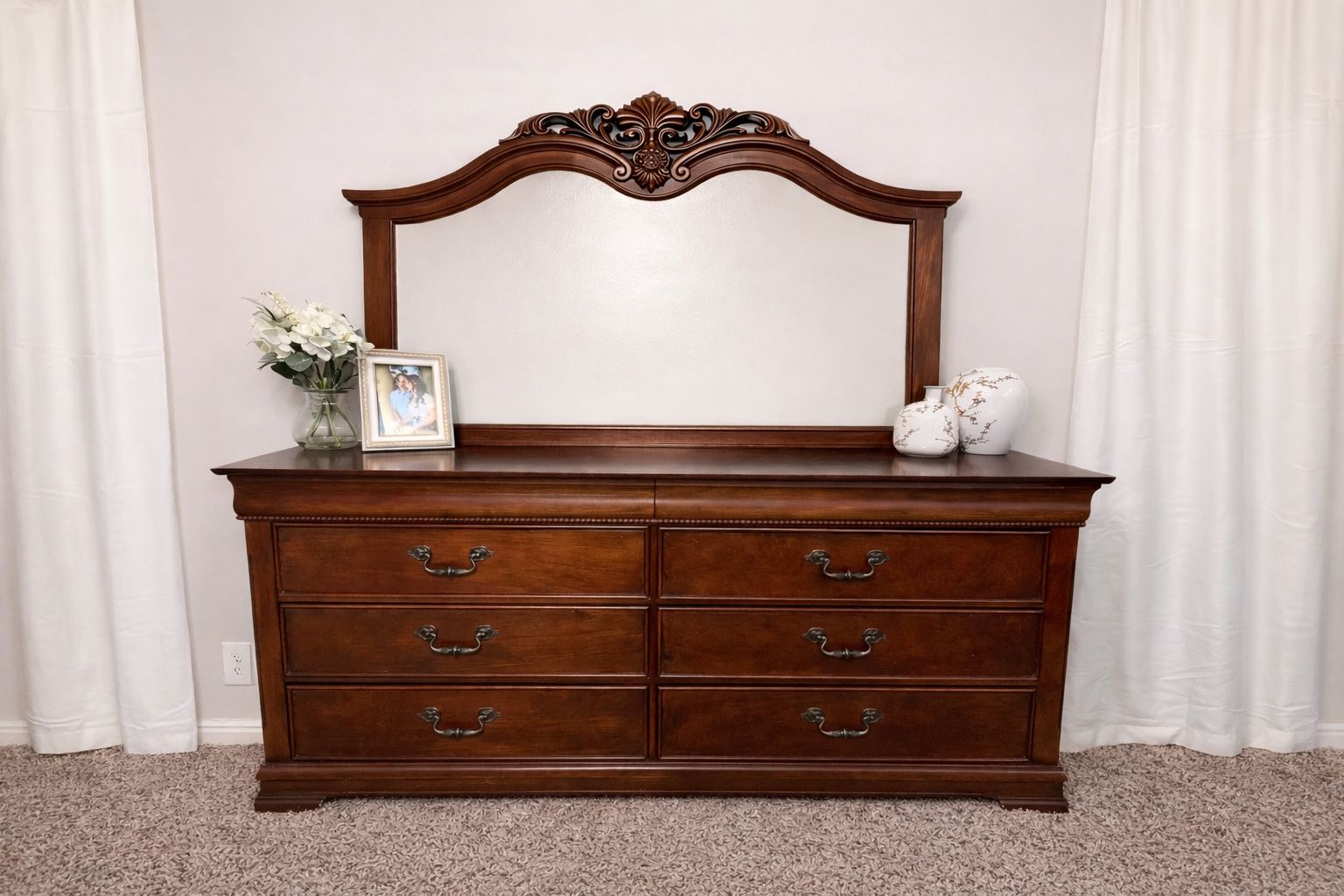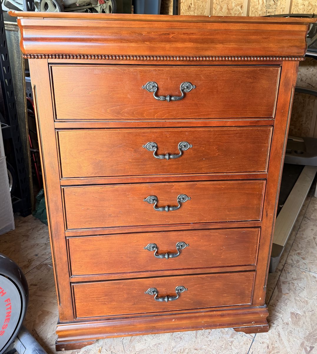 ZelleBeautiful matching bedroom set in a classic cherry wood finish. Everything is sturdy, well-built, and has a timeless look. We’ve loved this set — only selling because we’re upgrading to a new layout.
