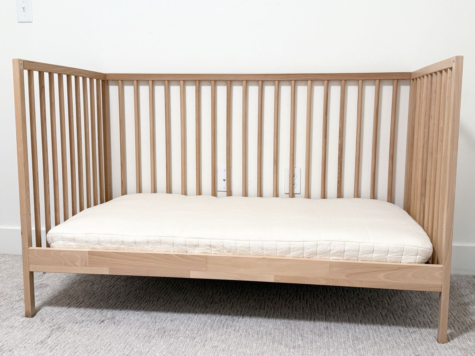 Natural wood crib with Avocado Organic crib mattress in beautiful condition. A very clean, timeless nursery piece with a simple modern design and high-end feel.