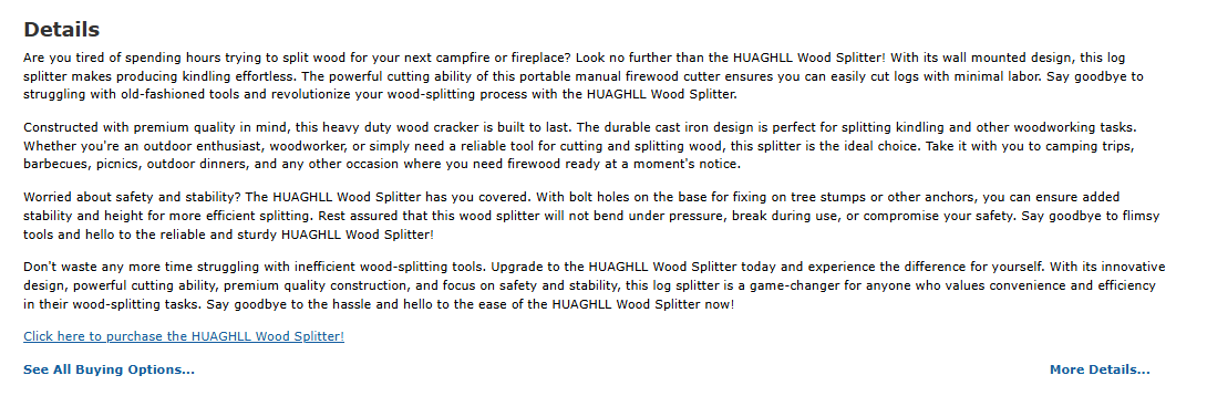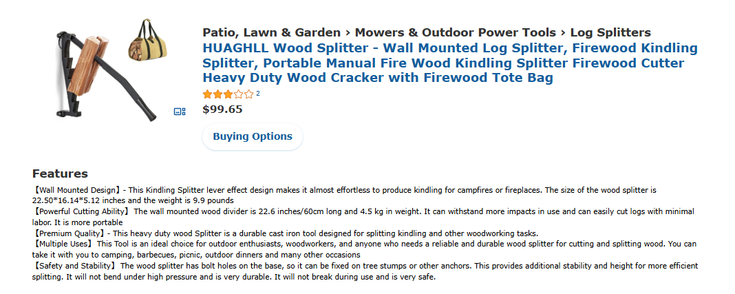 VenmoBrand new in the box HUAGHLL wood splitter. These are great for camping. It's mounts to a wall or tree, heavy-duty with long handle for better leverage.These are great for firewood and kindling. Great for home or camping and it comes with a tote to carry the wood.