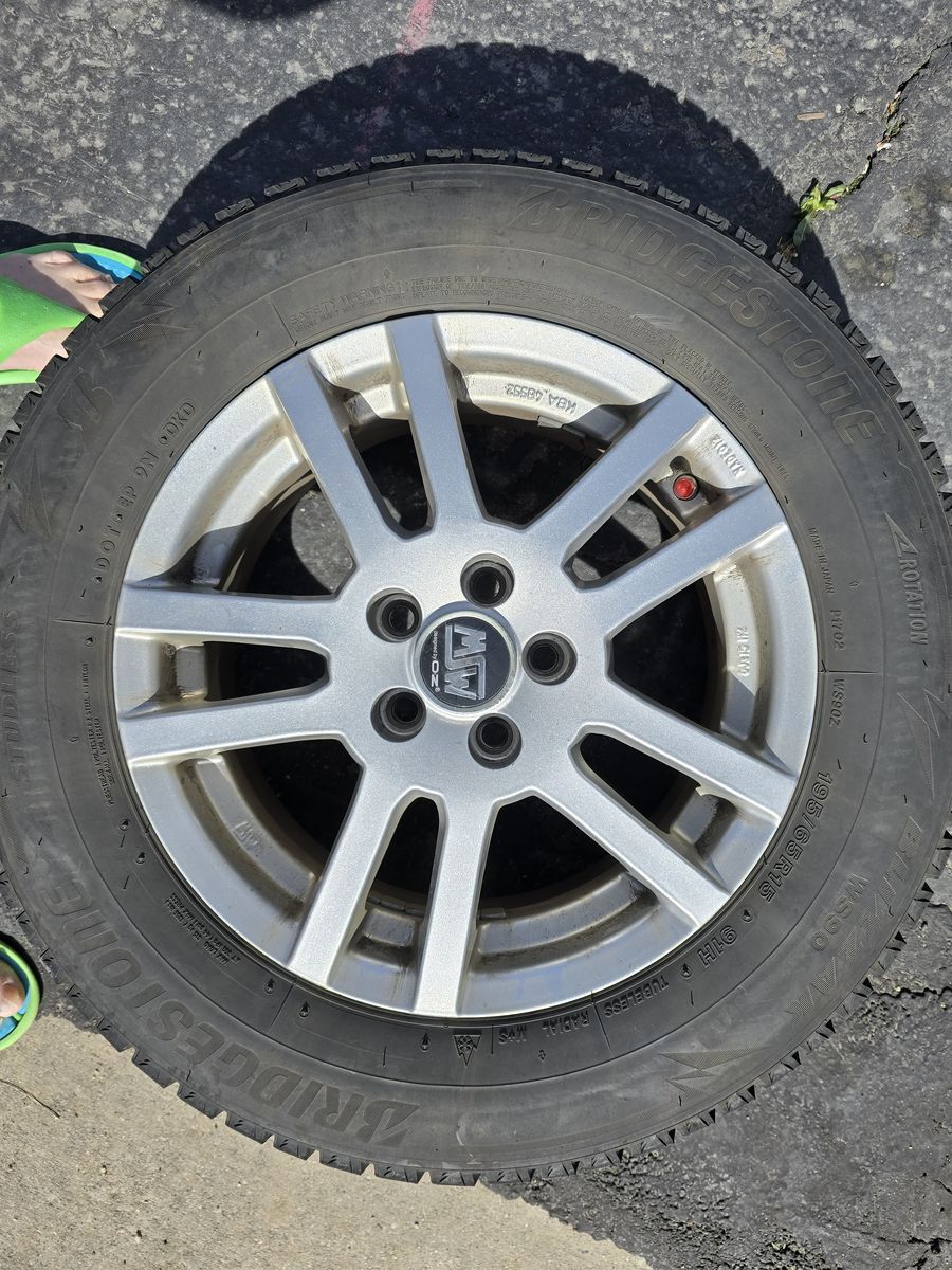 4 each 195/65R15 Bridgestone Blizzaks with MSW rims. Off of 2015 Prius. Retail $1100. Tread is very good per picture. Rims in very good shape. Great price !!!