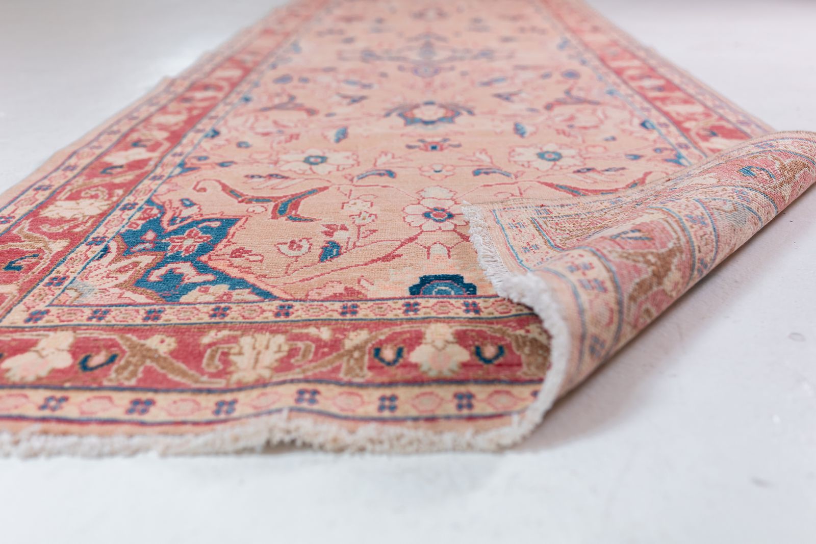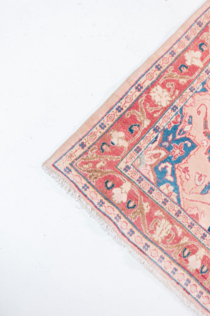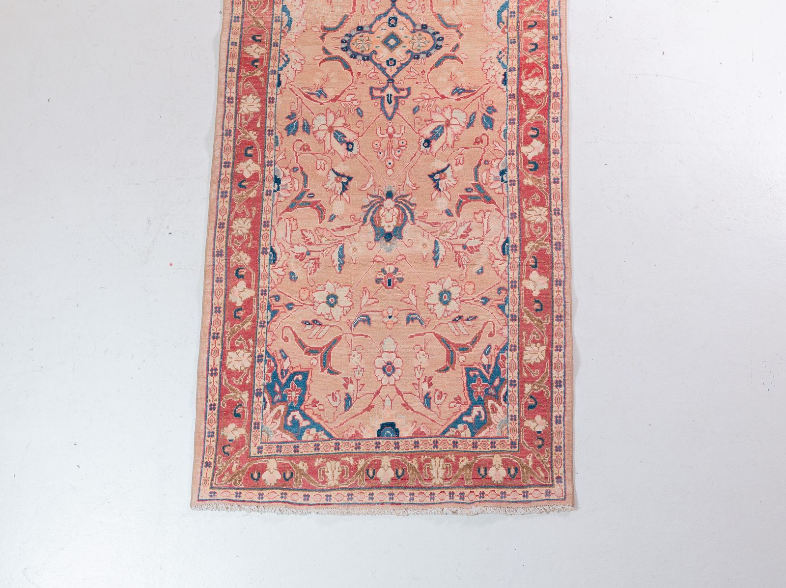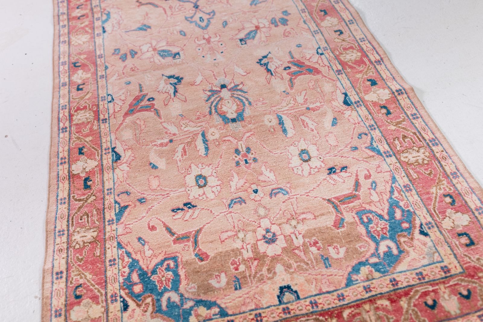 ZelleA soft and plush vintage Persian runner with muted hues of pinks and floral motifs. Tight knots throughout with a pronounced border that highlights the perfect symmetry of motifs throughout. Wool on cotton.