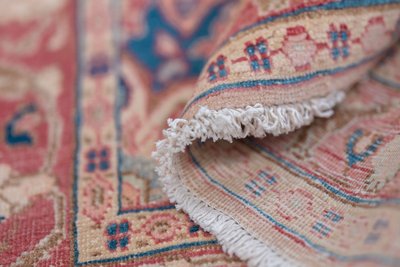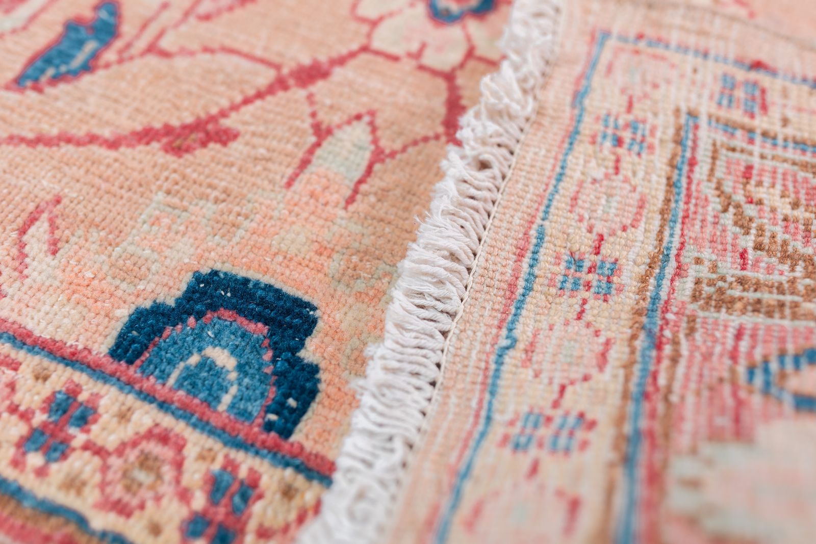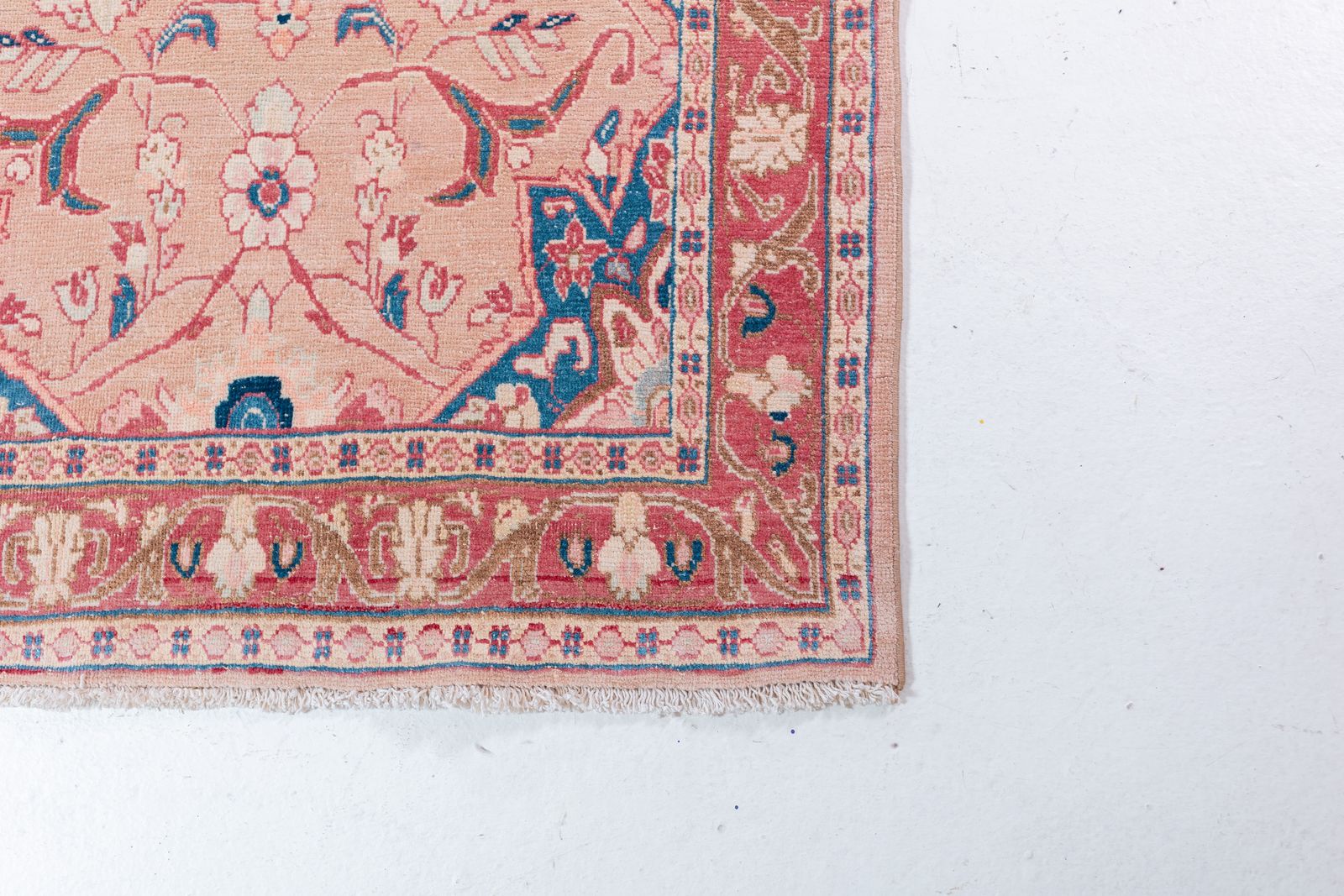 ZelleA soft and plush vintage Persian runner with muted hues of pinks and floral motifs. Tight knots throughout with a pronounced border that highlights the perfect symmetry of motifs throughout. Wool on cotton.