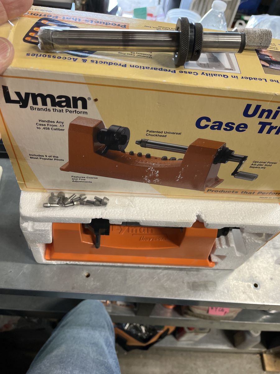 Lyman Universal case trimmer with the pilot set and the power adapter with the included hand crank cutter. This trimmer has the universal head that works with cases from .17 to .458 caliber. No extra collets or shell holders to buy. Very nice condition. Complete for only $60-10%=$54.00. Please see my other ads. Thanks, Joe.
