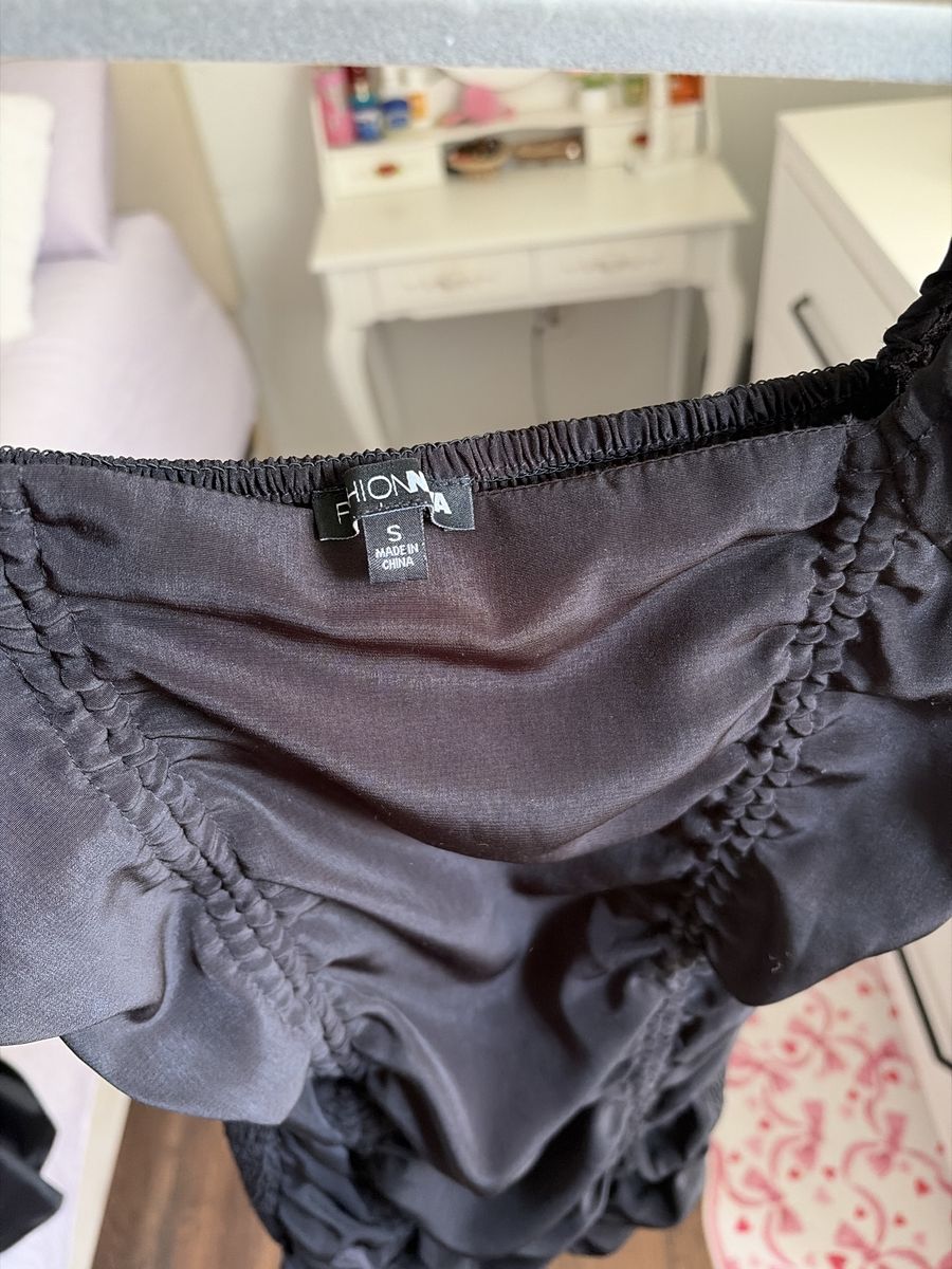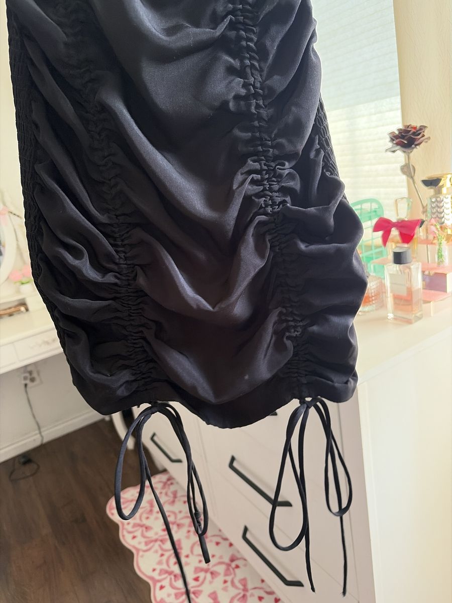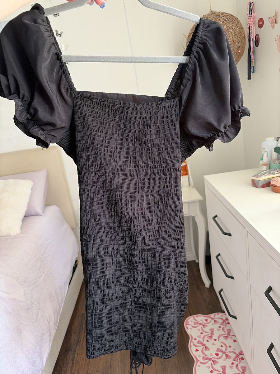 Black ruched mini dress with puff sleeves. Super flattering fit and stretchy. A size small from fashionova