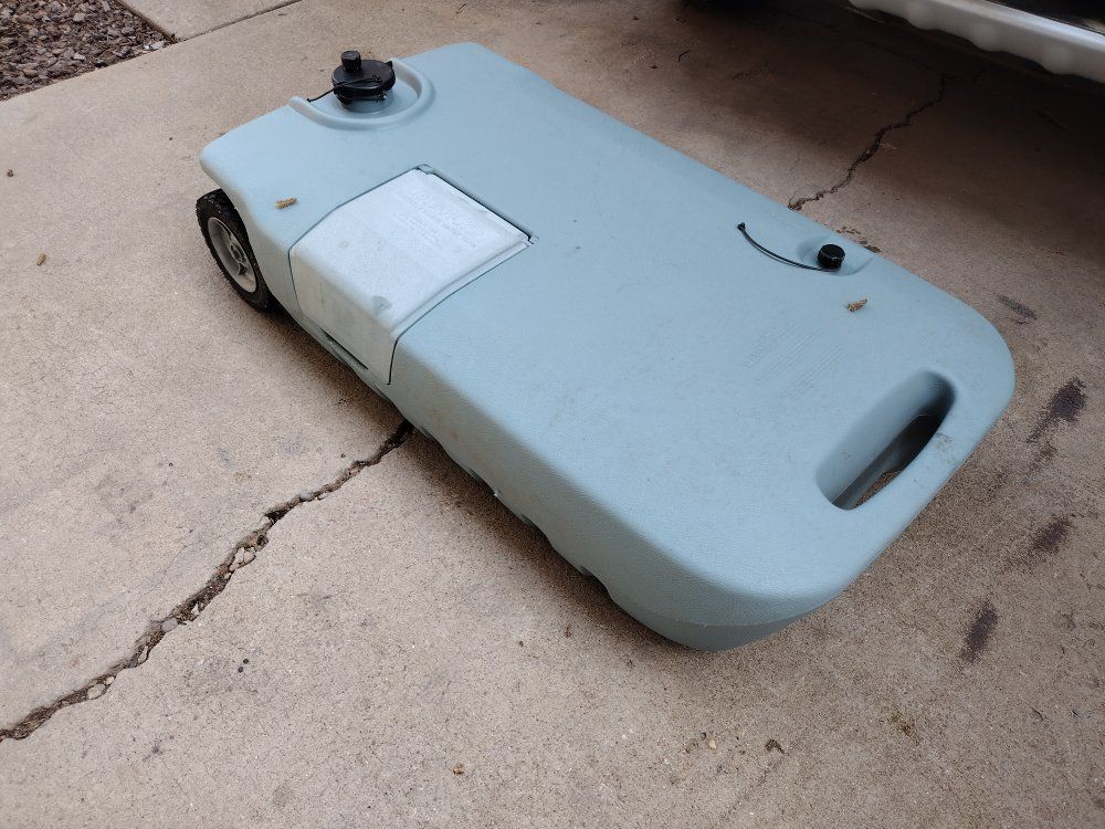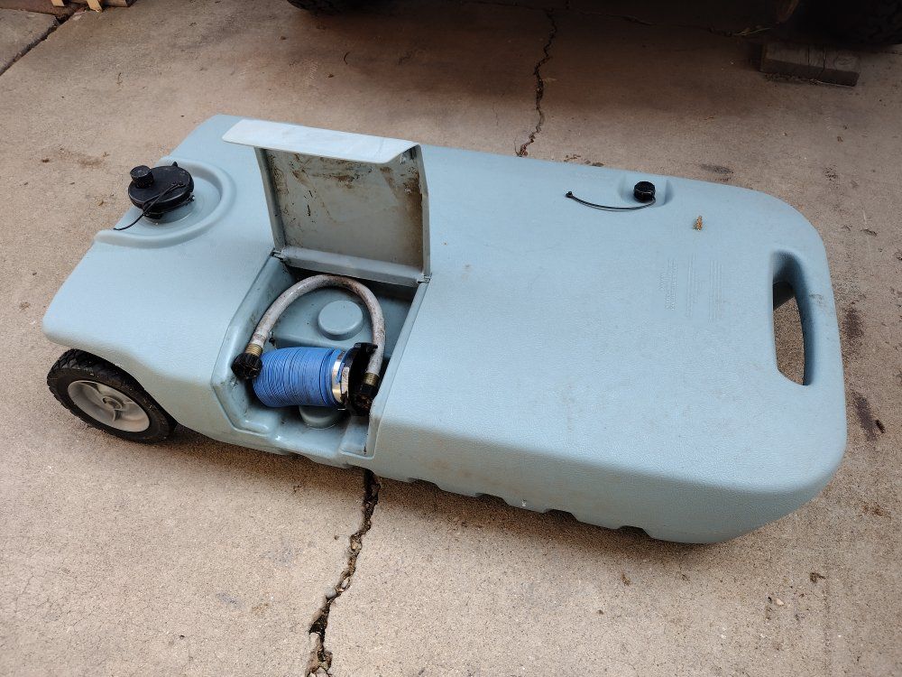Tote and stor portable sewer tank with wheels. Guessing it's a 30 gallon tank. It's in nice condition. Asking 85.00