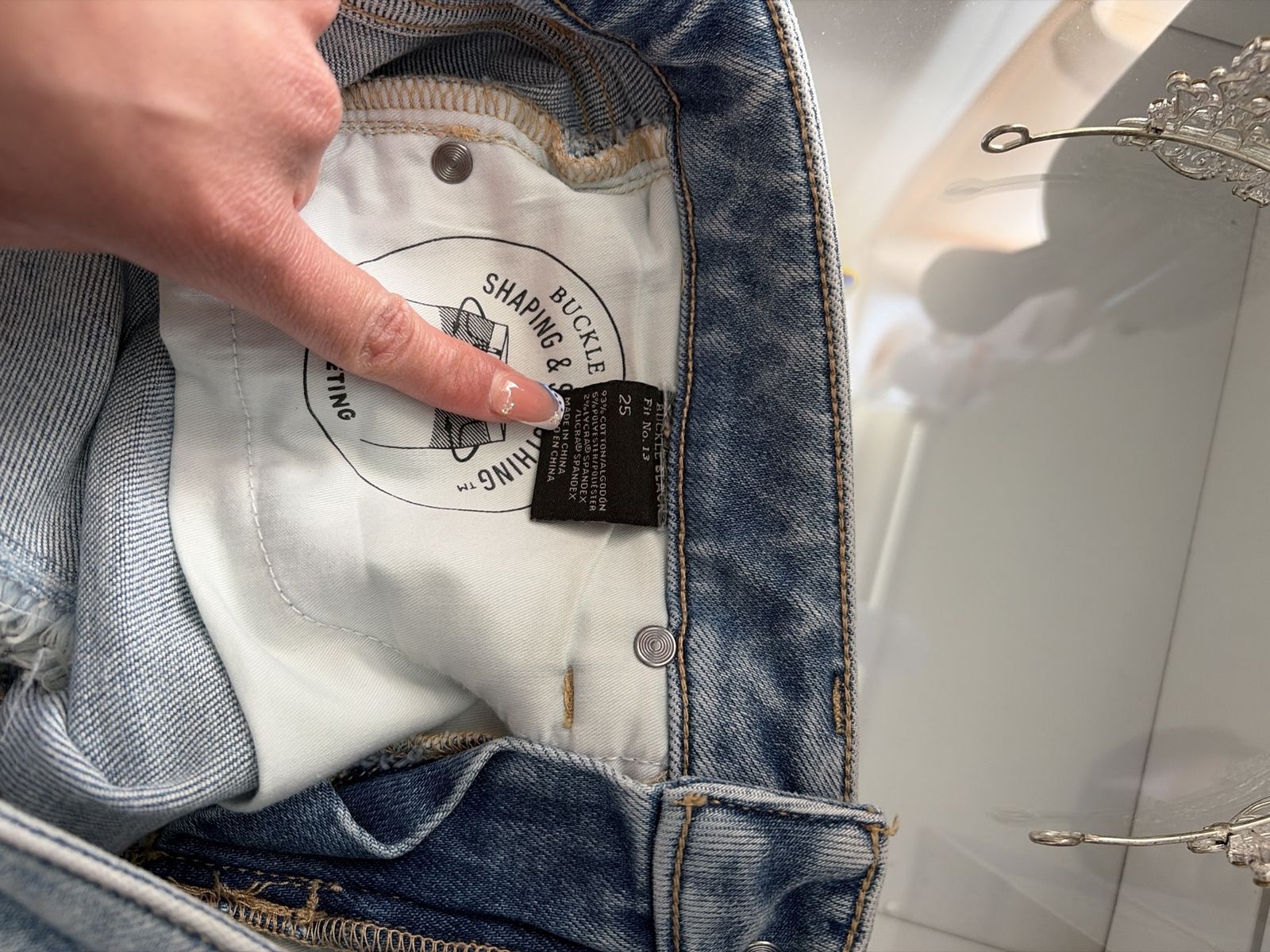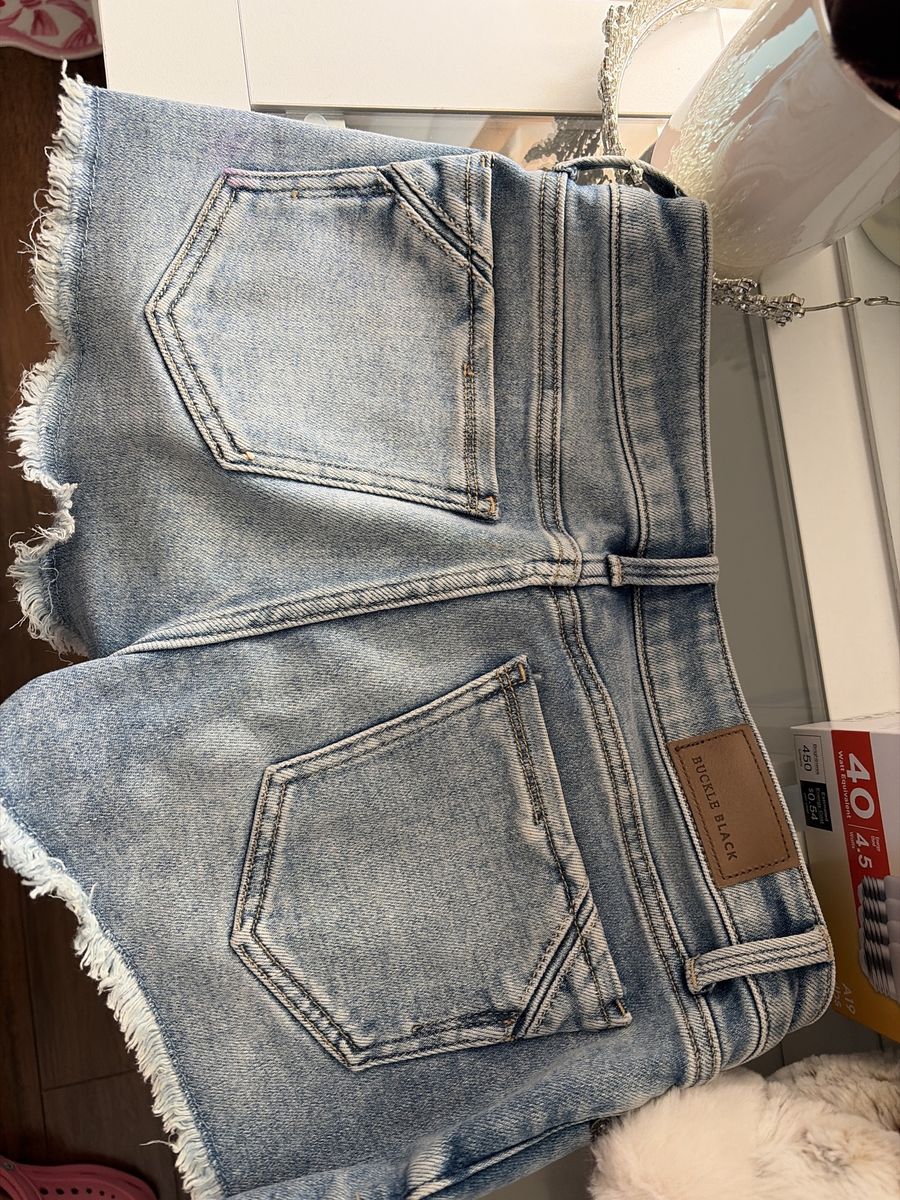 Brand new light wash buckle black short. They are distressed at the bottom and are short. A size 25 women’s.