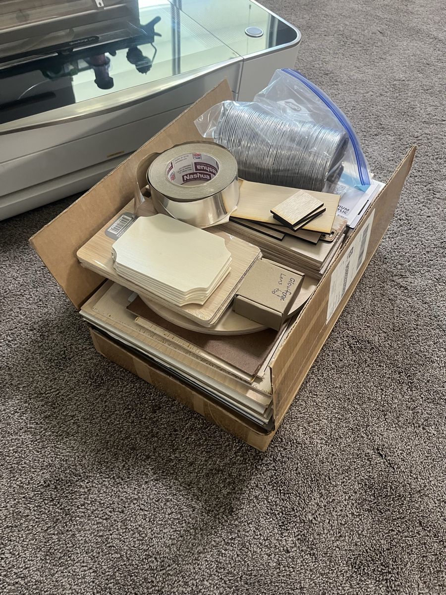 Includes original box, everything you need to get started and a box full of acrylic and wood that you can engrave.