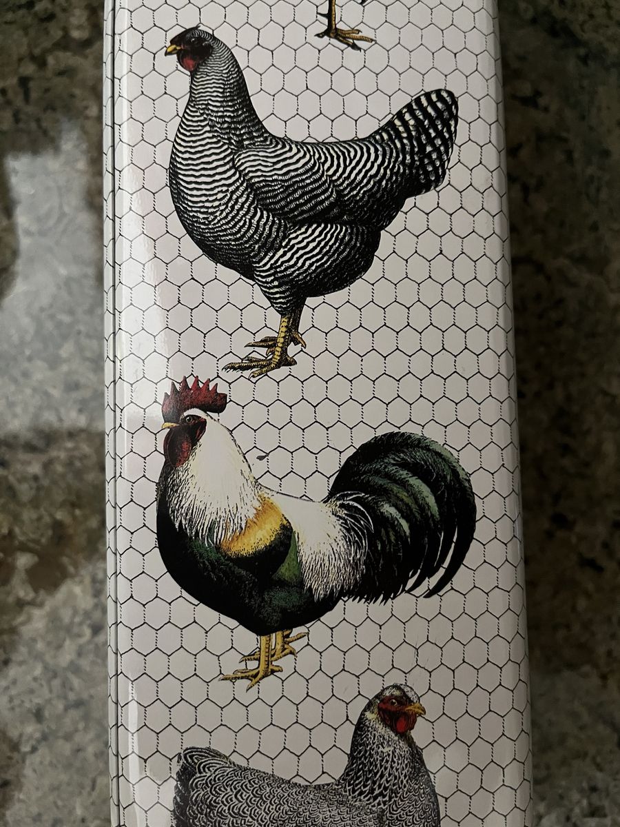 VenmoI used these two great display pieces to stage a home. They are Both in excellent condition. The rooster tin is 12 inches tall x 3 1/4 inches wide x 3 1/4 inches deep. There are six different types of roosters/chickens, and each side of the tin shows different ones. There are many colors in the birds like white, black, red, gold, orange, green and blue. The bottom of the tin says Chicken Coop. The glass spaghetti canister I picked up in London. It is very fun and unusual. This is in excellent condition. It is not a white, but a soft cream color with black lettering. The name is quite funny Mrs. Winterbottoms! On the bottom of the canister it is printed Butlers. This has a great fitting lid. This measures 12 1/2 inches tall x 4 inches wide x 4 inches deep. You can buy one or both. These are separately priced, the tin is $15.00 and the England spaghetti glass canister is $25.00. If you love both you can buy both for $35.00 Prices are firm.