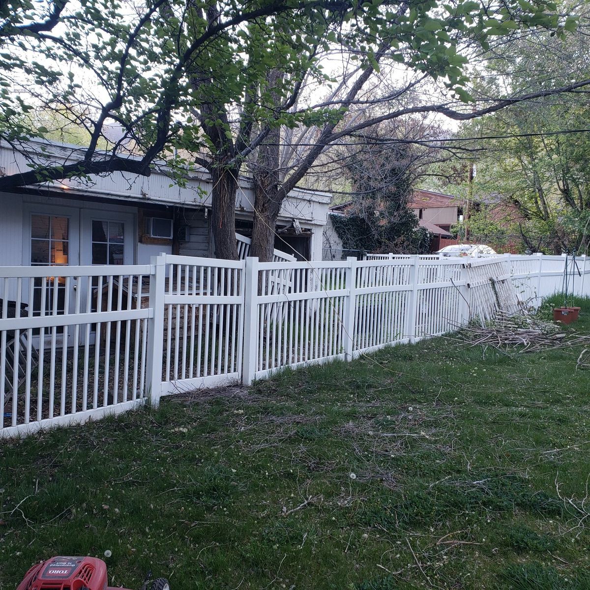 Need this vinyl fence removed. its your for a good deal if you remove it. You must pull out the posts that are set in concrete. It is about 100 ft total length.