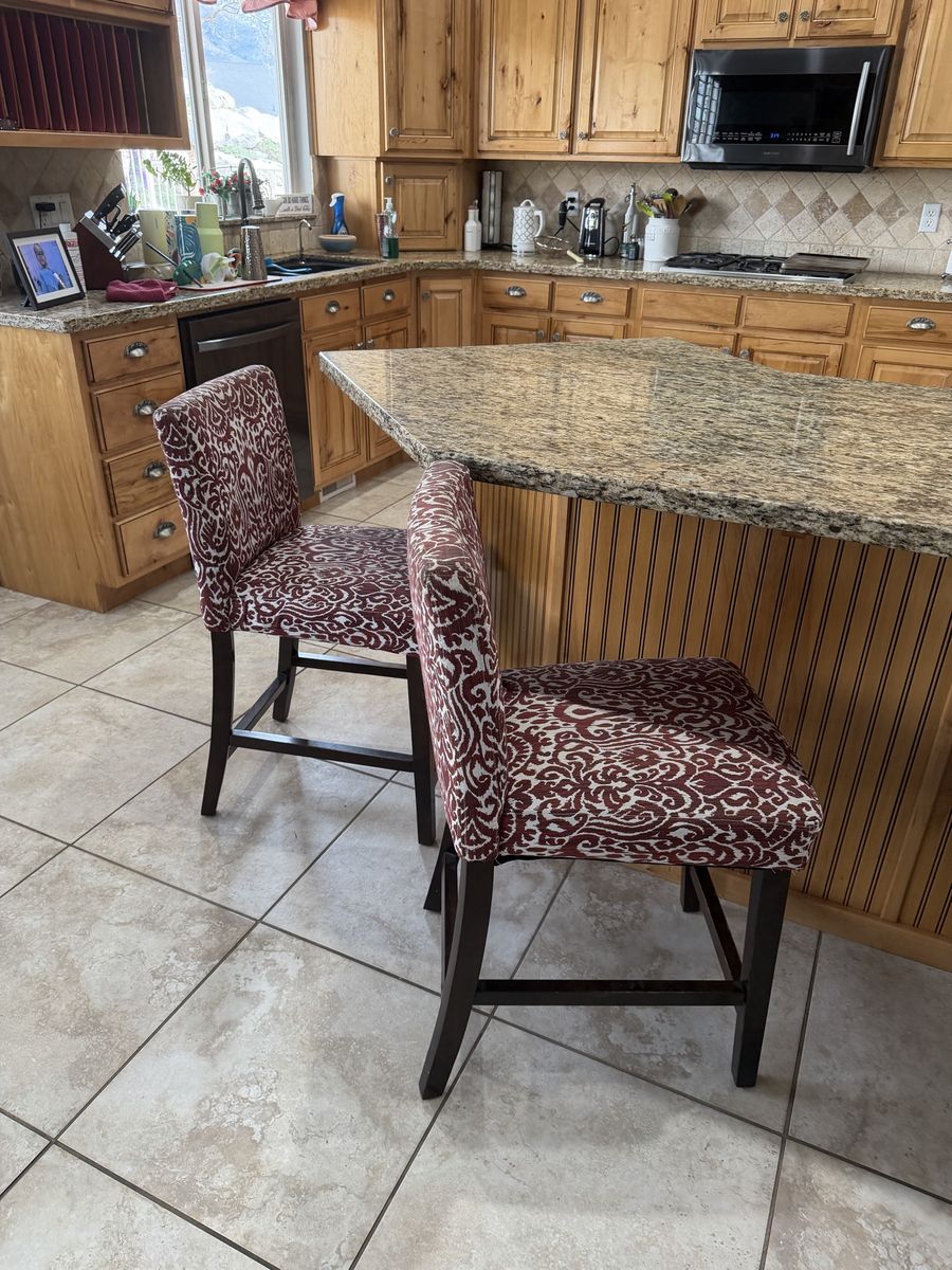 PayPalBeautiful set of 4 fabric rustic red and cream bar stools , the floor to the back of the top of the back of chair measures 37 inches, the floor to the top of the seat measures 24 inches , excellent condition, no tears from a smoke free home.