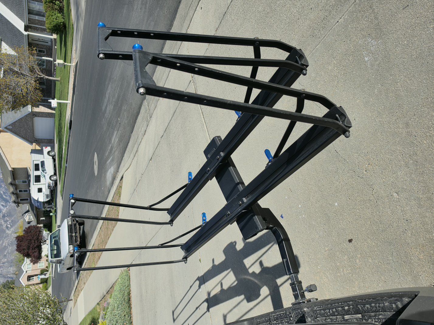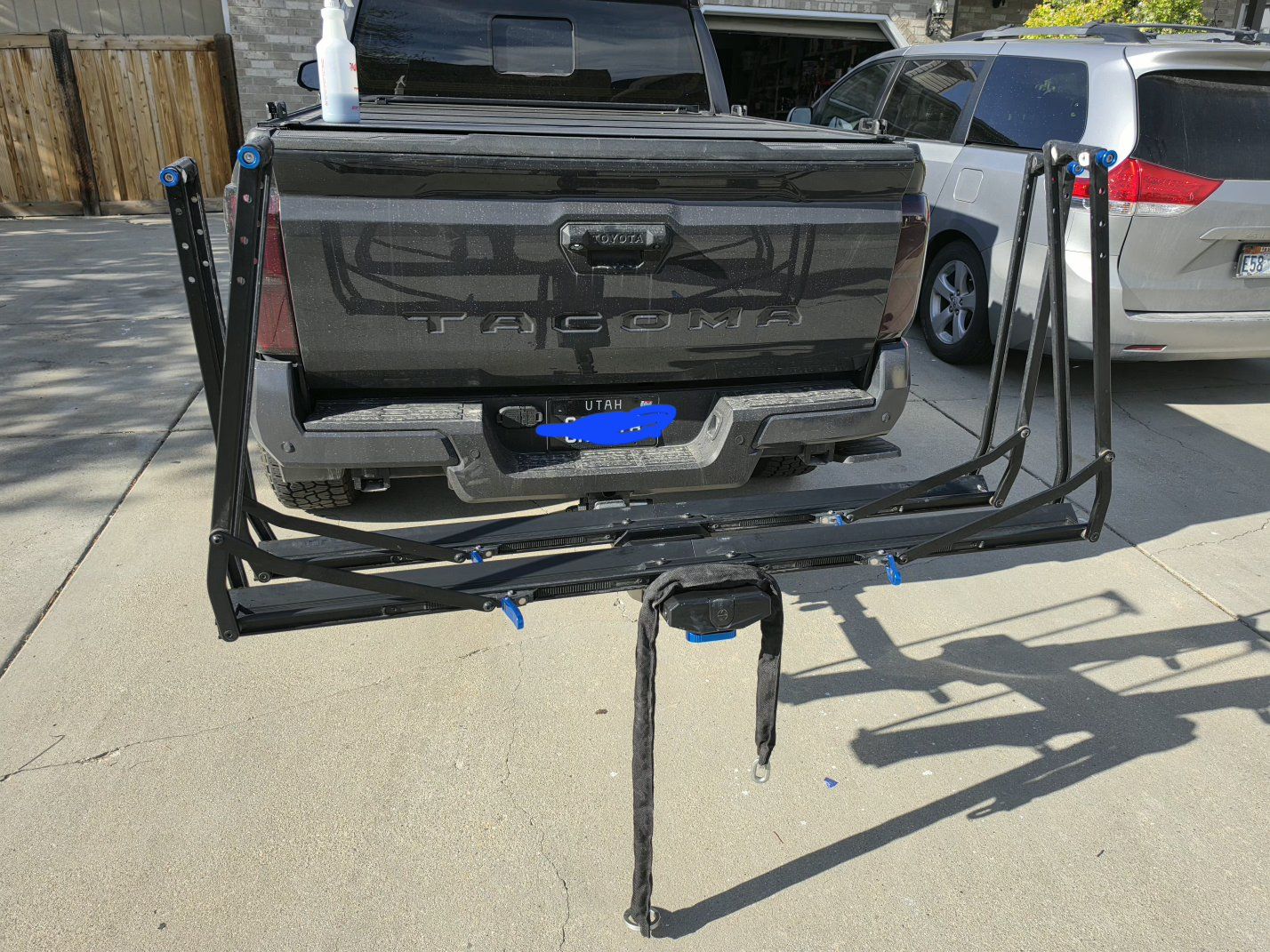 Carries 2 bikes, up to 60 lbs per tray (120 lbs total). Expandable to 3 bikes up to 45 lbs per tray, with Add-On (2" Only) Bike can be loaded asymmetrically to eliminate handlebar interference No contact with frame or fork, secures bicycle by contact with tires only Carries 19mm road tires up to 3.0” wide mountain bike tires, and diameters from 20” to 29” Compatible with bicycle wheelbases from 36” to 55” Folds flat against the vehicle, and tilts down 30 degrees to allow for hatch access Available for 1.25” or 2” Class II or higher hitch receivers Utilizes RockyMounts premium 3-axis anti wobble system Included 10mm square link chain provides best in class security Not for use with fender equipped bicycles Rack weight 49 lbs (shipping weight 61 lbs) Fit Memo- For cargo vans a fit check is required. Depending on hitch manufacturer, handlebar width, vehicle wheelbase, and accessories an 8" Hitch Extension may be required for handlebars to clear the door.