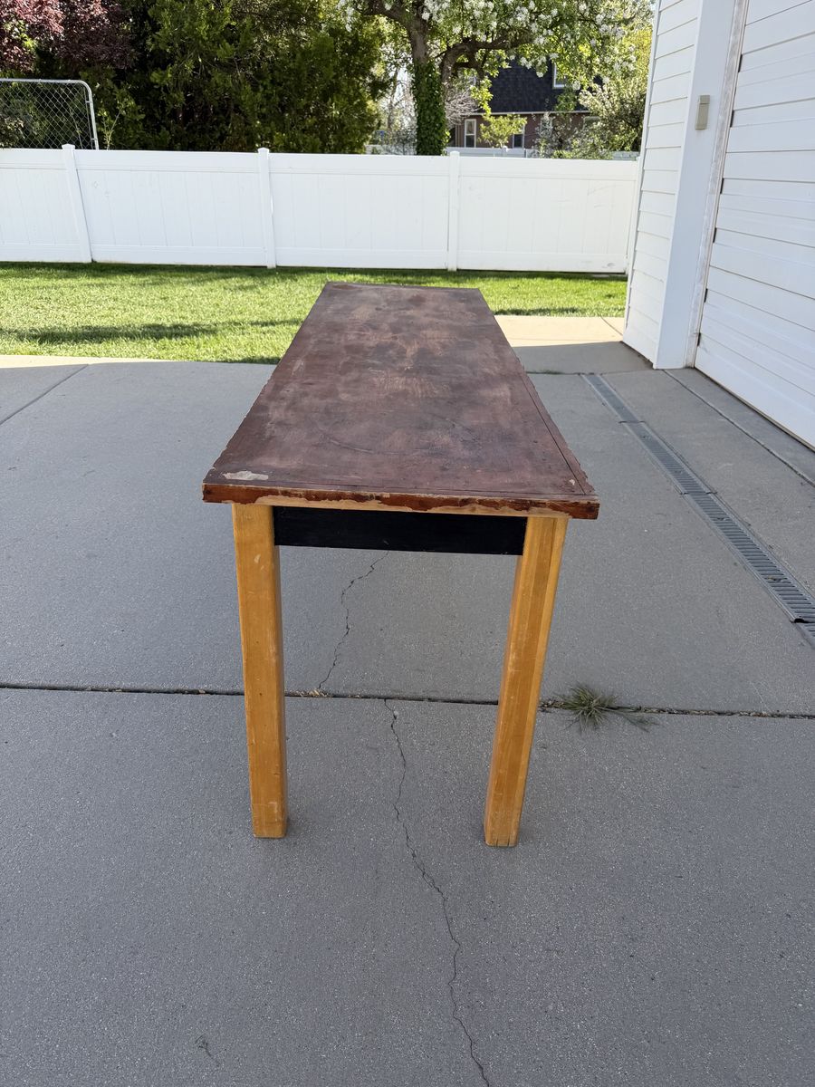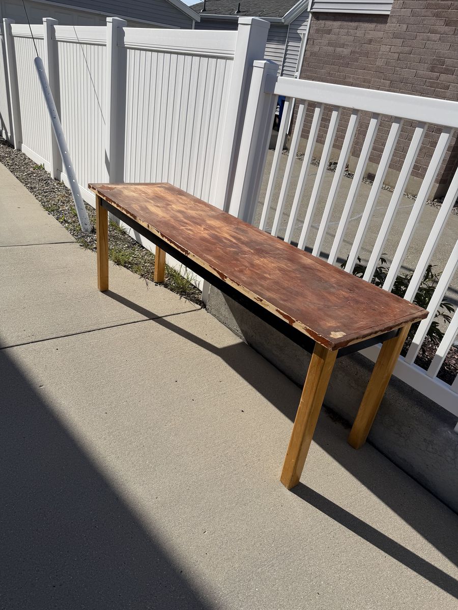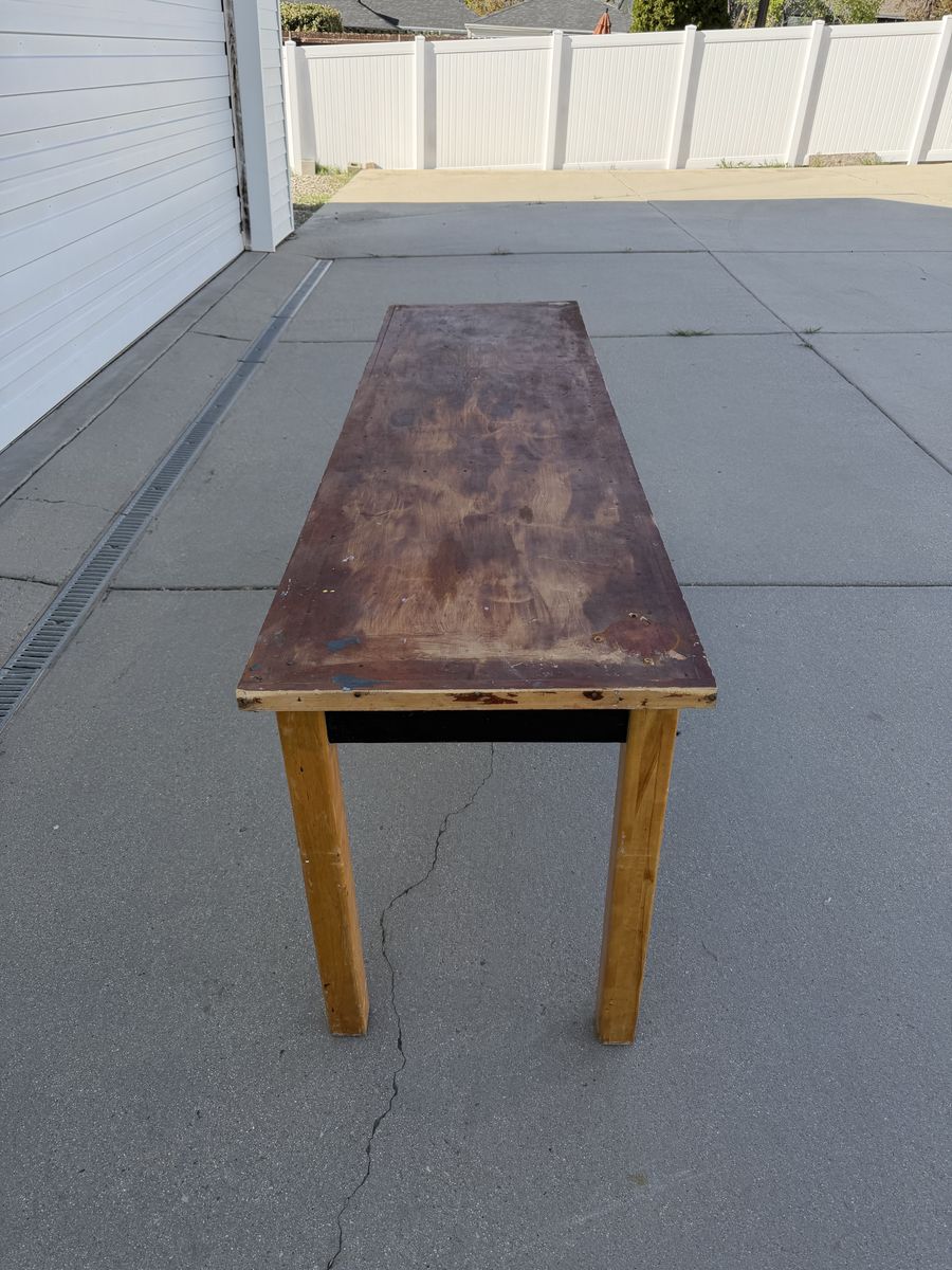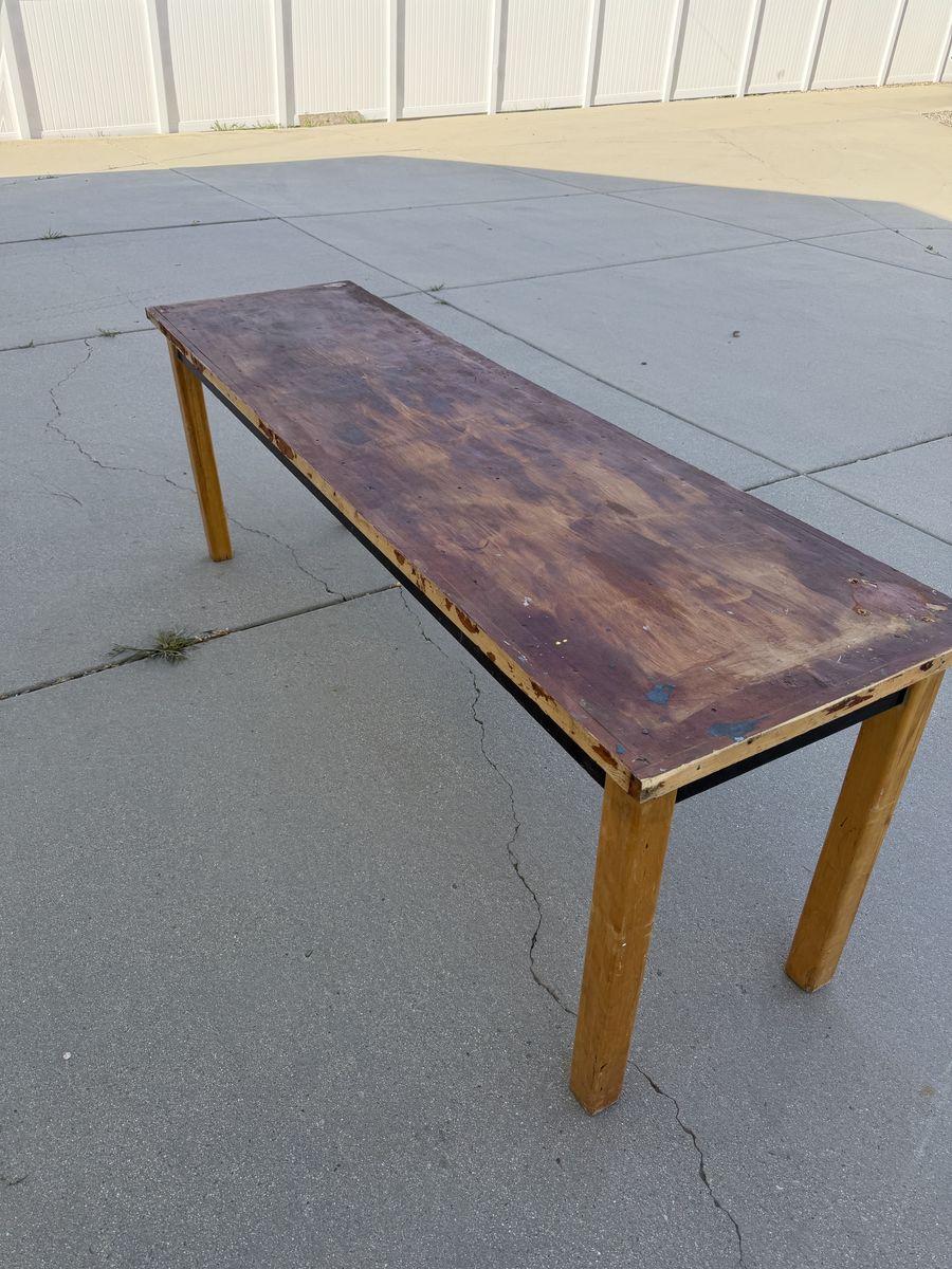 We've had this table in our garage for years and we don't need it anymore. It's sturdy and was previously used as a work bench. It wouldn't be able to handle super heavey loads but could handle a decent project/load. It measures 72 " x 24" and is 30" high.