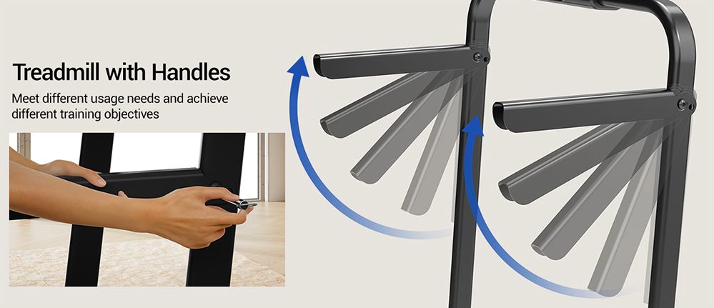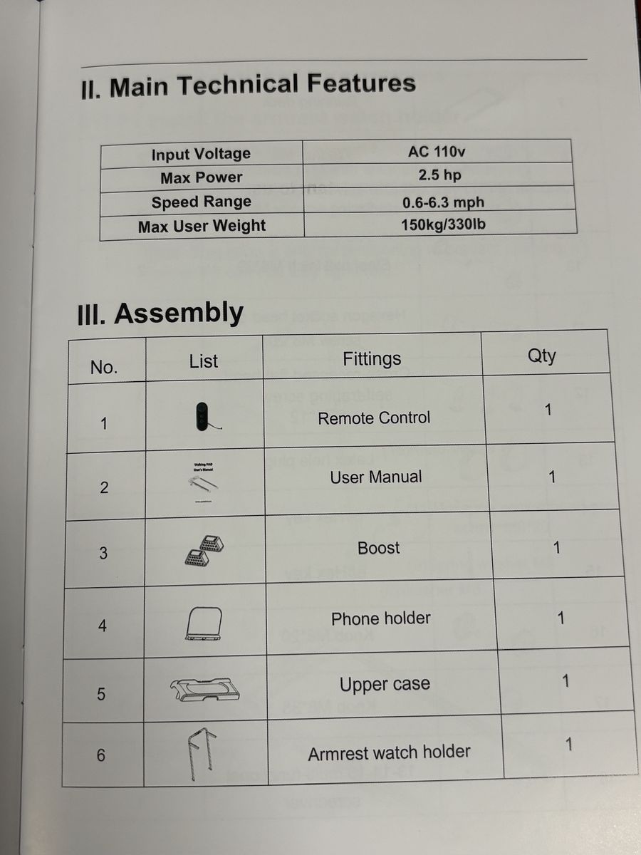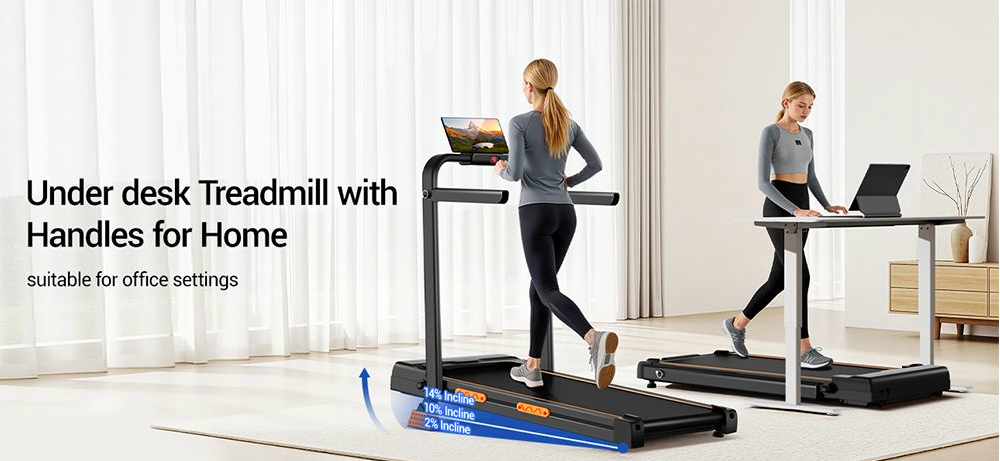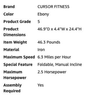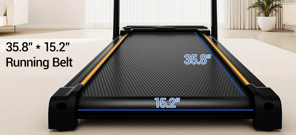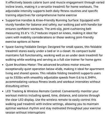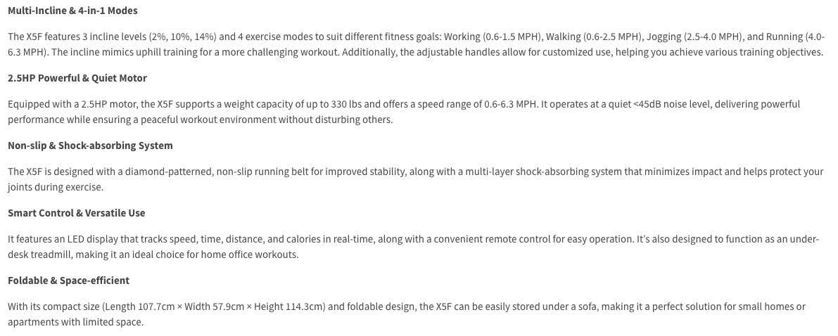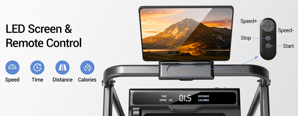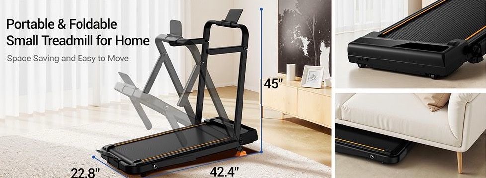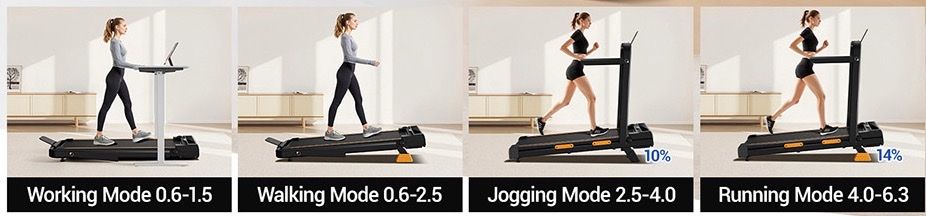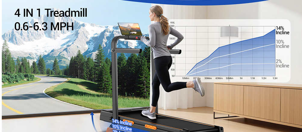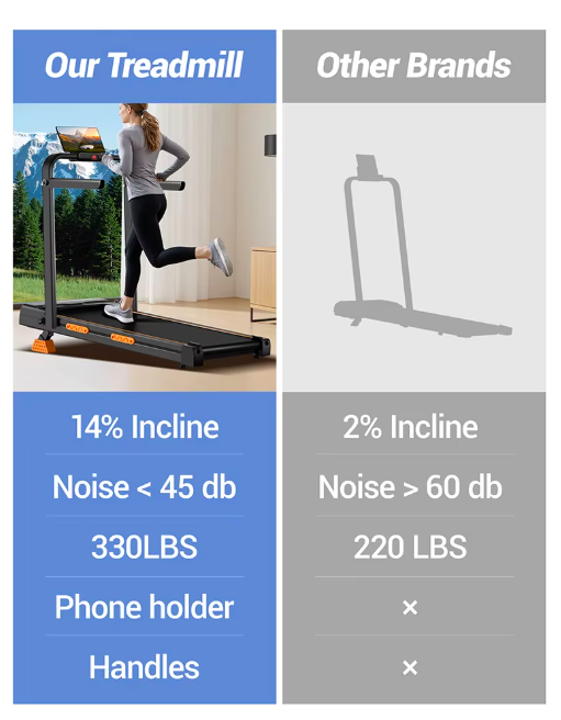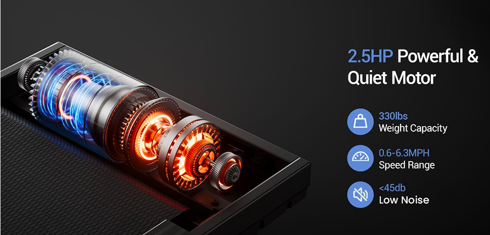 Foldable to store in a small space, 3-level adjustment for up to 14% incline, quiet 2.5 HP motor with 6.3 mph max. speed, 330 lb. maximum capacity, and remote control.