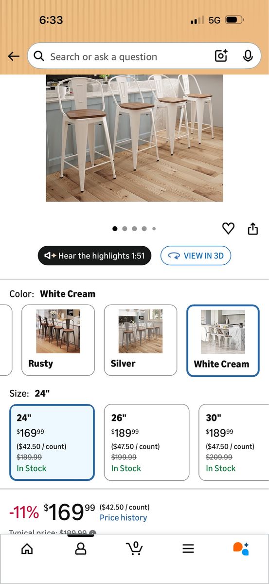 VenmoFarmhouse Swivel Metal Bar Stools - Set of 4 Counter Height Stools (24”) - High Back Bar Chairs - White Cream - $170 new on Amazon