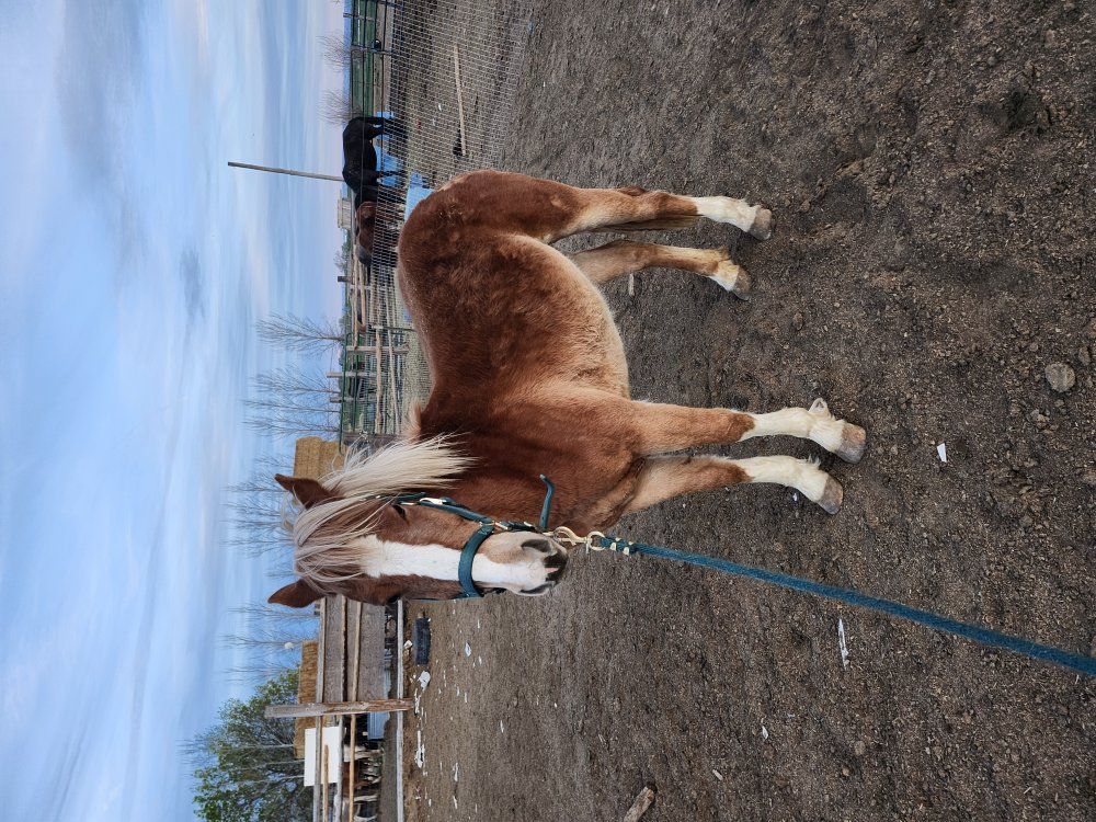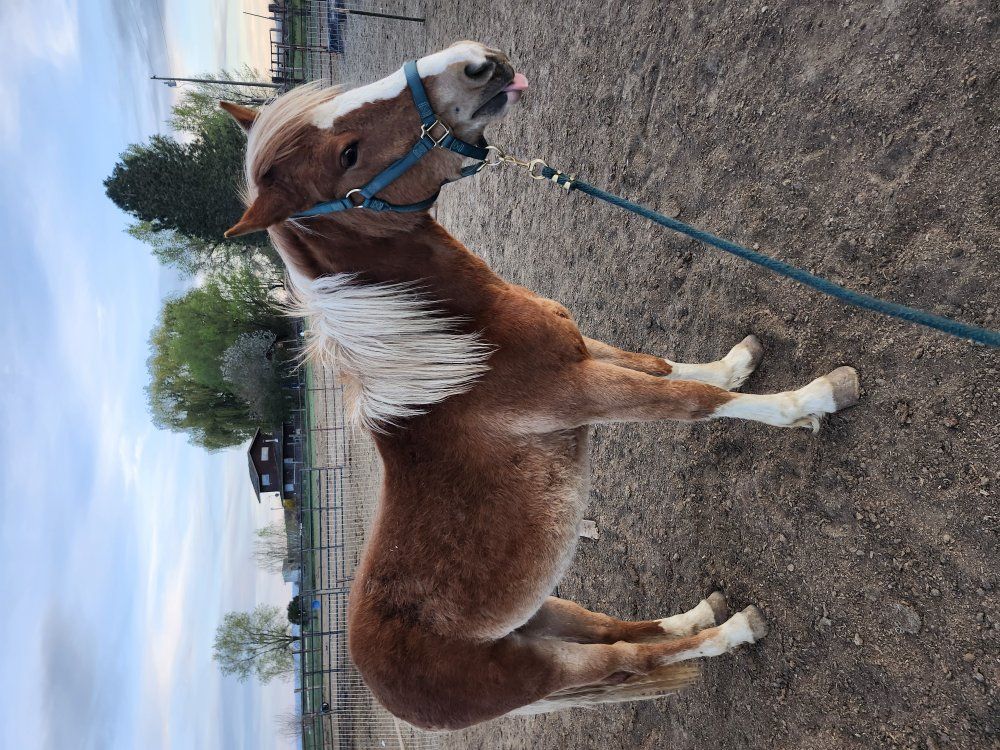 Tipsy is looking for her new home. Will be 2 in July she is halflinger quarter horse cross. Should mature around 14h. Halter broke can pick up all feet.