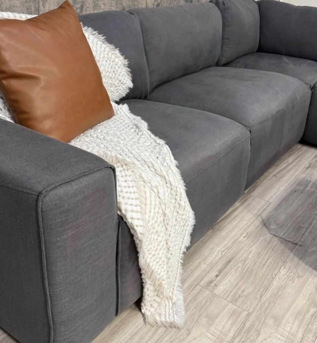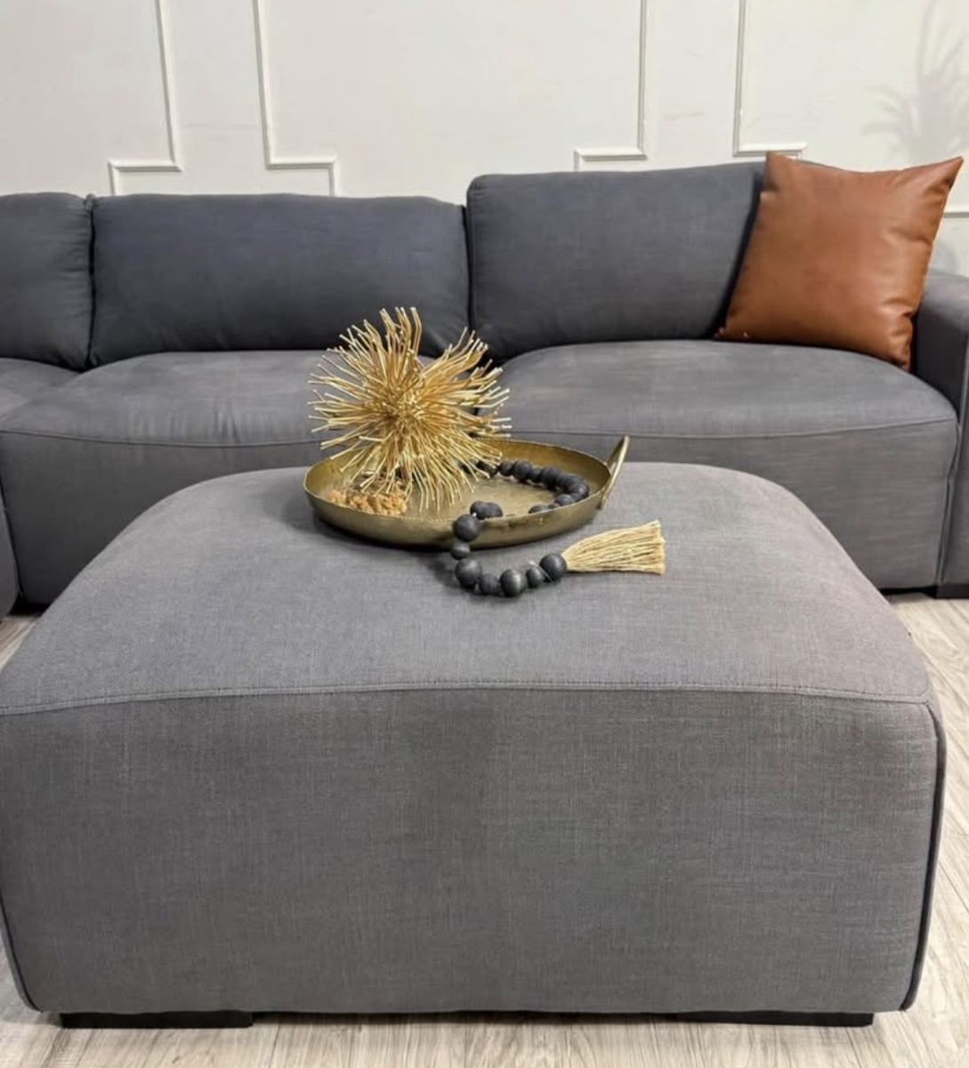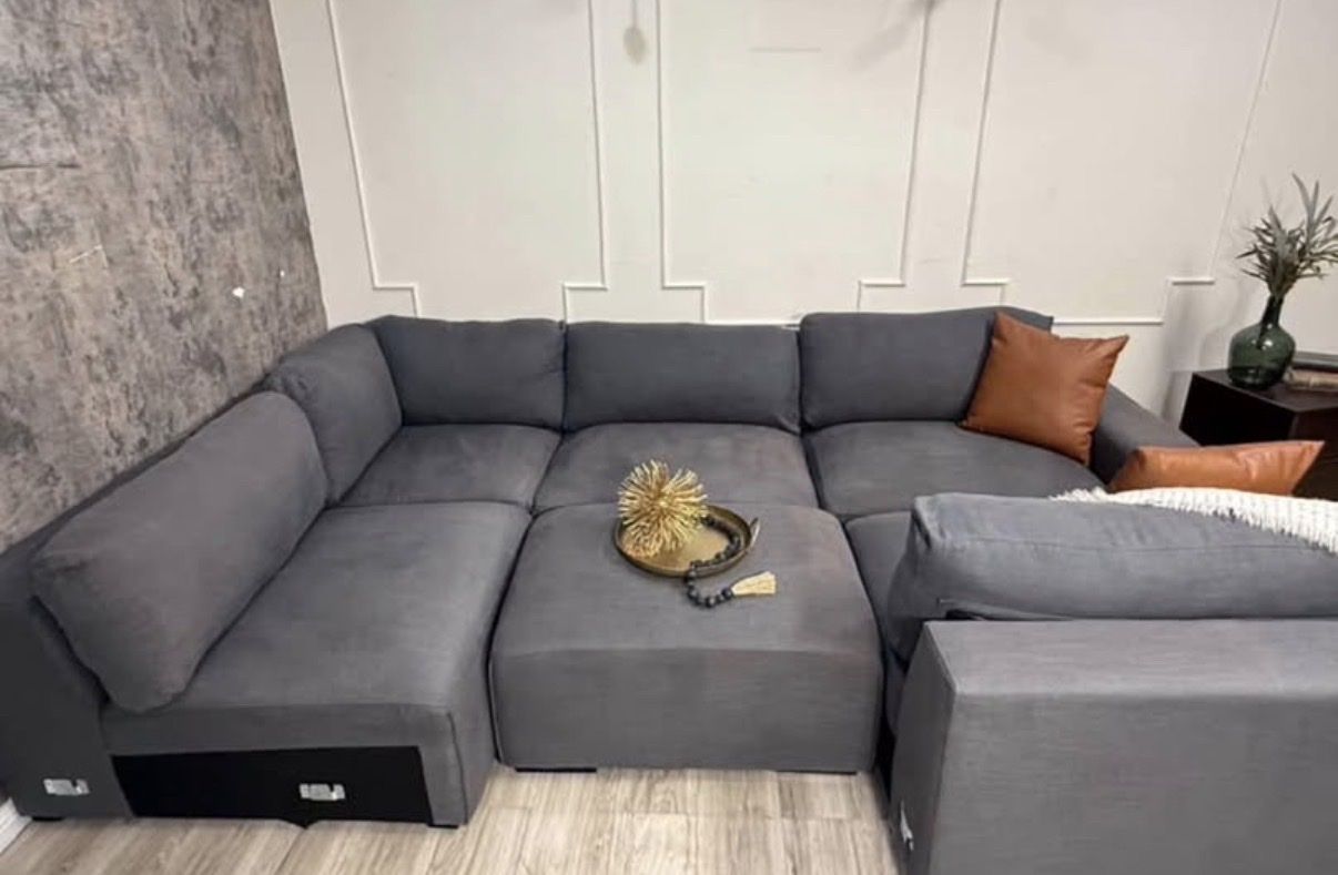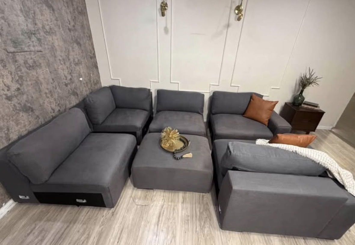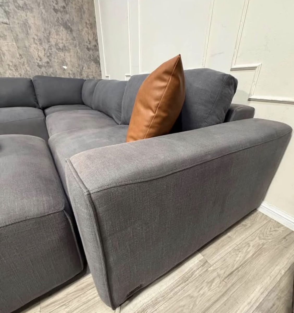 This is a fabulous ABBYSON modular sectional. Color is charcoal grey, material is fabric. Has a linen feel to it. All pieces hook together but it can be reconfigured as desired. You can even make a fun bed for movies and lounging. Back rest cushions are removable and washable.