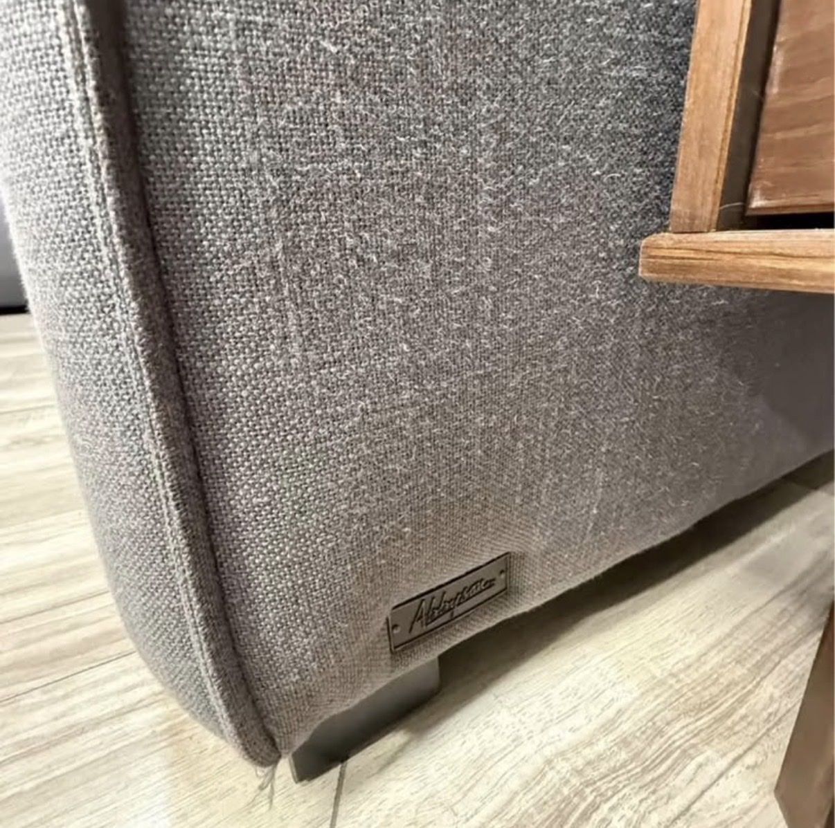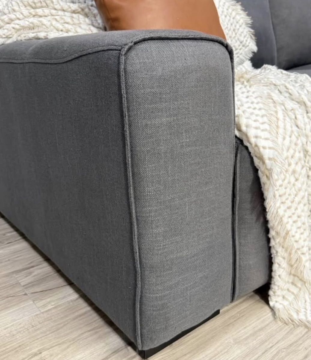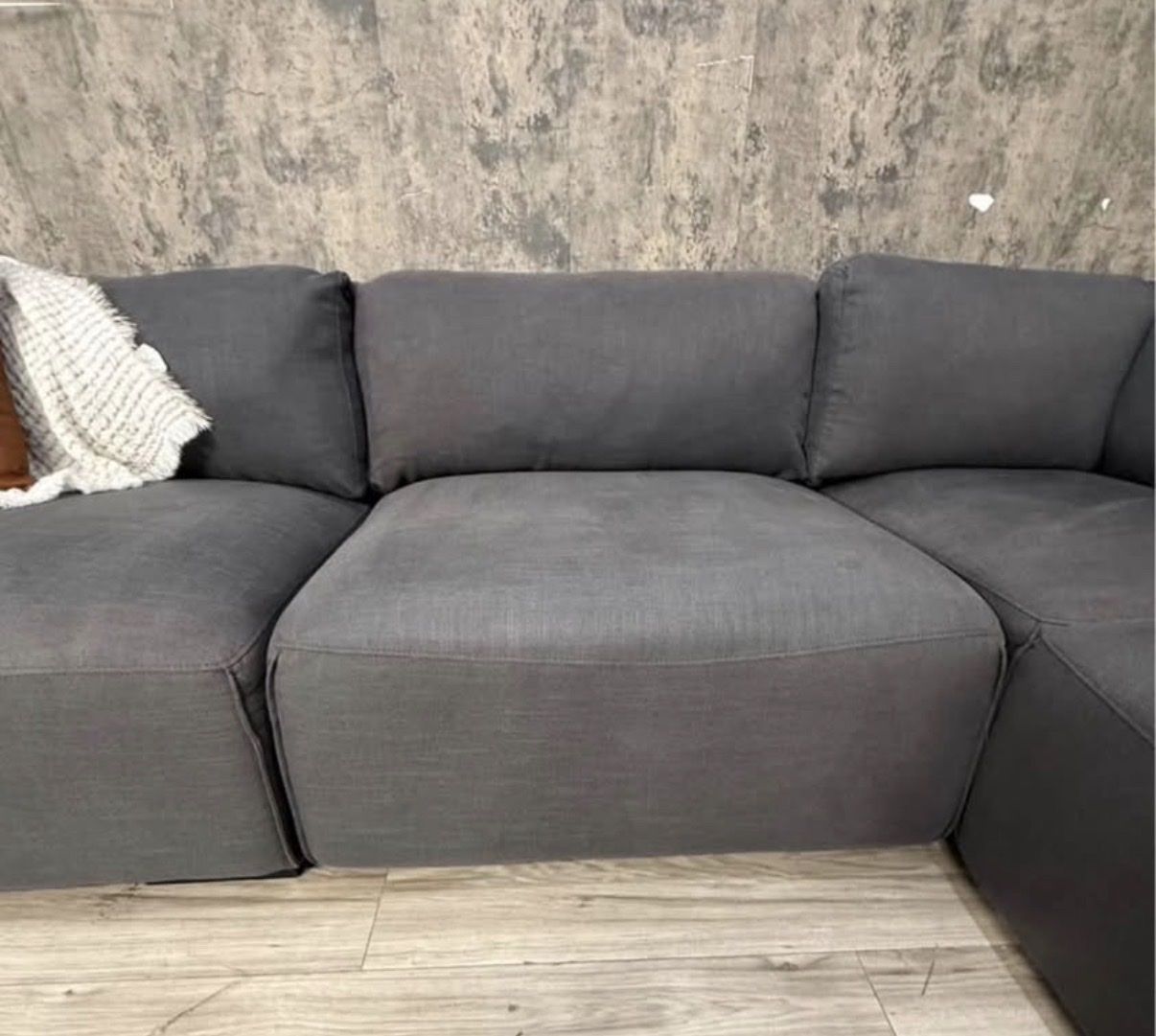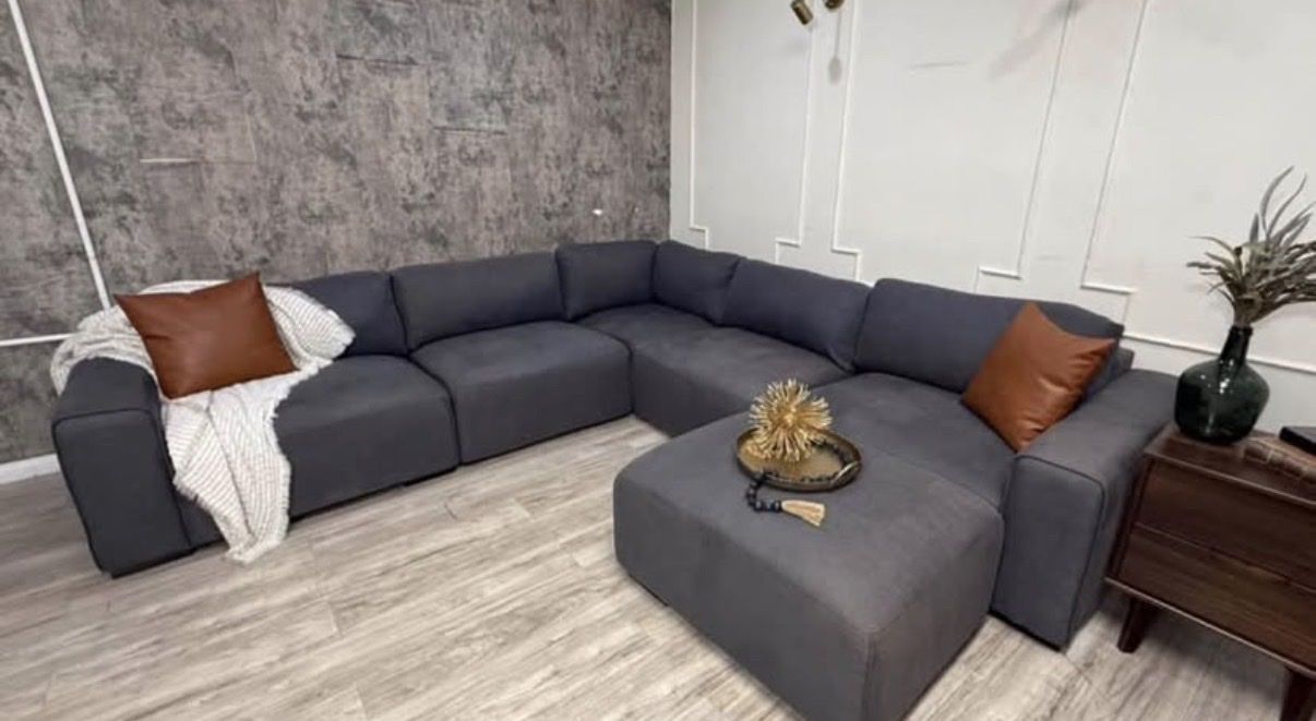 This is a fabulous ABBYSON modular sectional. Color is charcoal grey, material is fabric. Has a linen feel to it. All pieces hook together but it can be reconfigured as desired. You can even make a fun bed for movies and lounging. Back rest cushions are removable and washable.