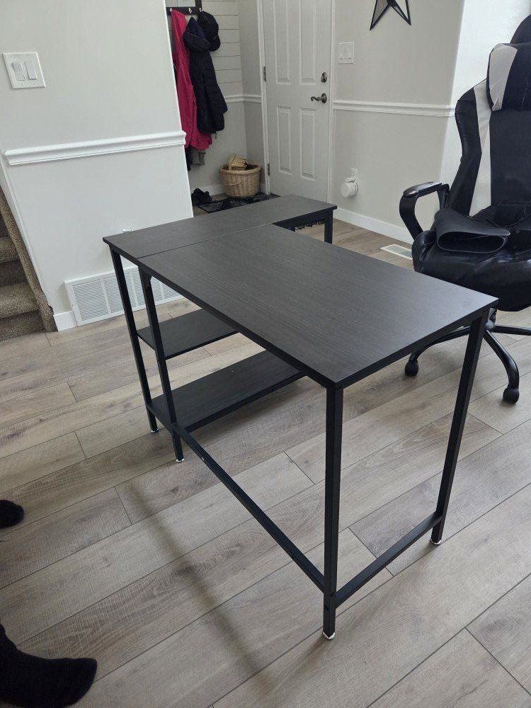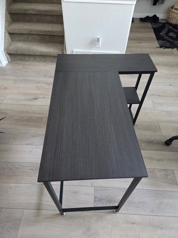 brand new condition. has shelves 38.5 inch long x 17.5 inch deep for desk part. L shape is 28.5inch long.